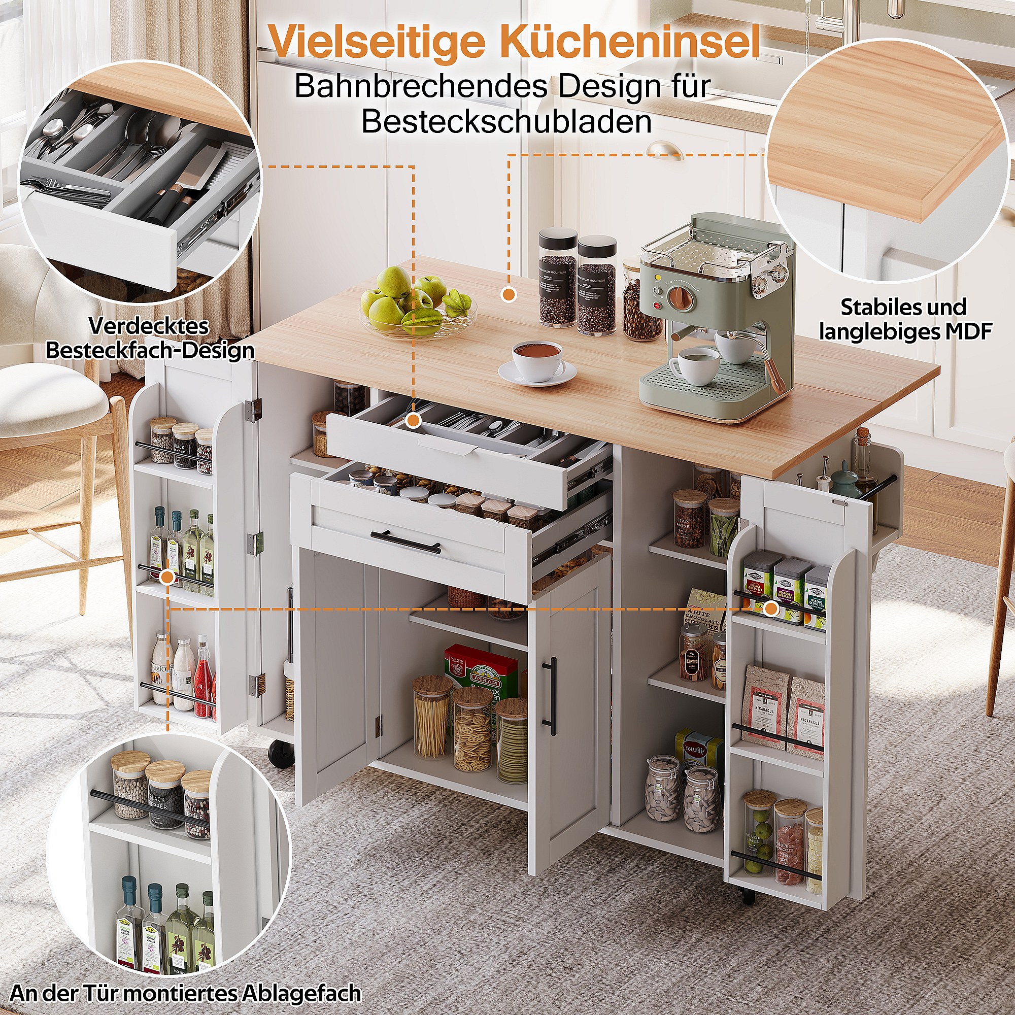 Îlot central extensible avec roulettes - 120 x 40/60/80 x 95 cm - avec 2 portes + 3 tiroirs - MDF + Métal - blanc