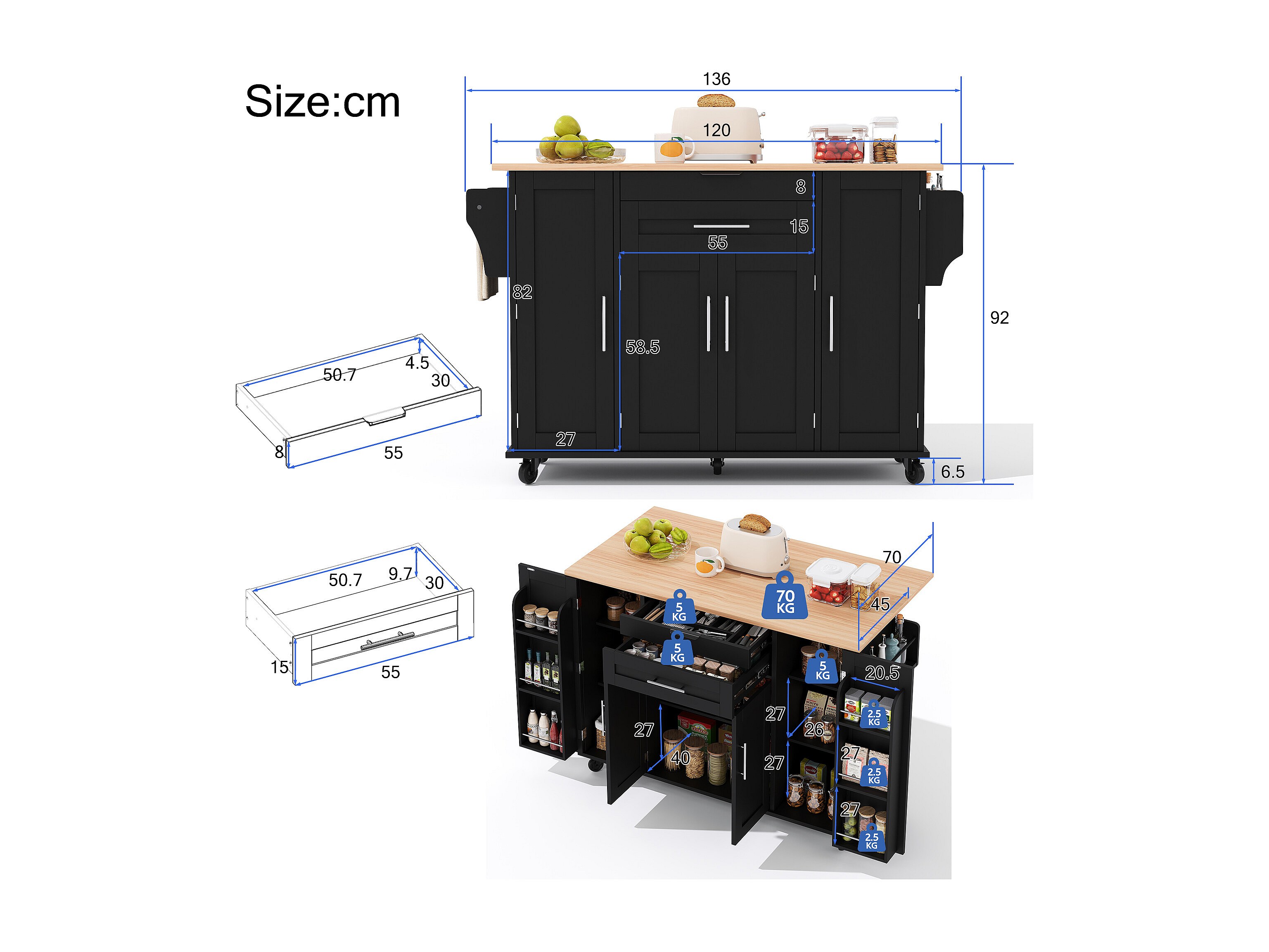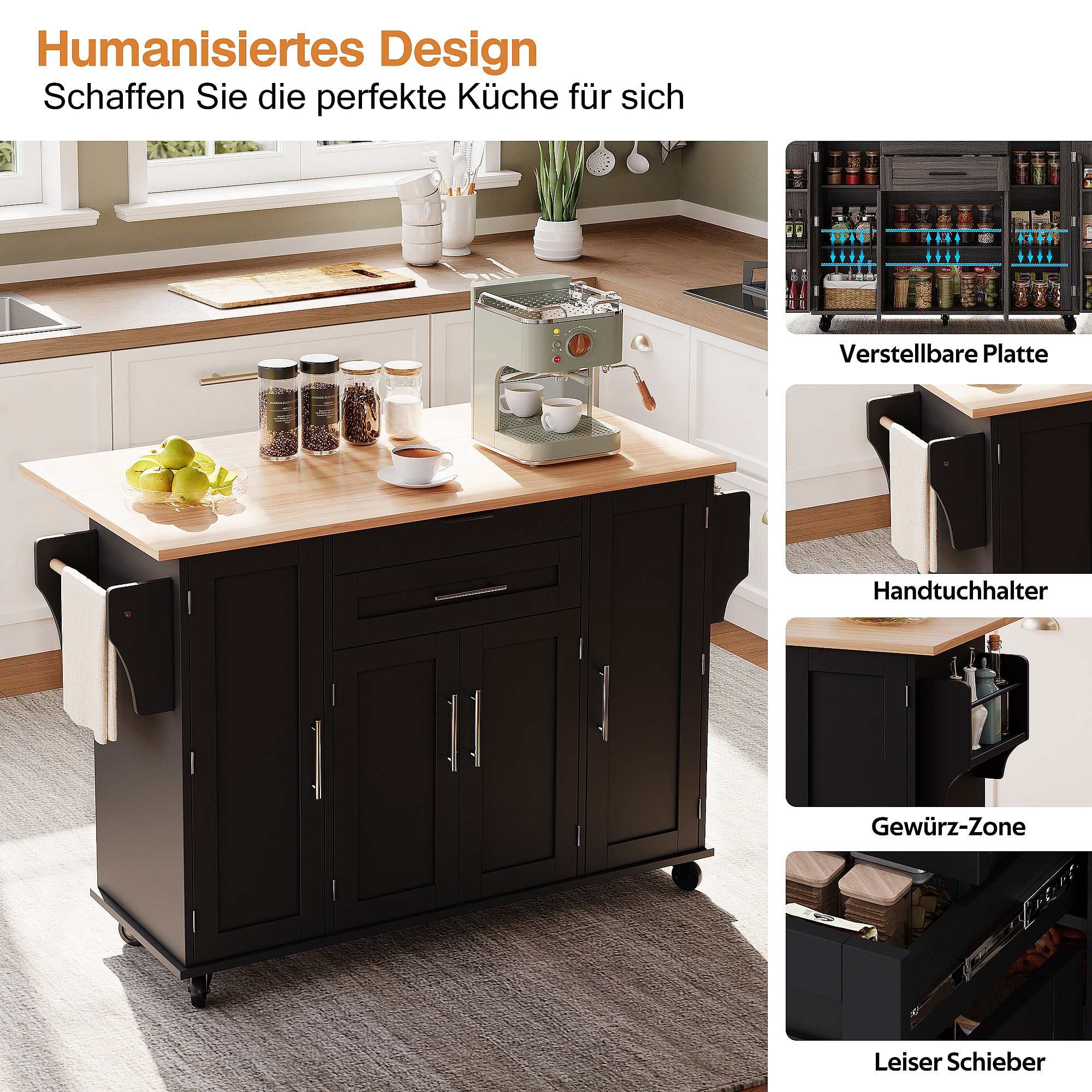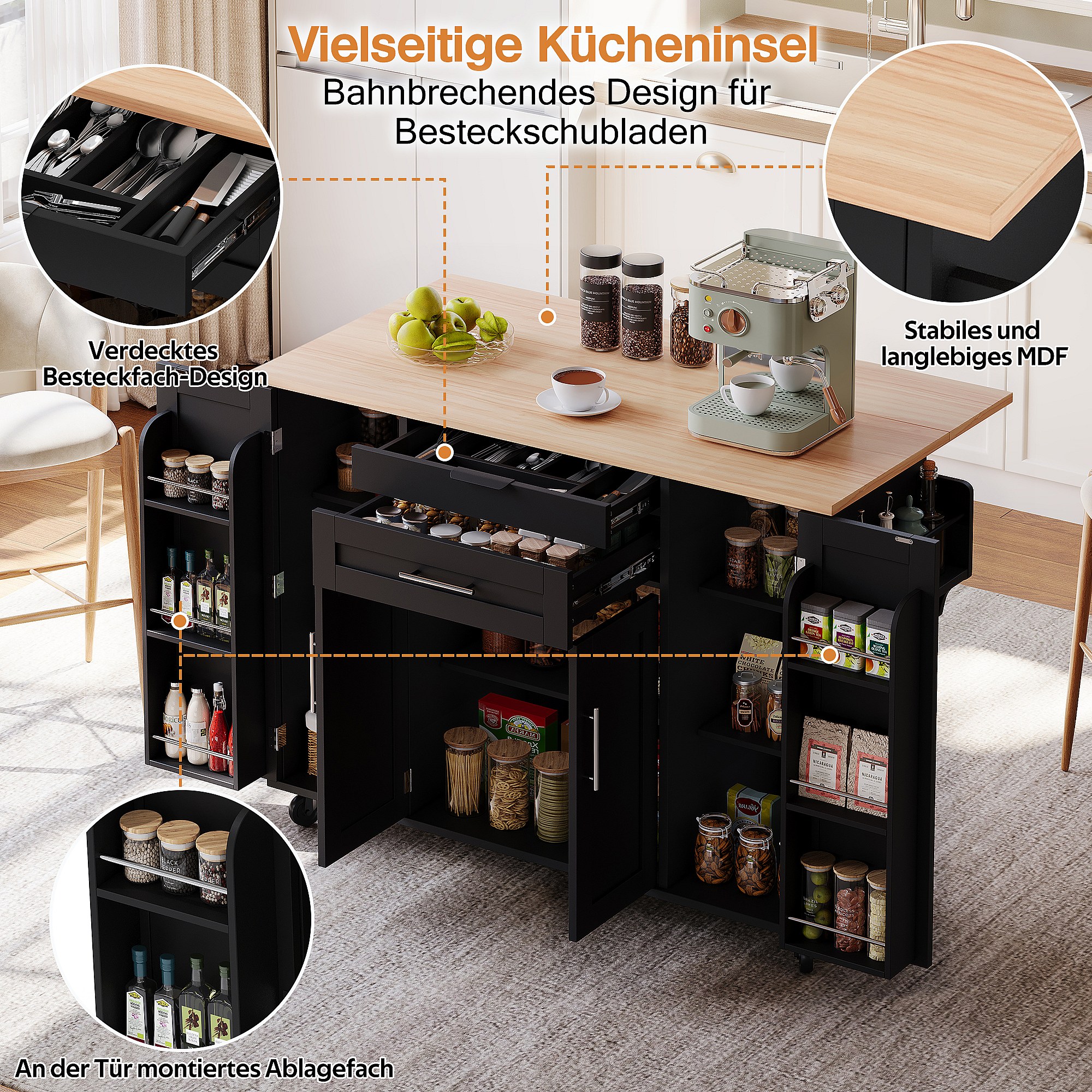 Îlot central mobile avec plan de travail extensible + 2 tiroirs + 4 portes - 136 x 45/70 x 92 cm - MDF - noir