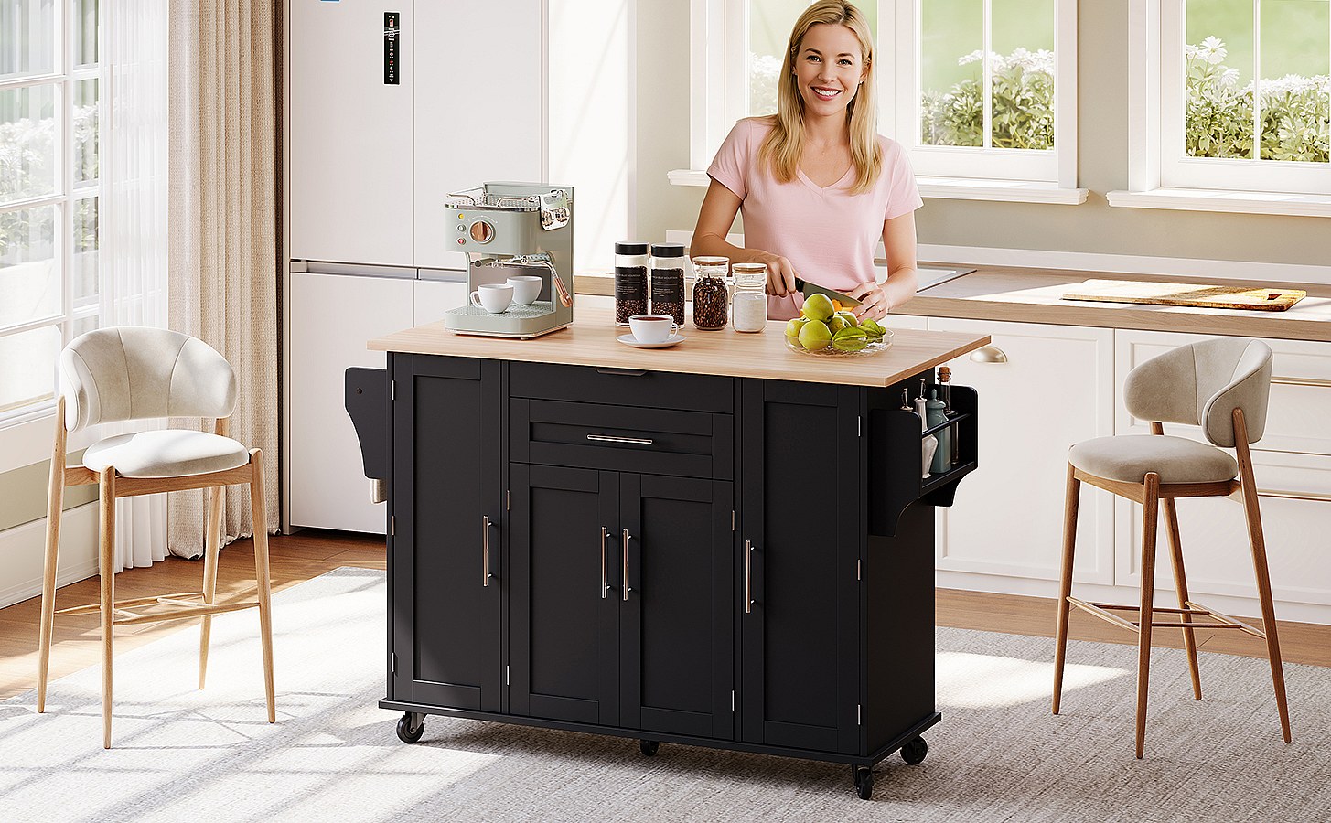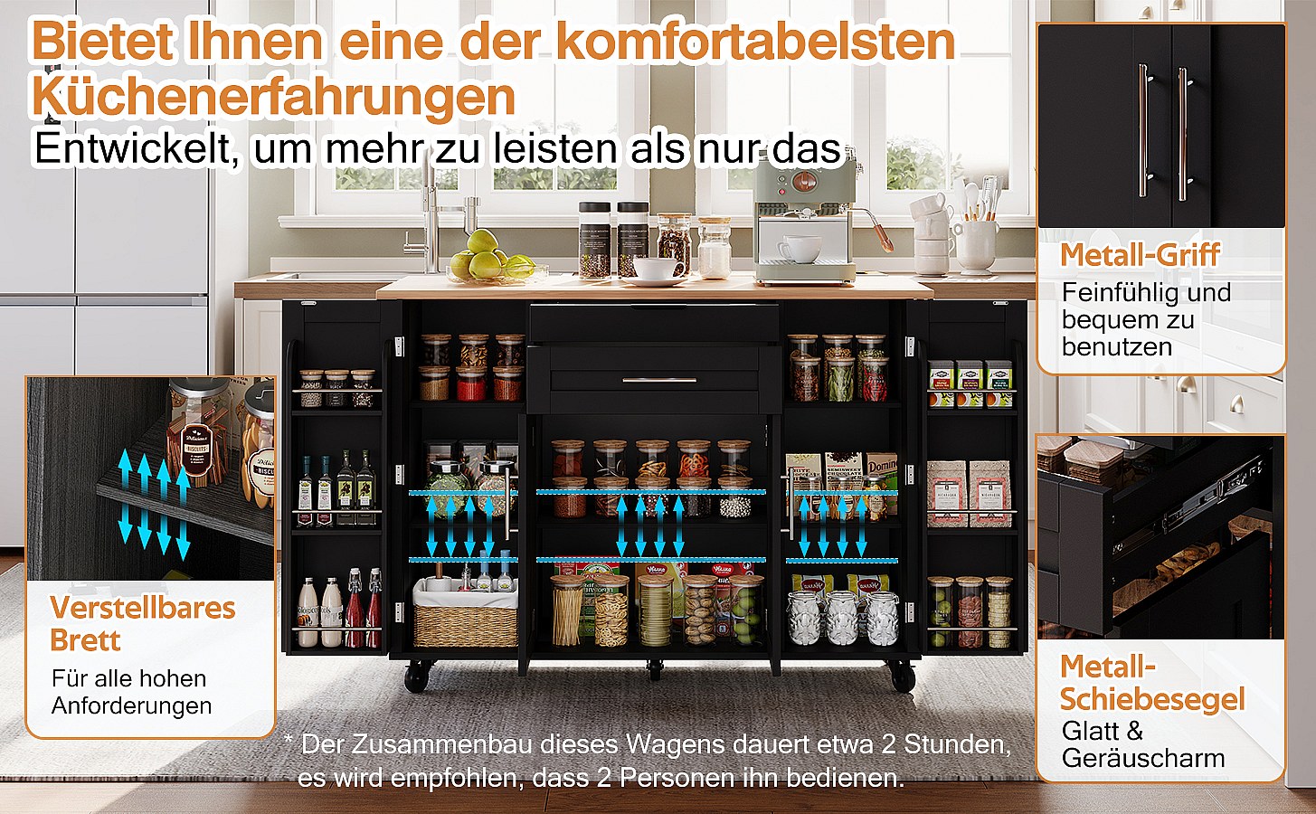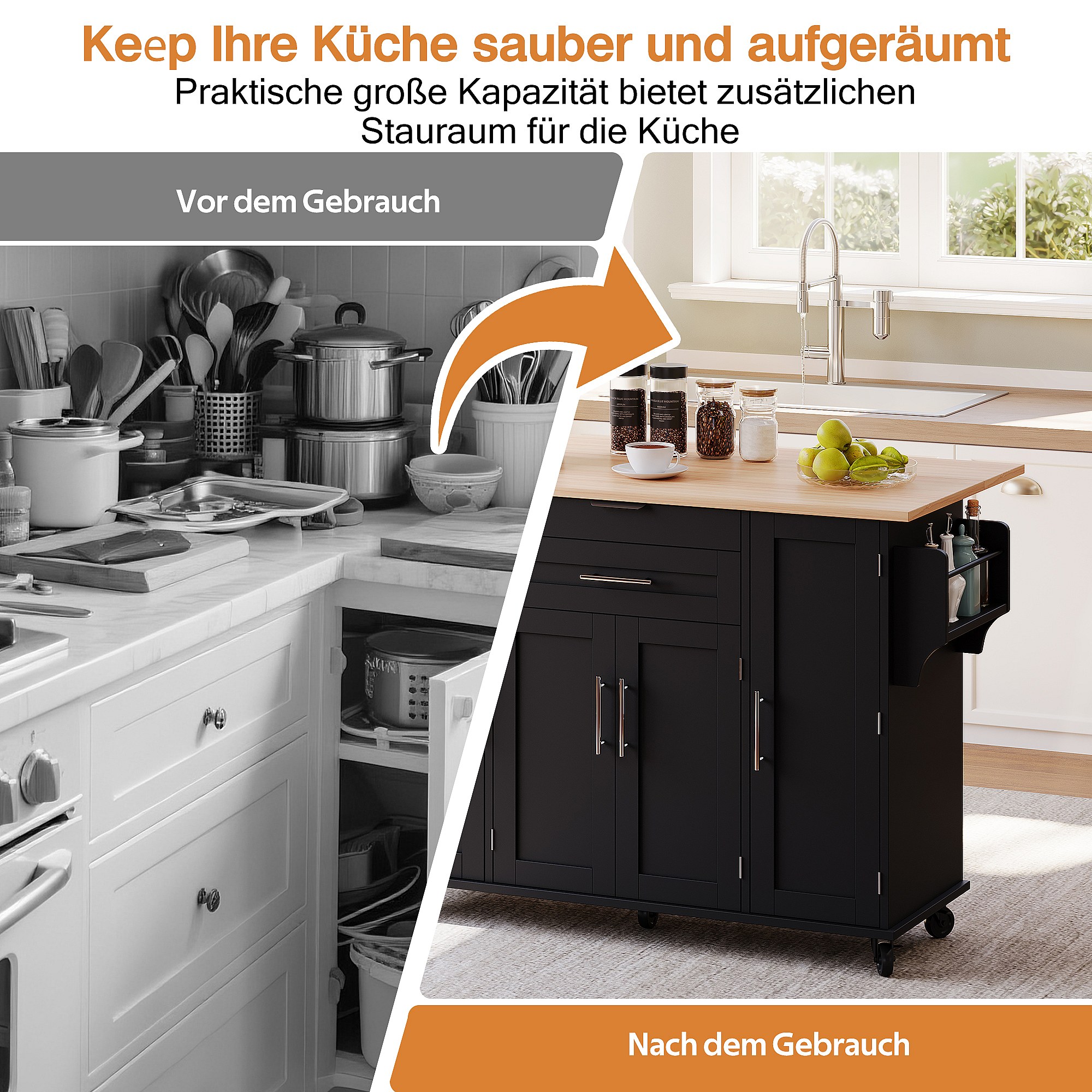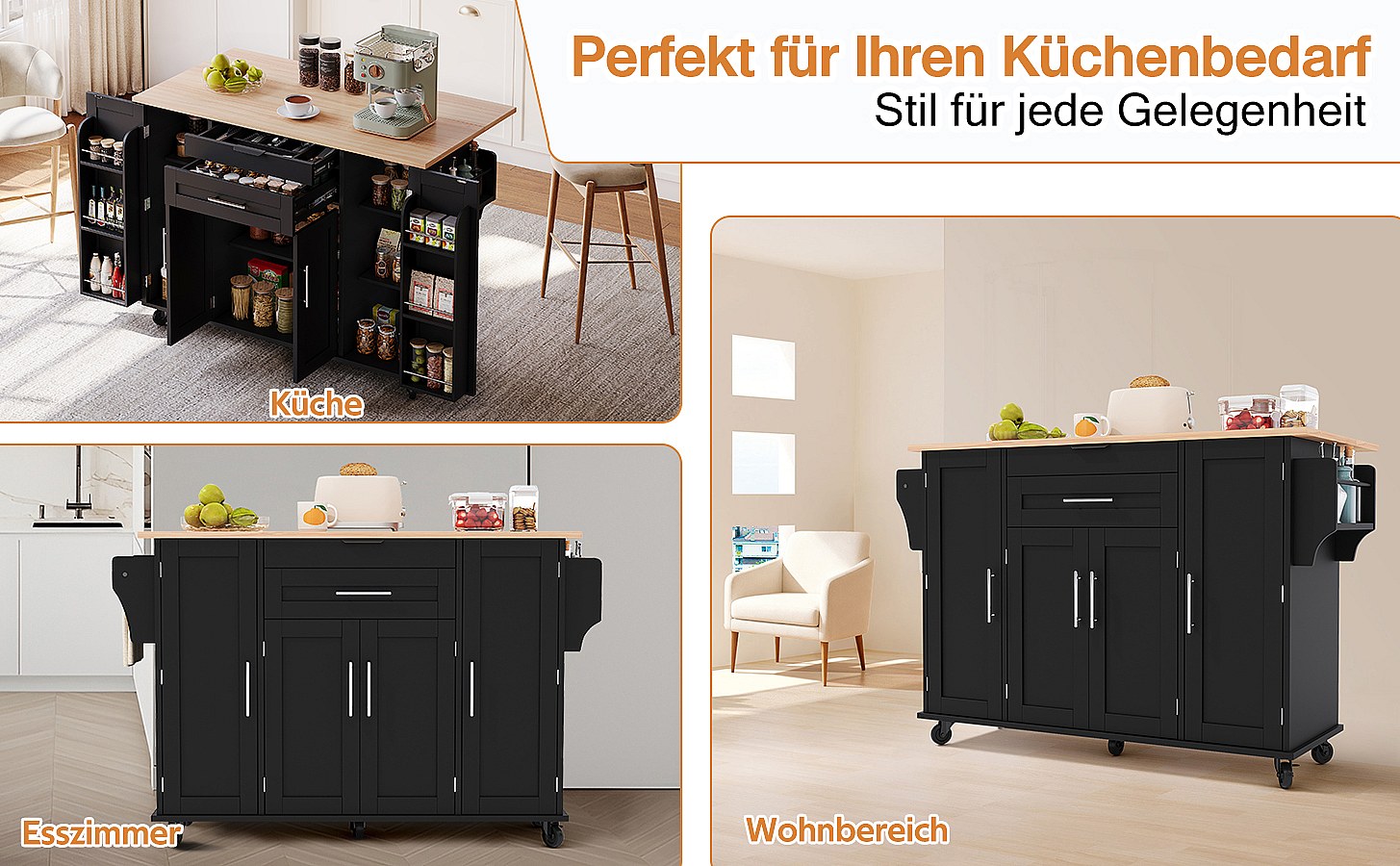 Îlot central moderne - 142 x 63 x 87 cm - avec roulettes + armoires extensible + 1 tiroir - MDF - noir