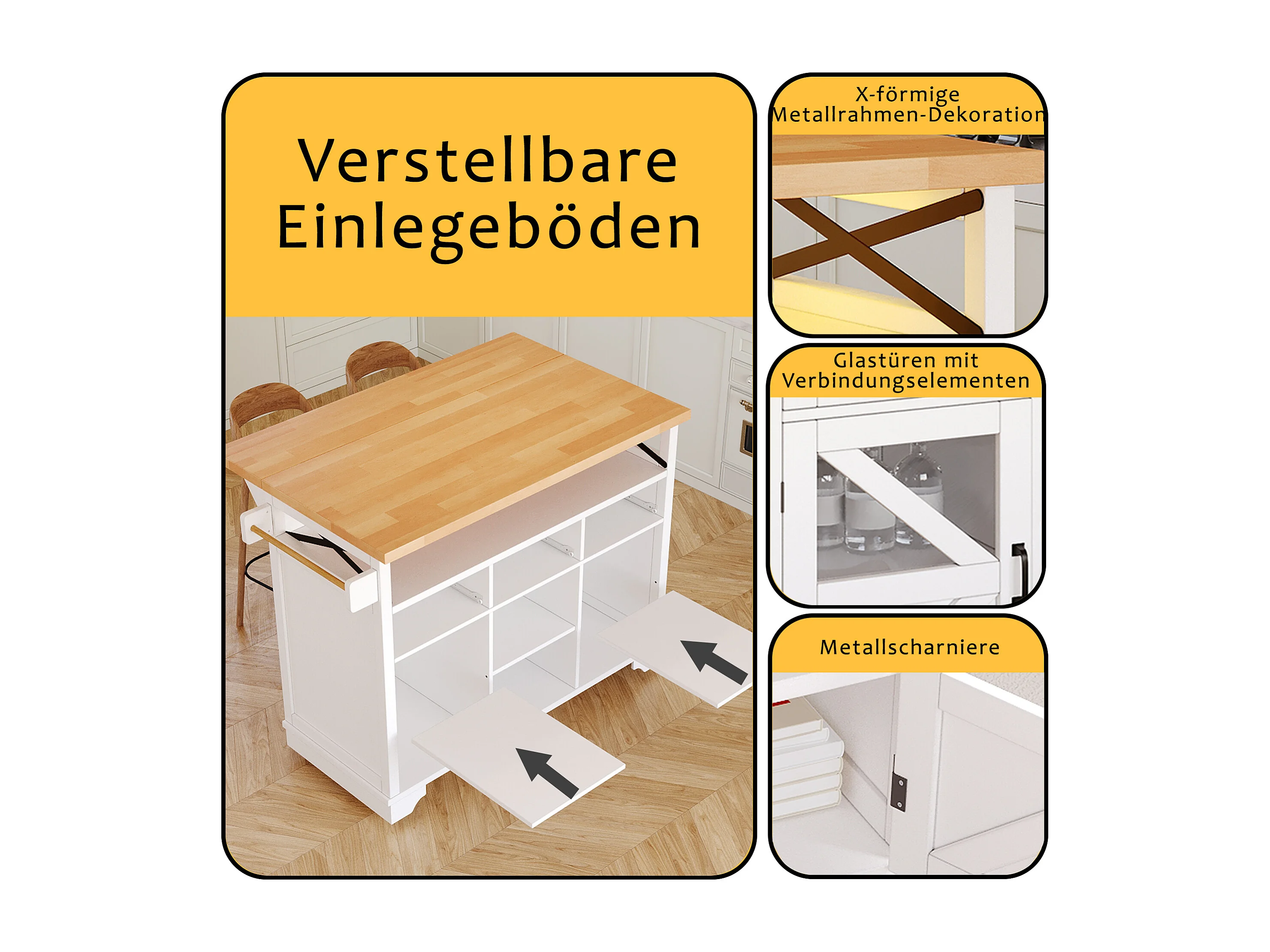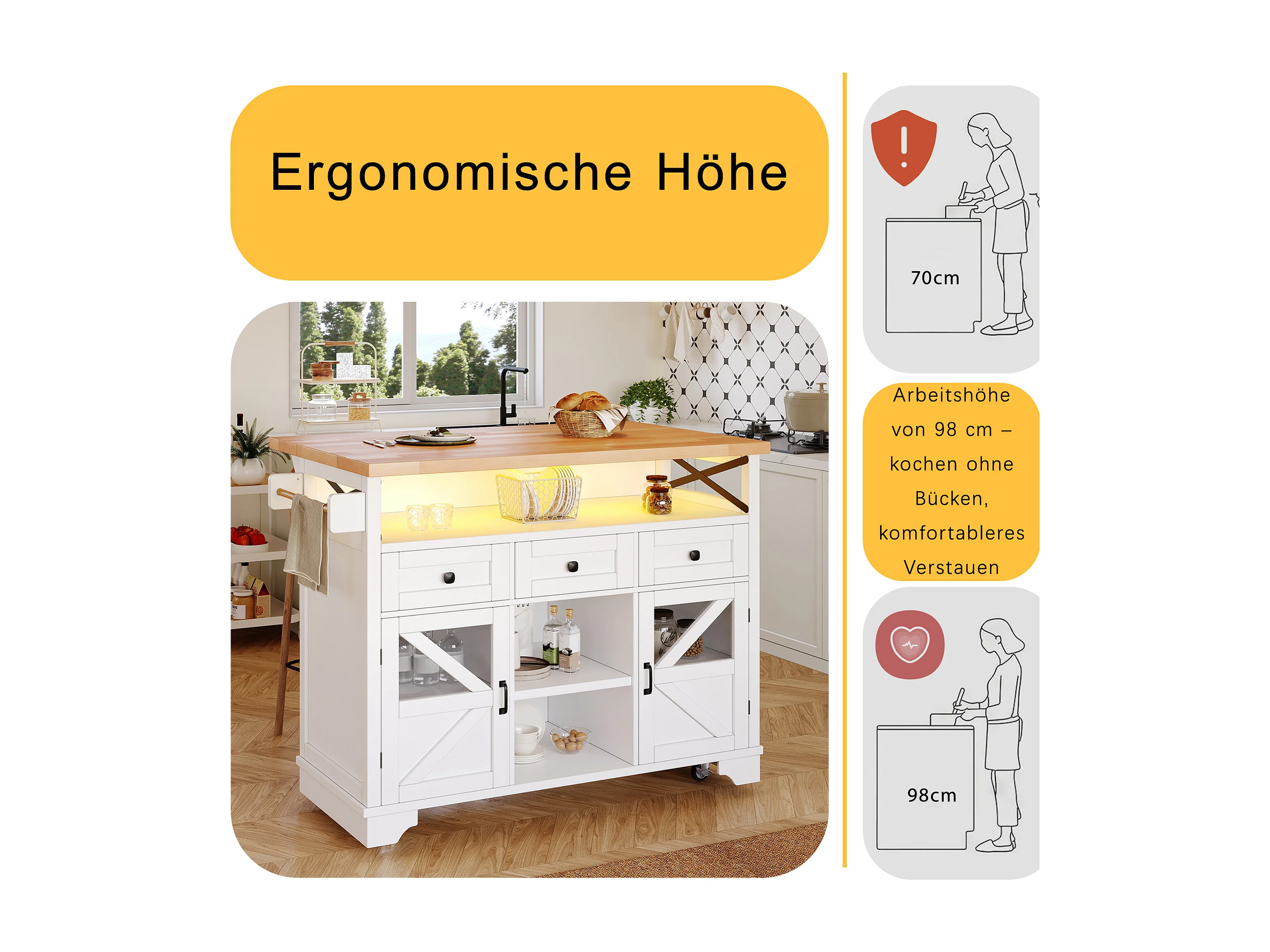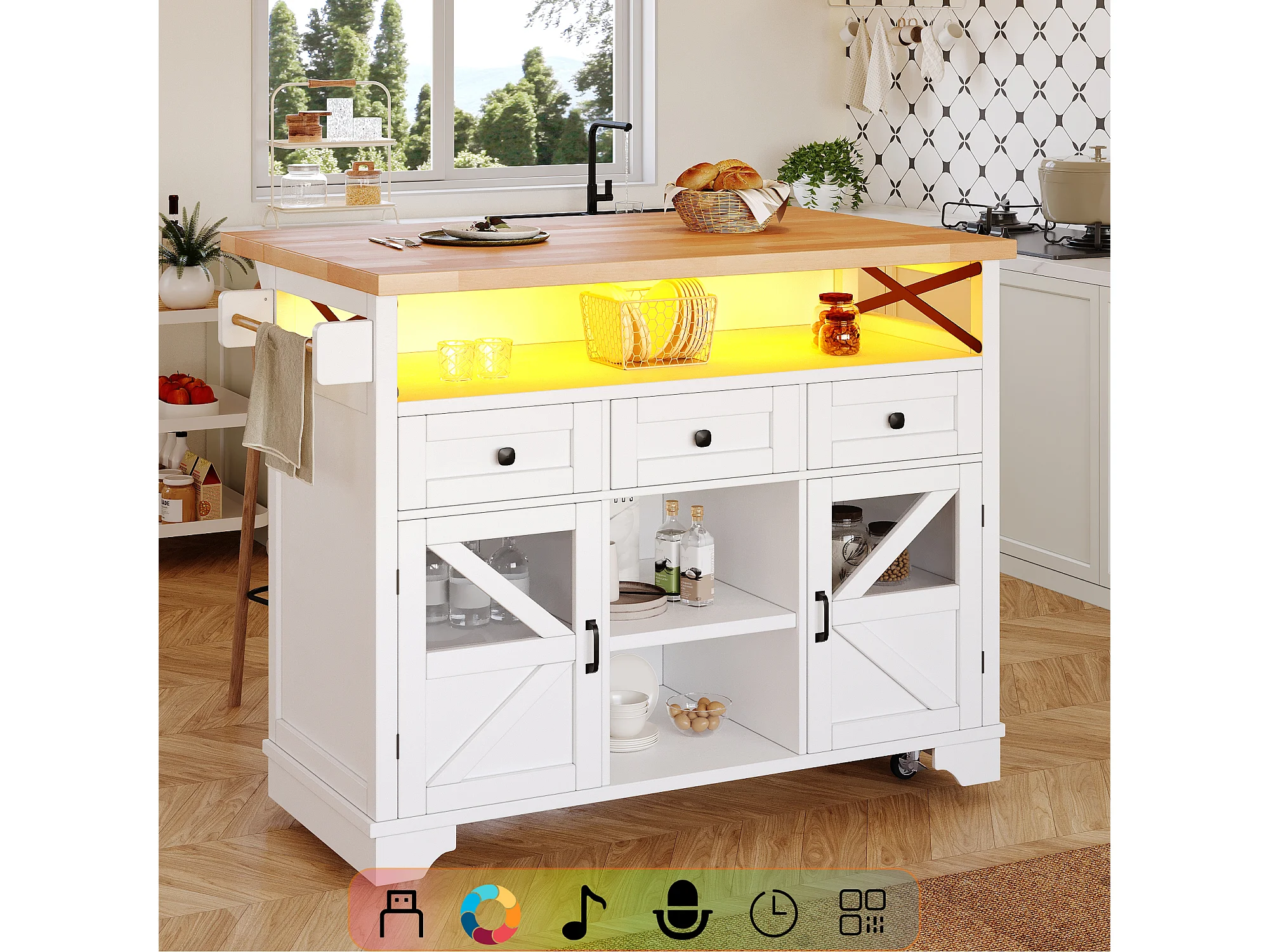 Îlot central mobile avec table pliante - 120 x 43/71 cm x 98 cm - avec Leds + 2 portes + 3 tiroirs + étagère - MDF - blanc