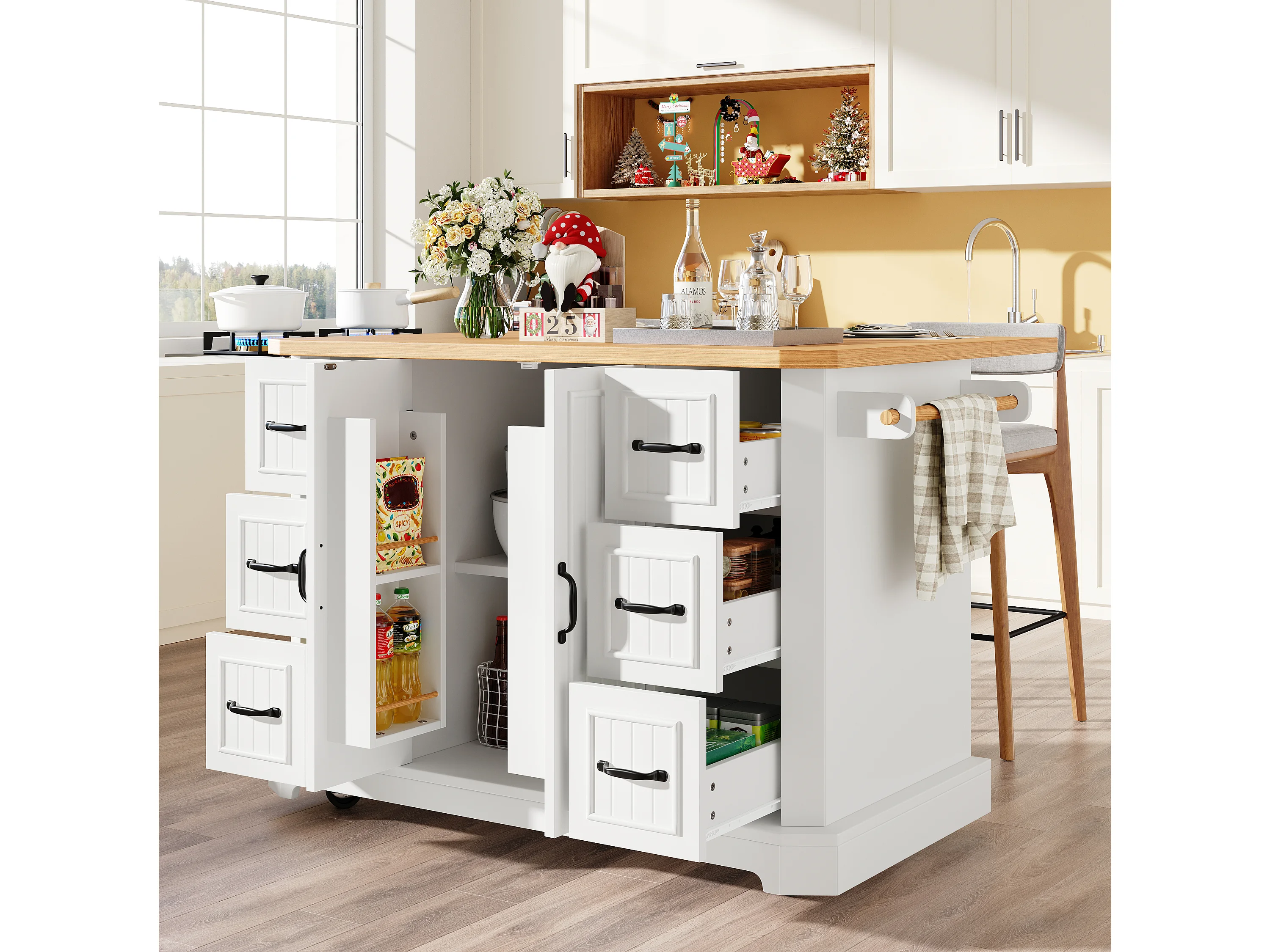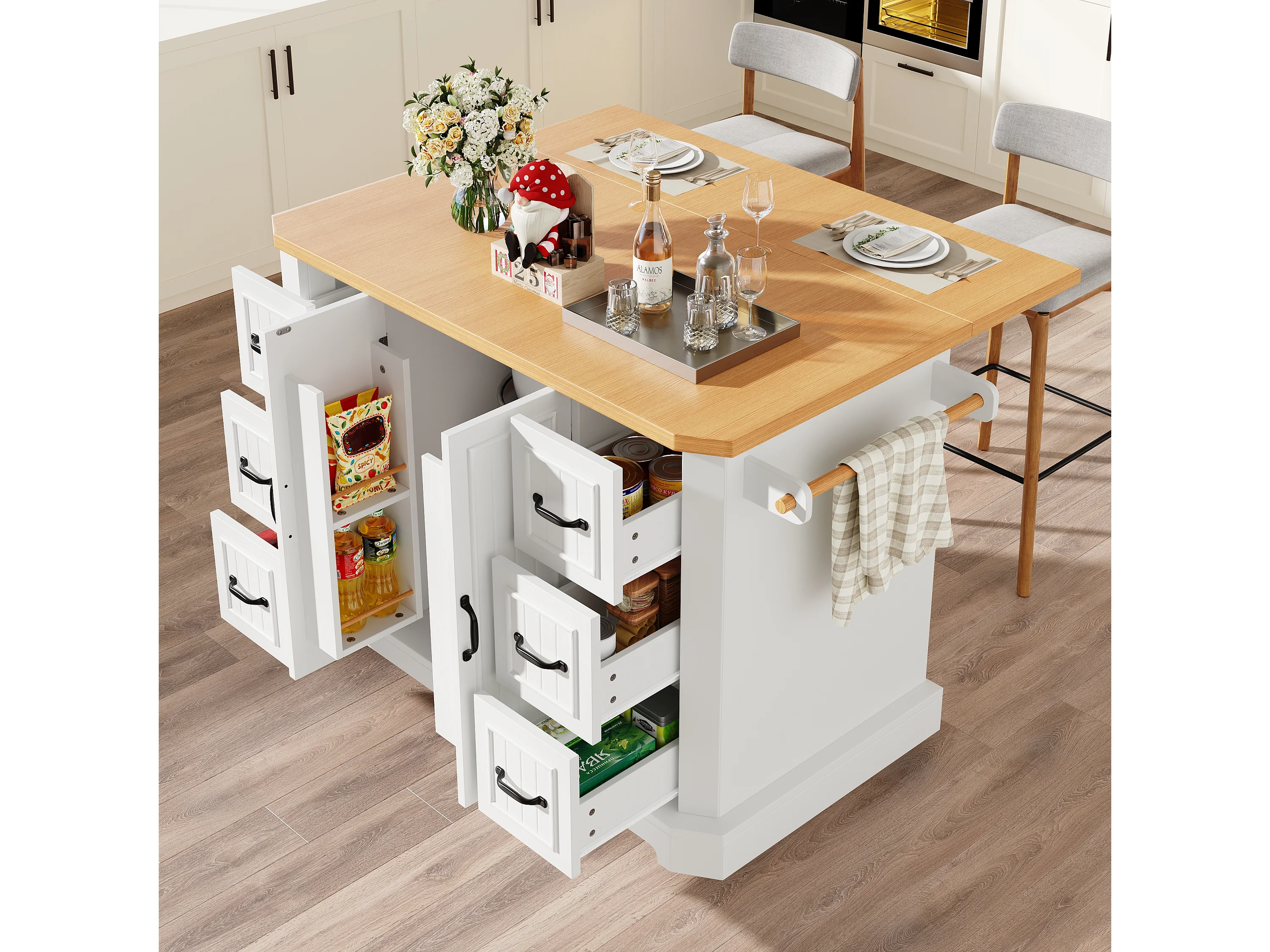 Îlot central mobile avec table pliante - 120 x 45/75 cm x 91 cm - avec 2 portes + 6 tiroirs - MDF - blanc