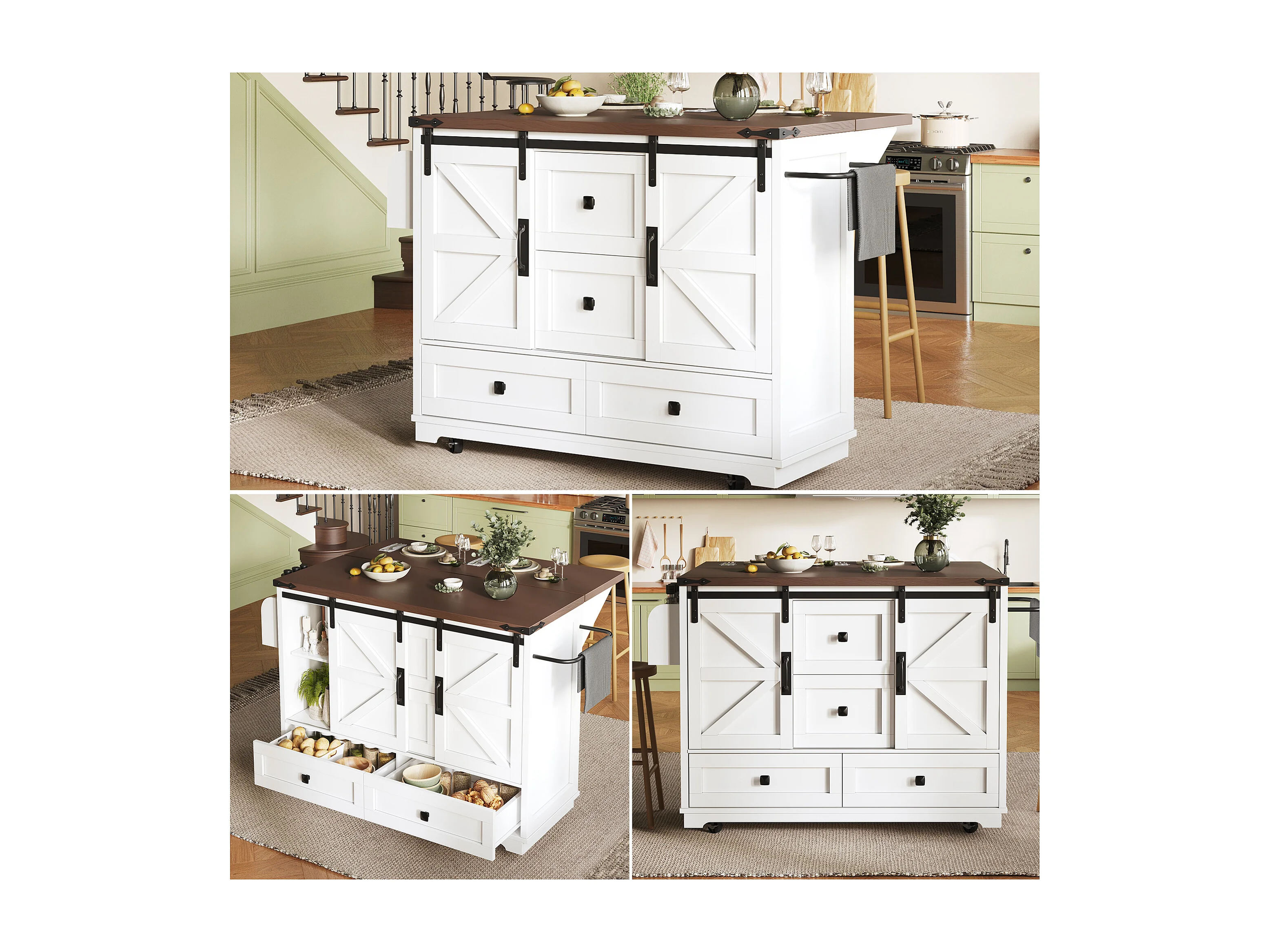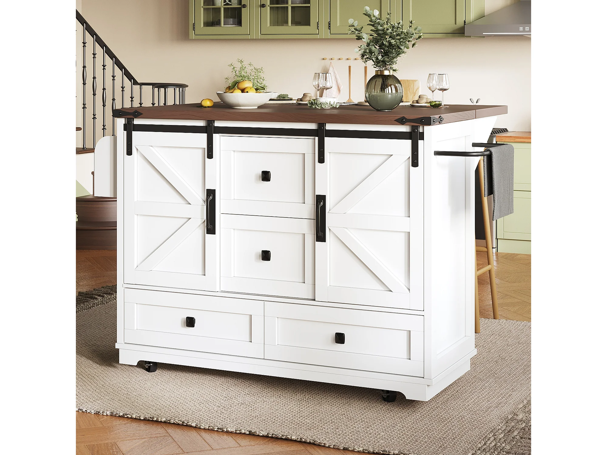 Îlot central mobile avec table pliante - 142.5 x 45/73 cm x 92.5 cm - avec 2 portes + 3 tiroirs - MDF - blanc