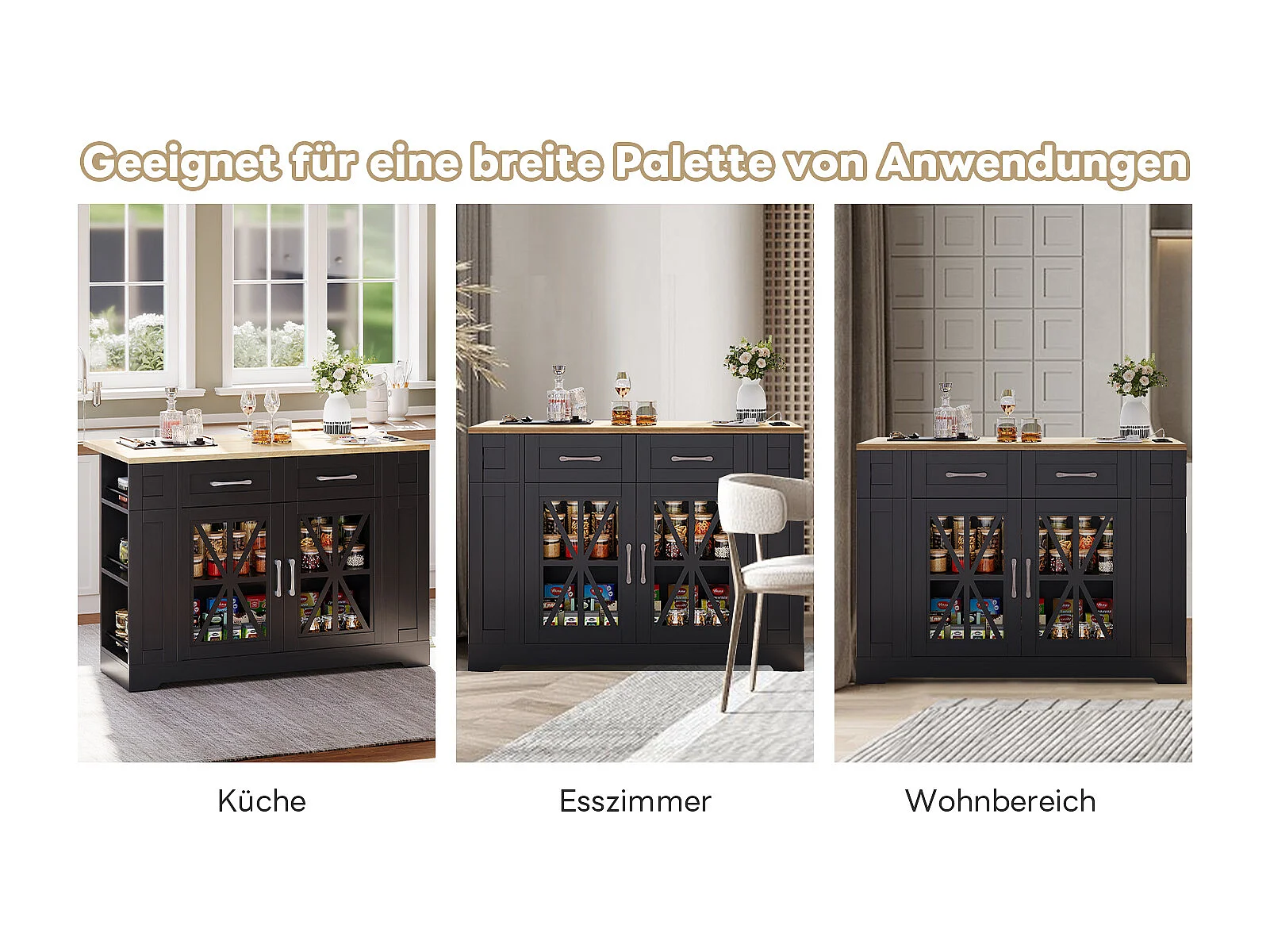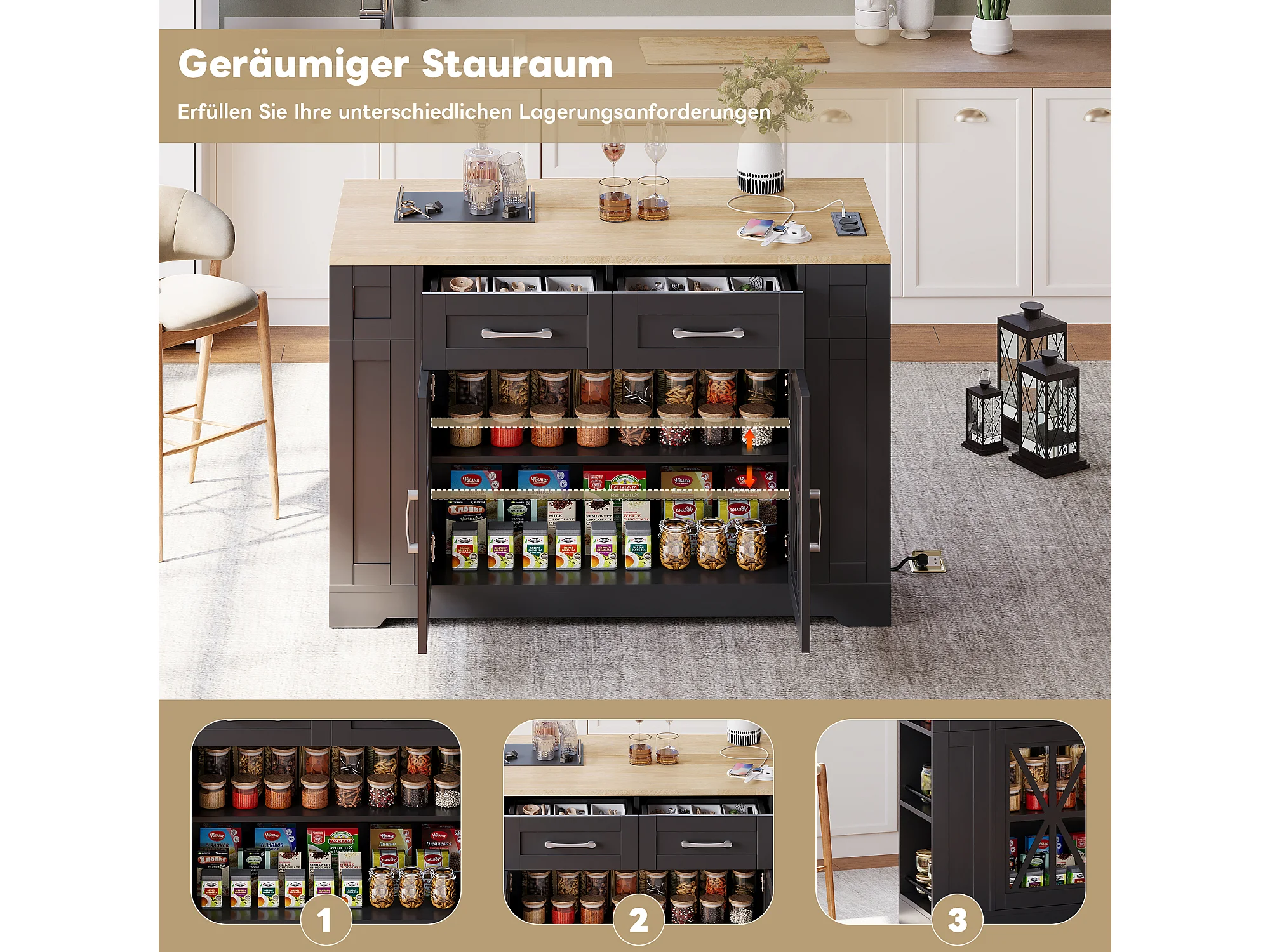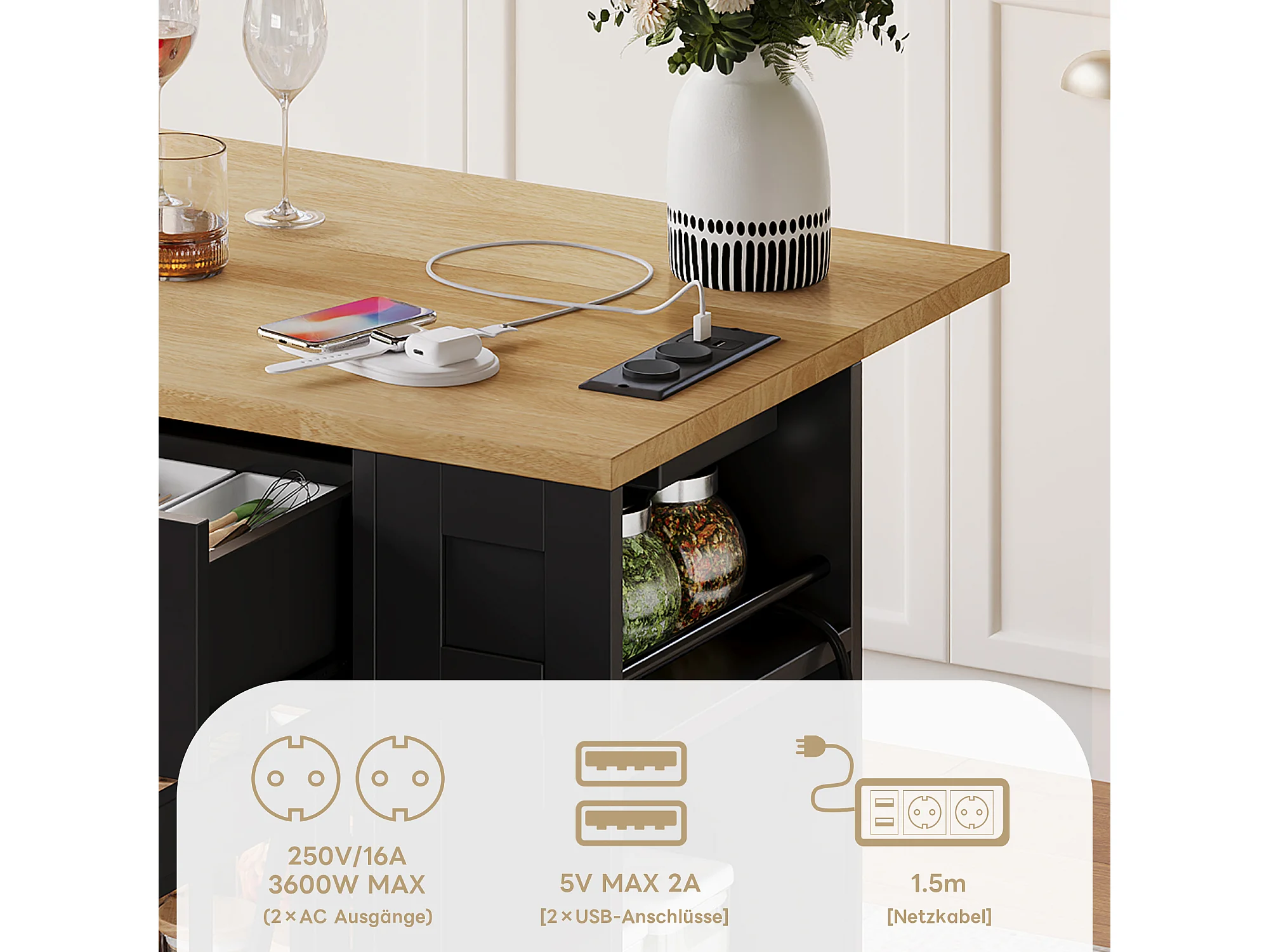 Îlot central portable - 120 x 40/65 x 92 cm - avec table pliante + portes en verre + 2 tirois + prise + USB - MDF - noir + naturel