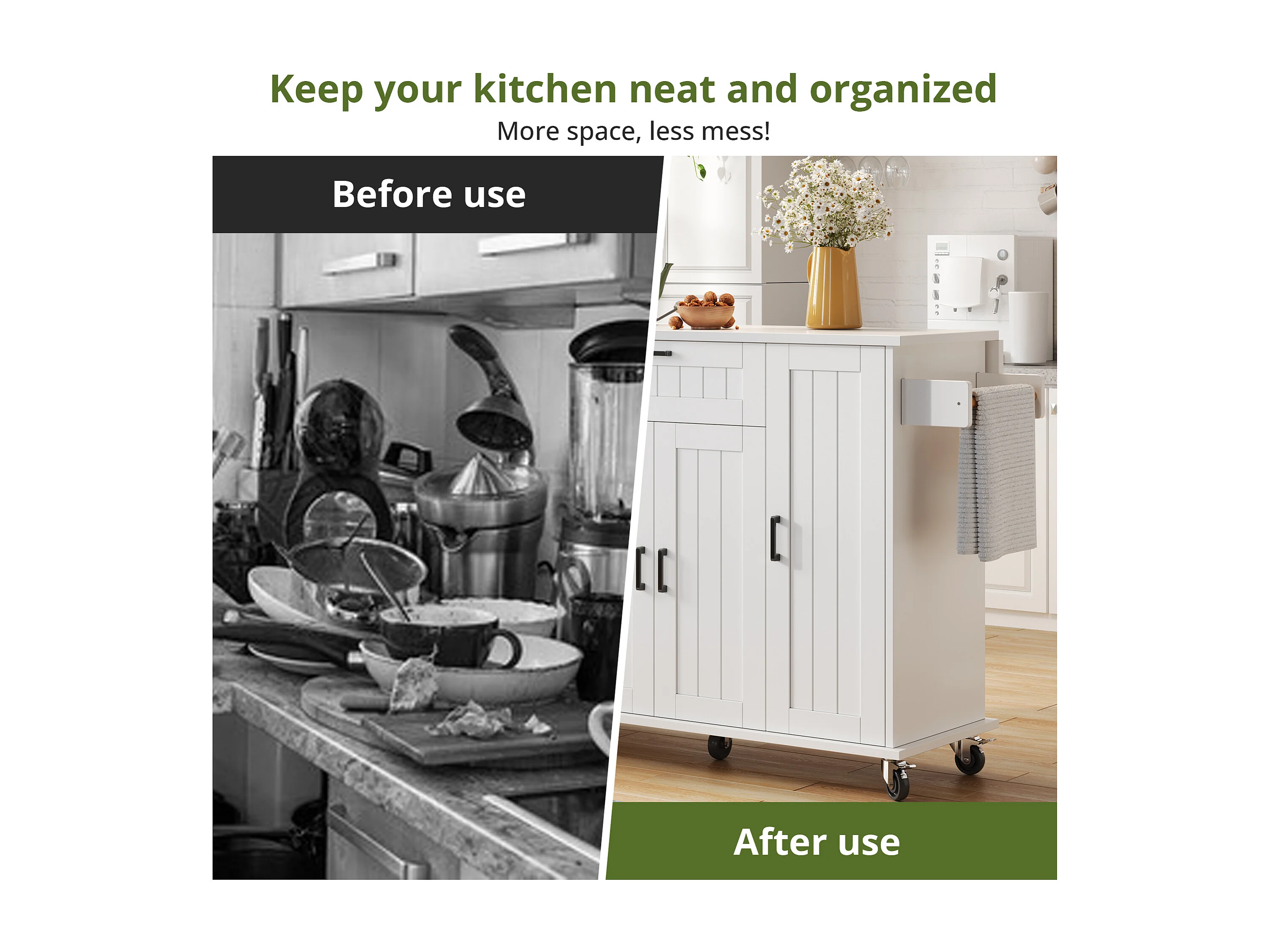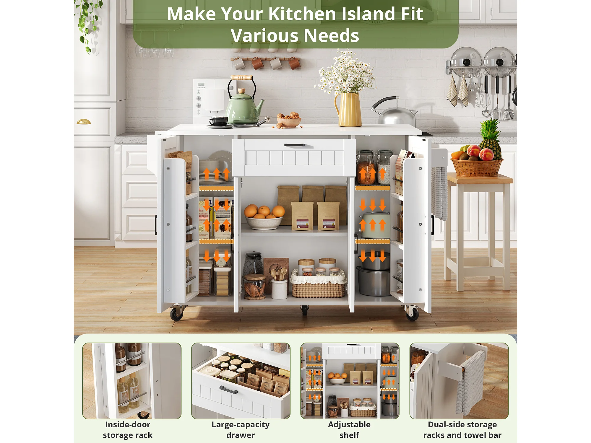 Îlot central sur roulettes - 120 x 45/70 x 95 cm - avec plan de travail rabattable + 4 portes + 1 tiroirs - MDF - blanc