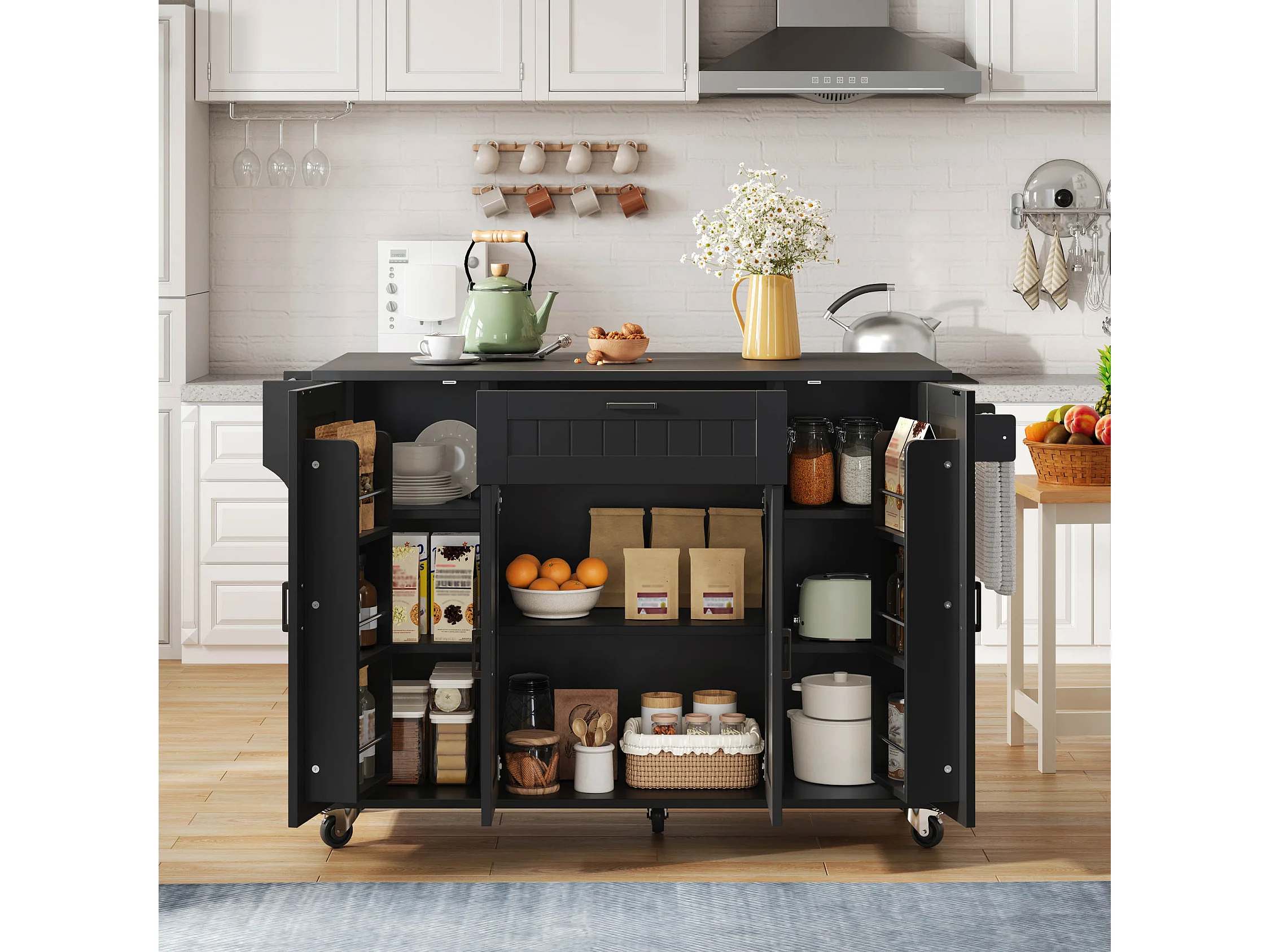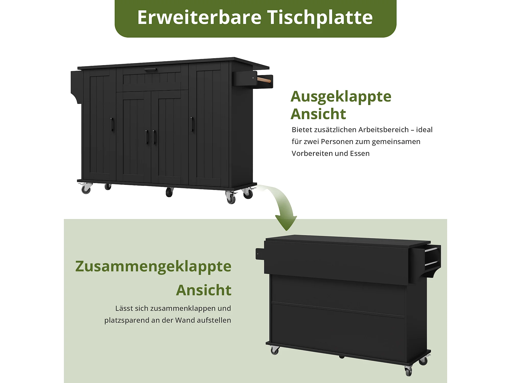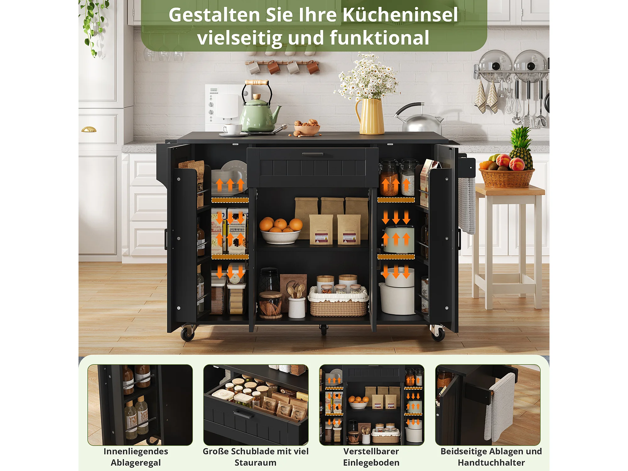 Îlot central sur roulettes - 120 x 45/70 x 95 cm - avec plan de travail rabattable + 4 portes + 1 tiroirs - MDF - noir