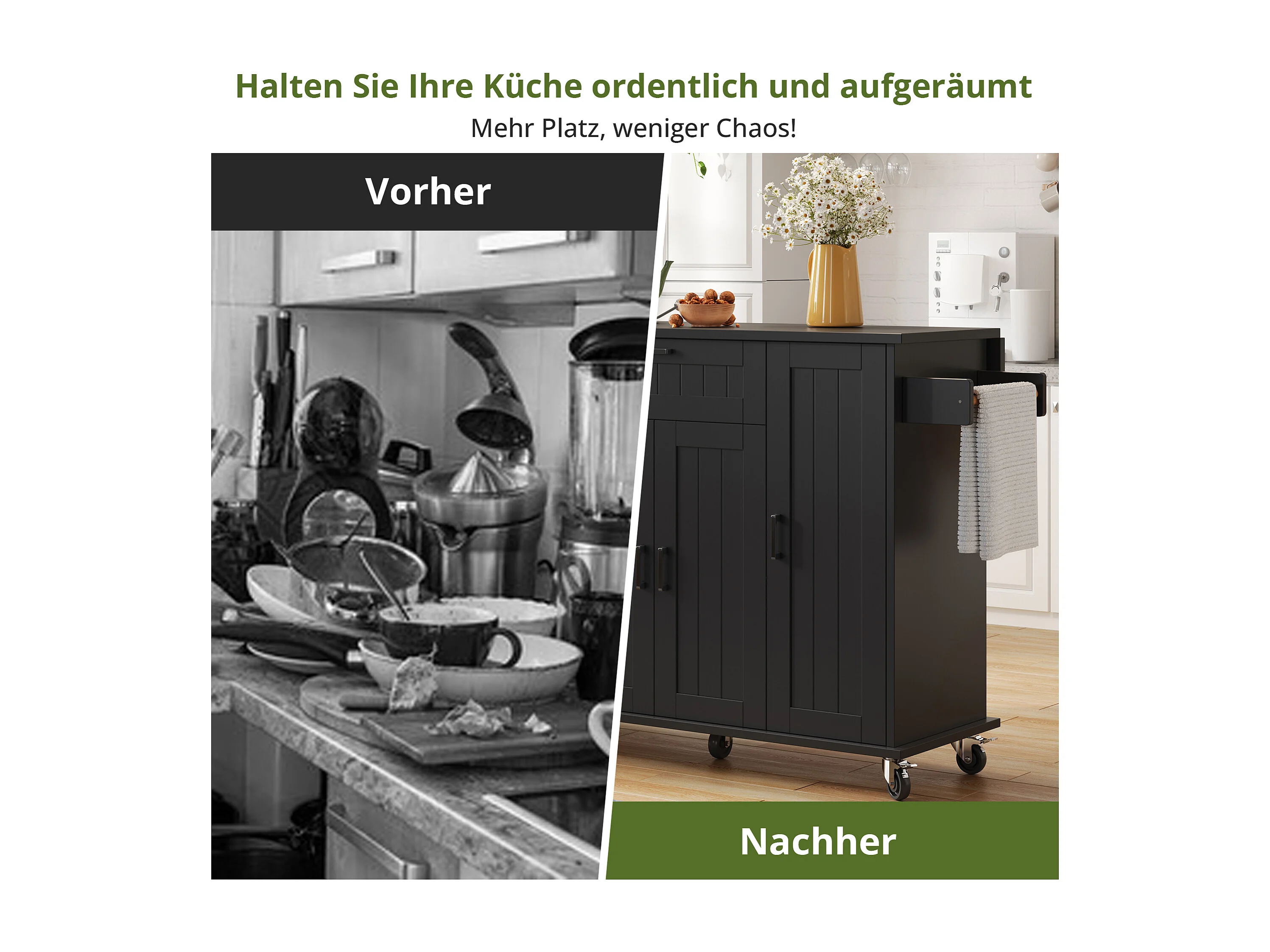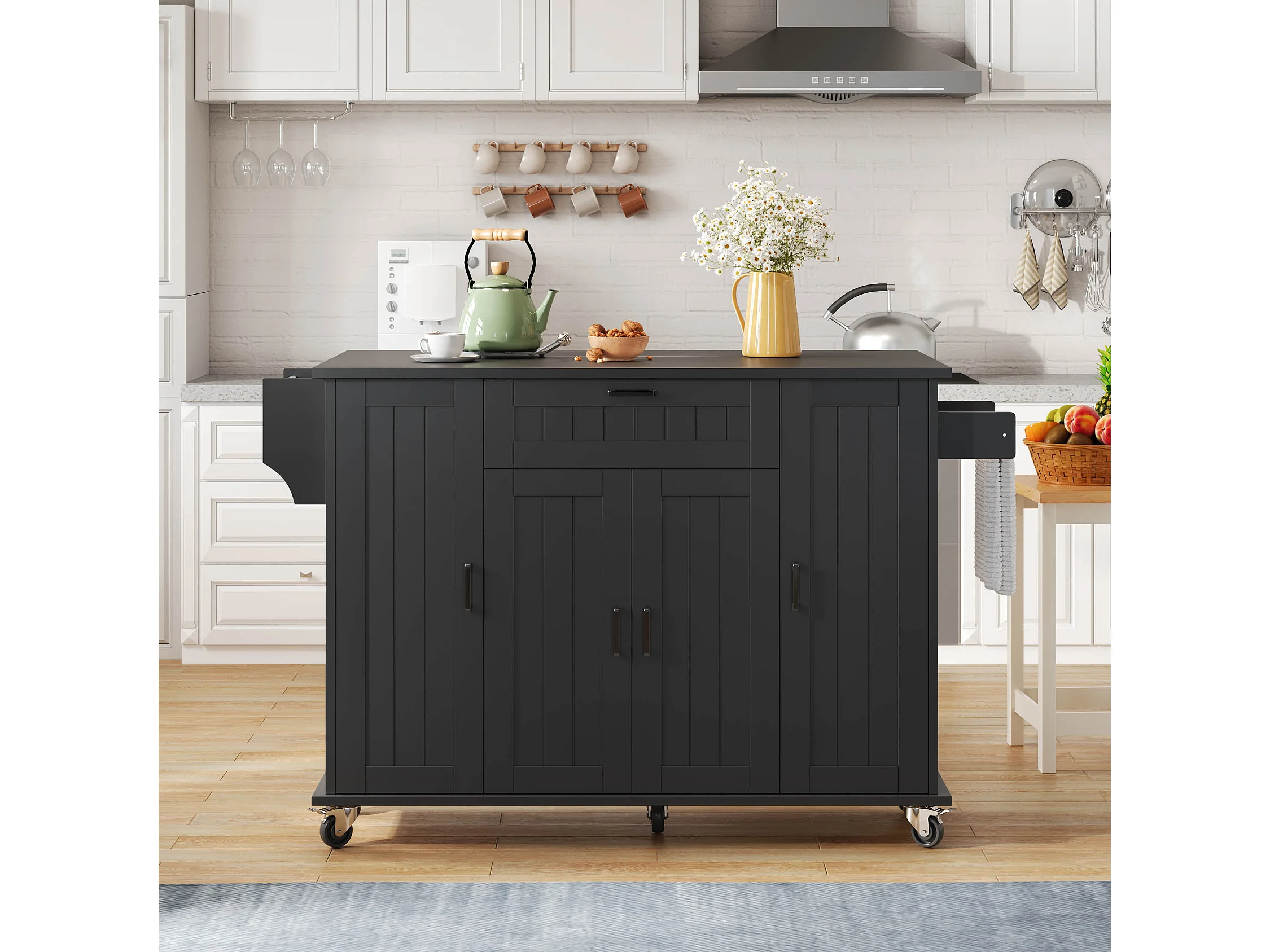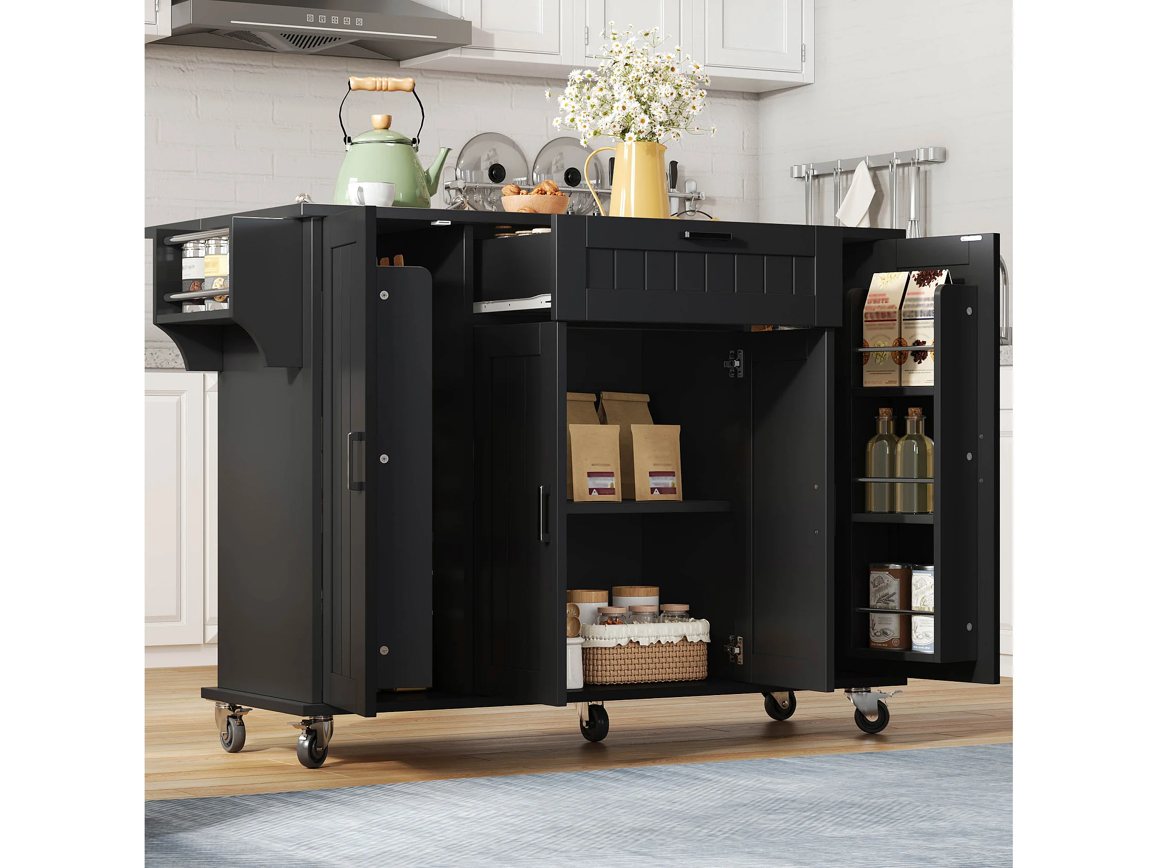 Îlot central sur roulettes - 120 x 45/70 x 95 cm - avec plan de travail rabattable + 4 portes + 1 tiroirs - MDF - noir