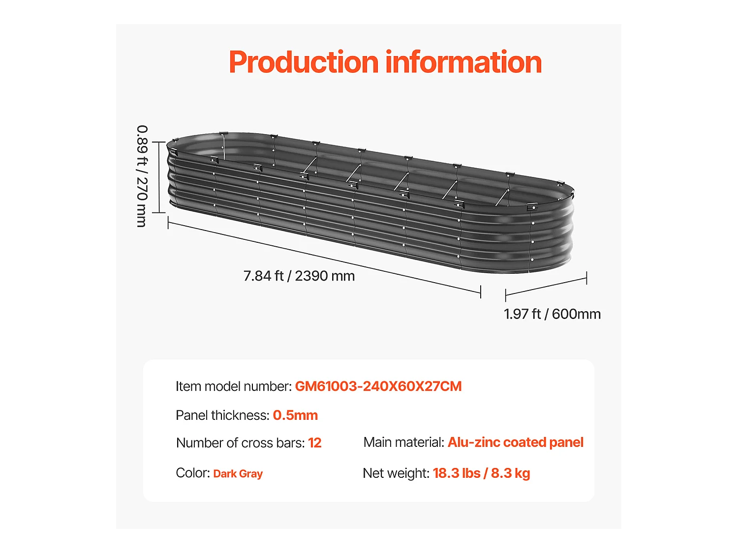Jardinière Surélevée en Métal SucceBuy 243.84 x 60.96 x 30.48cm Galvanisée Gris Foncé
