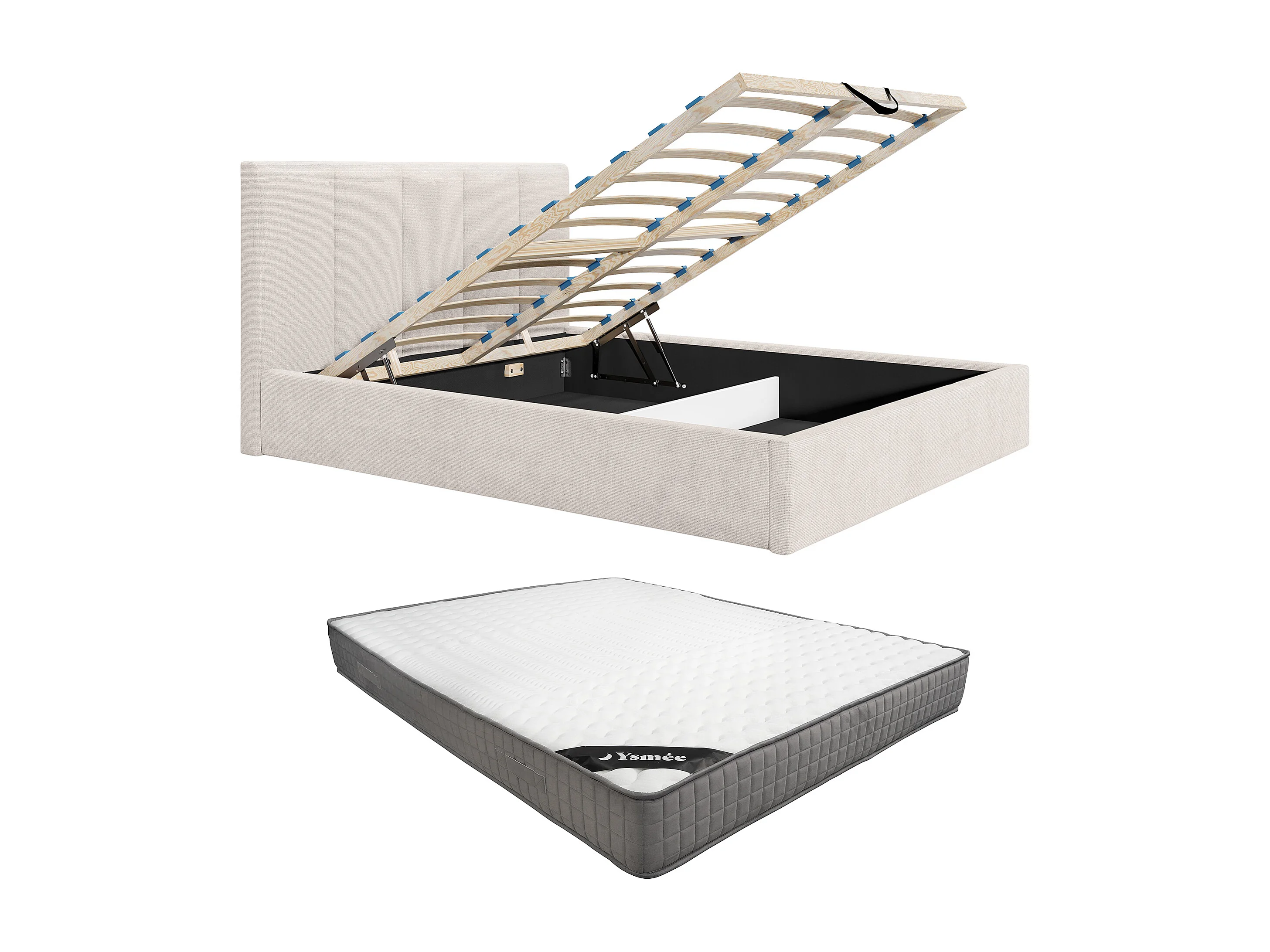 Lit coffre 140 x 190 cm avec tête de lit coutures verticales - Tissu - Beige - Avec matelas - KILACLO