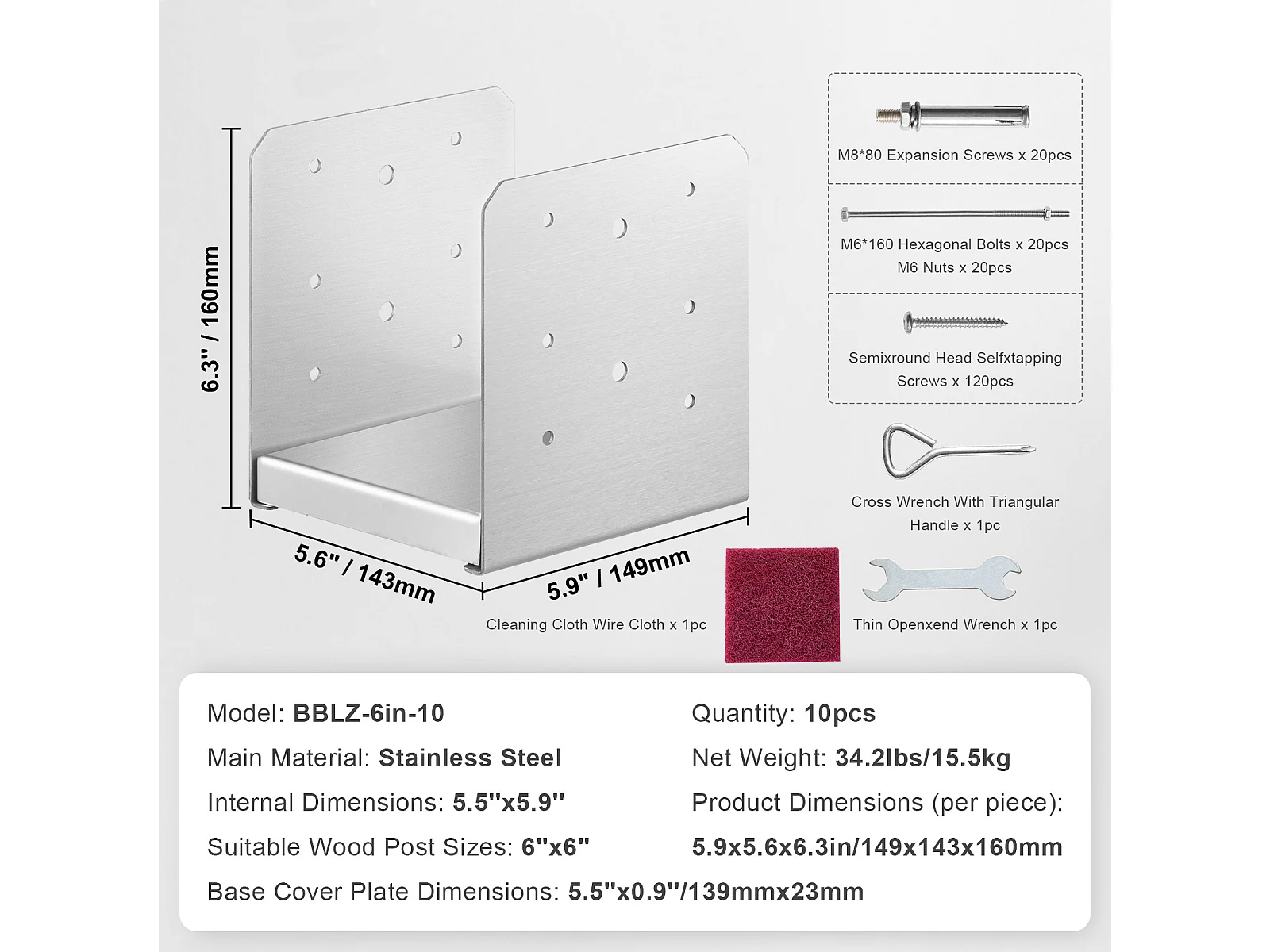 Kit de Supports SucceBuy Lot de 10 Supports d'Ancrage Réglables pour Poteaux de Terrasse en Béton 15 × 15 cm