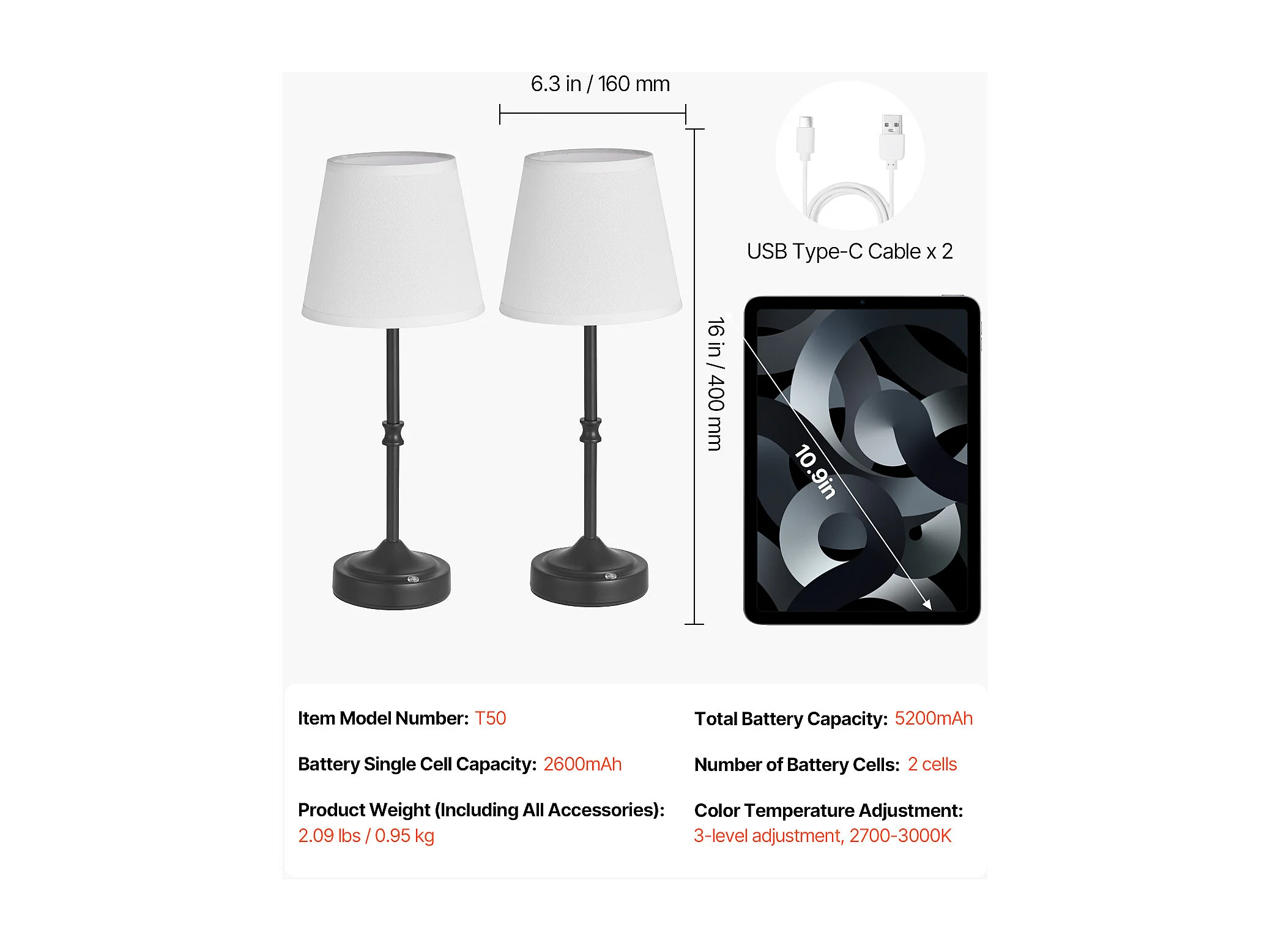 Lampe de Table Sans Fil SucceBuy, 2 Pièces, Batterie Rechargeable Intégrée 5200 mAh, 3 Niveaux Luminosité, Abat-Jour en Tissu, pour Chambre, Noir