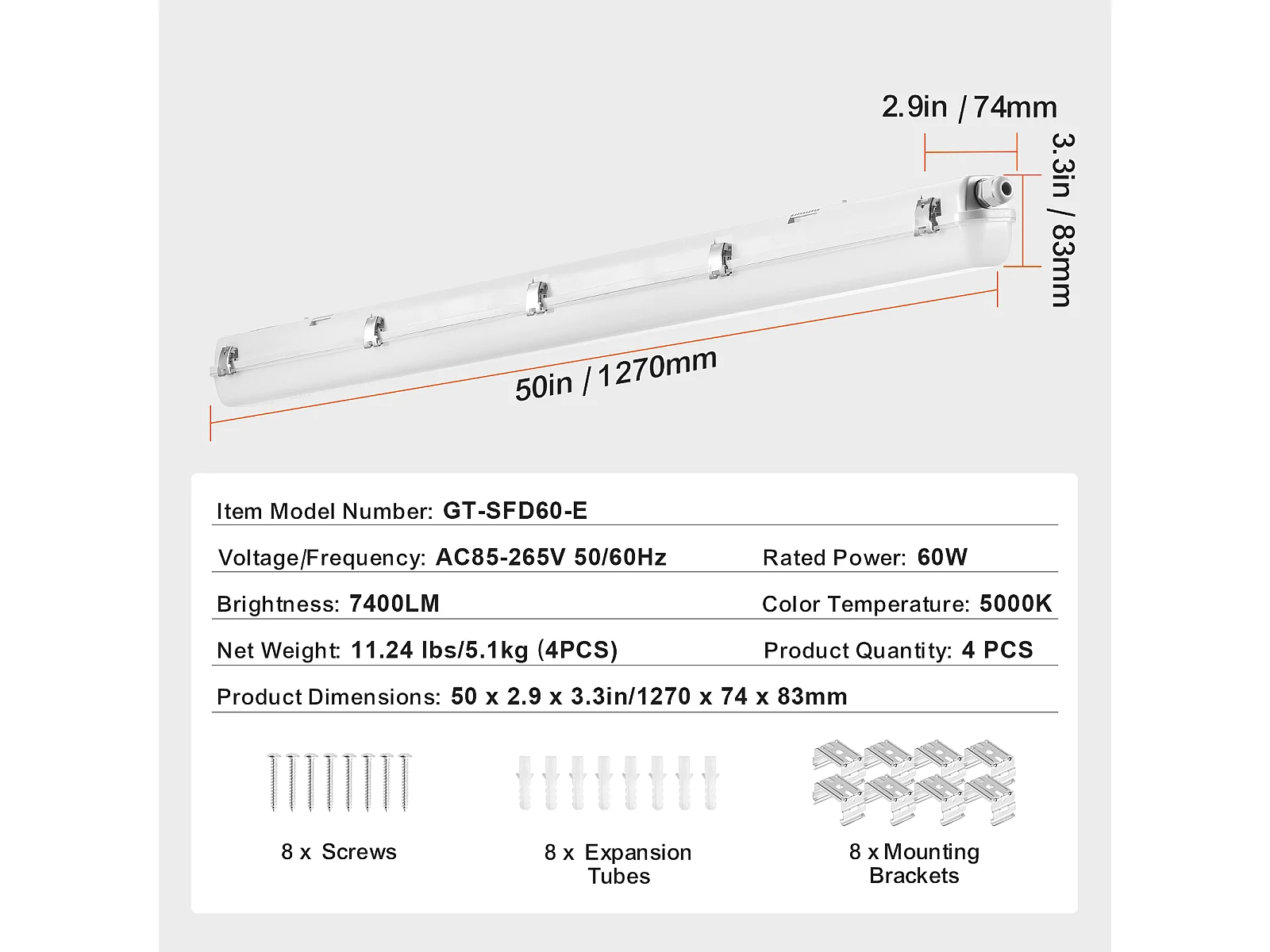Lampes LED Étanches à la Vapeur SucceBuy, 60 W, 7400 lm, 5000 K, Lot de 4