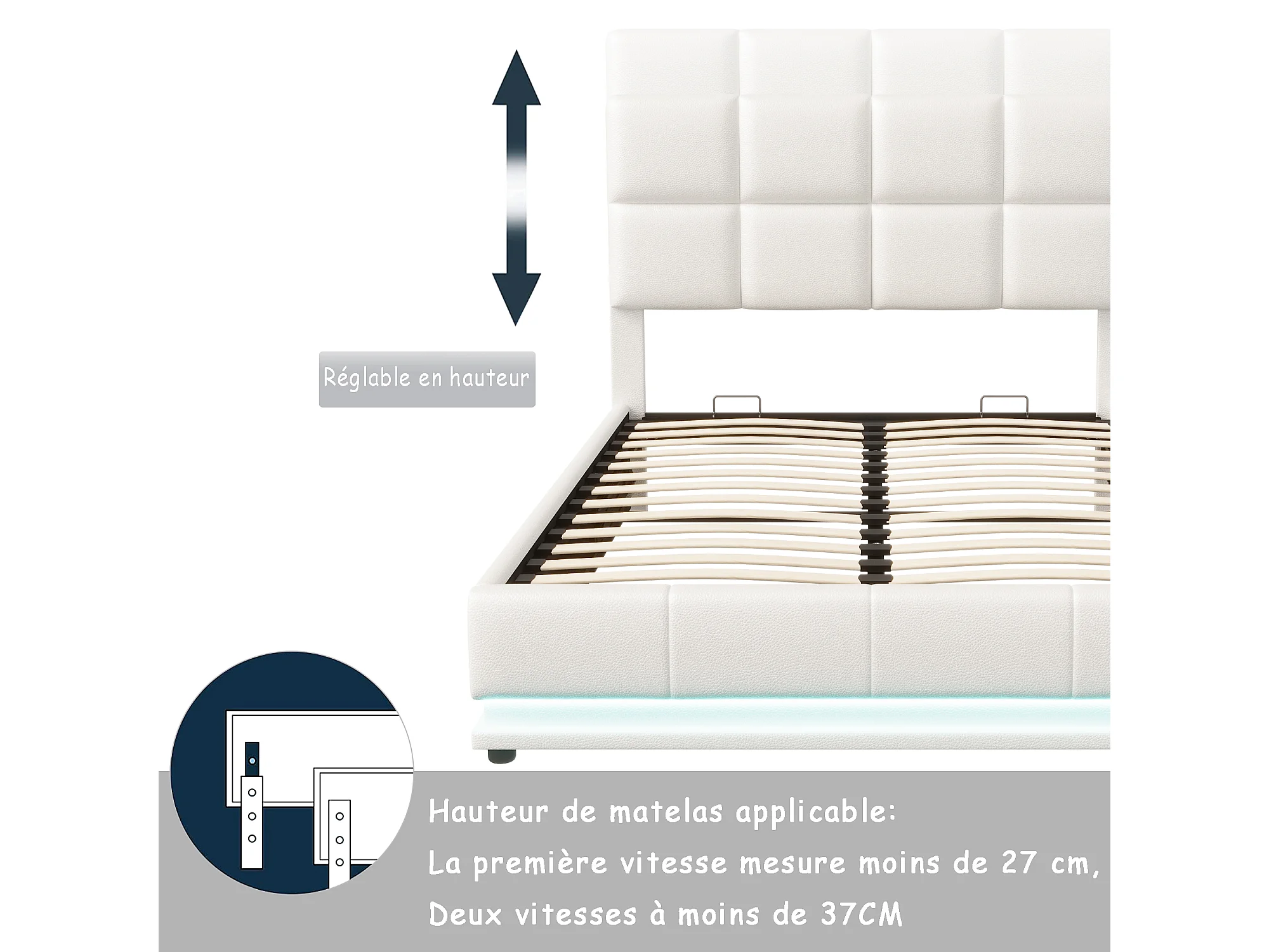 Lit 140 x 190 cm avec LED, tête relevable, sommier Lattes, Rangement, PU capitonné, Blanc
