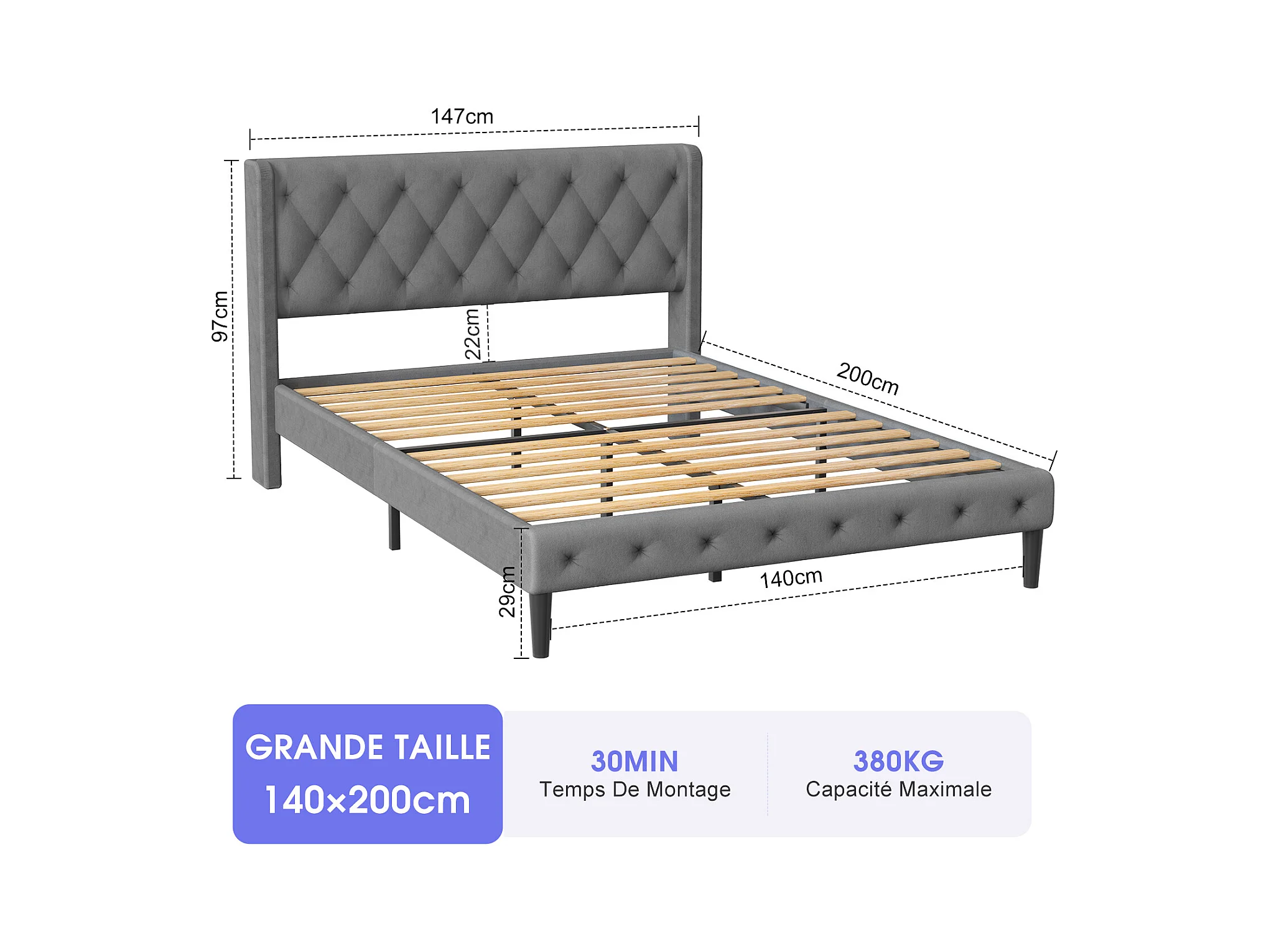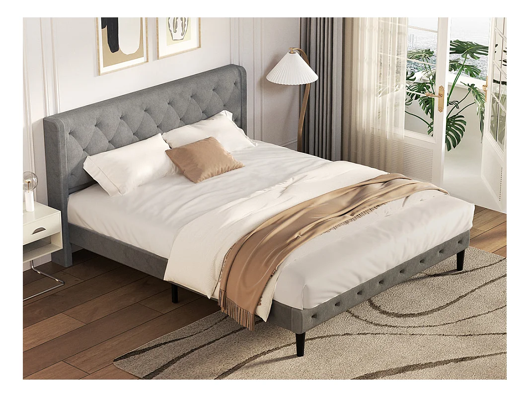 Lit 140 x 200 cm avec tête de lit capitonnée - Lit double avec tête de lit - Gris