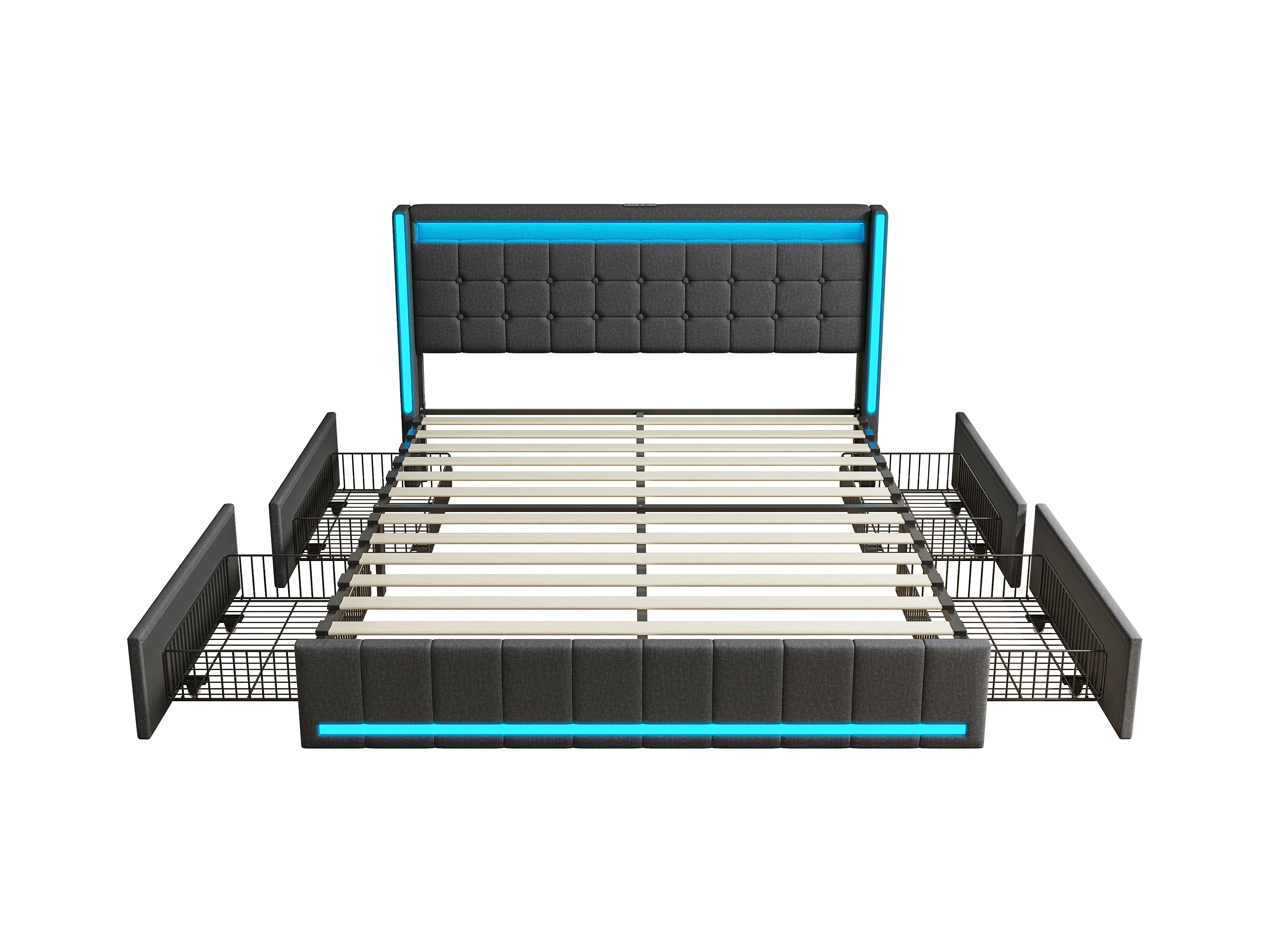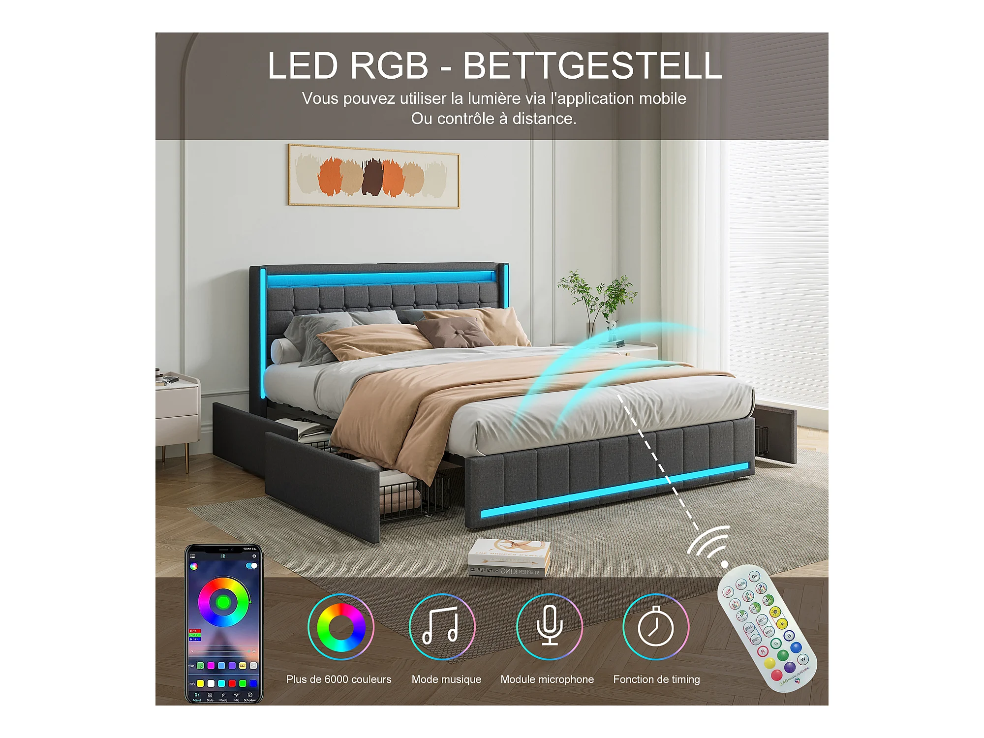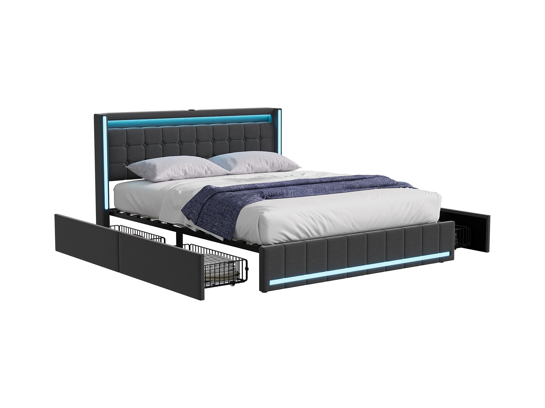 Lit double 140*200 cm, port de chargement USB de chevet, lumière LED, avec 4 tiroirs en fer, gris foncé, lin