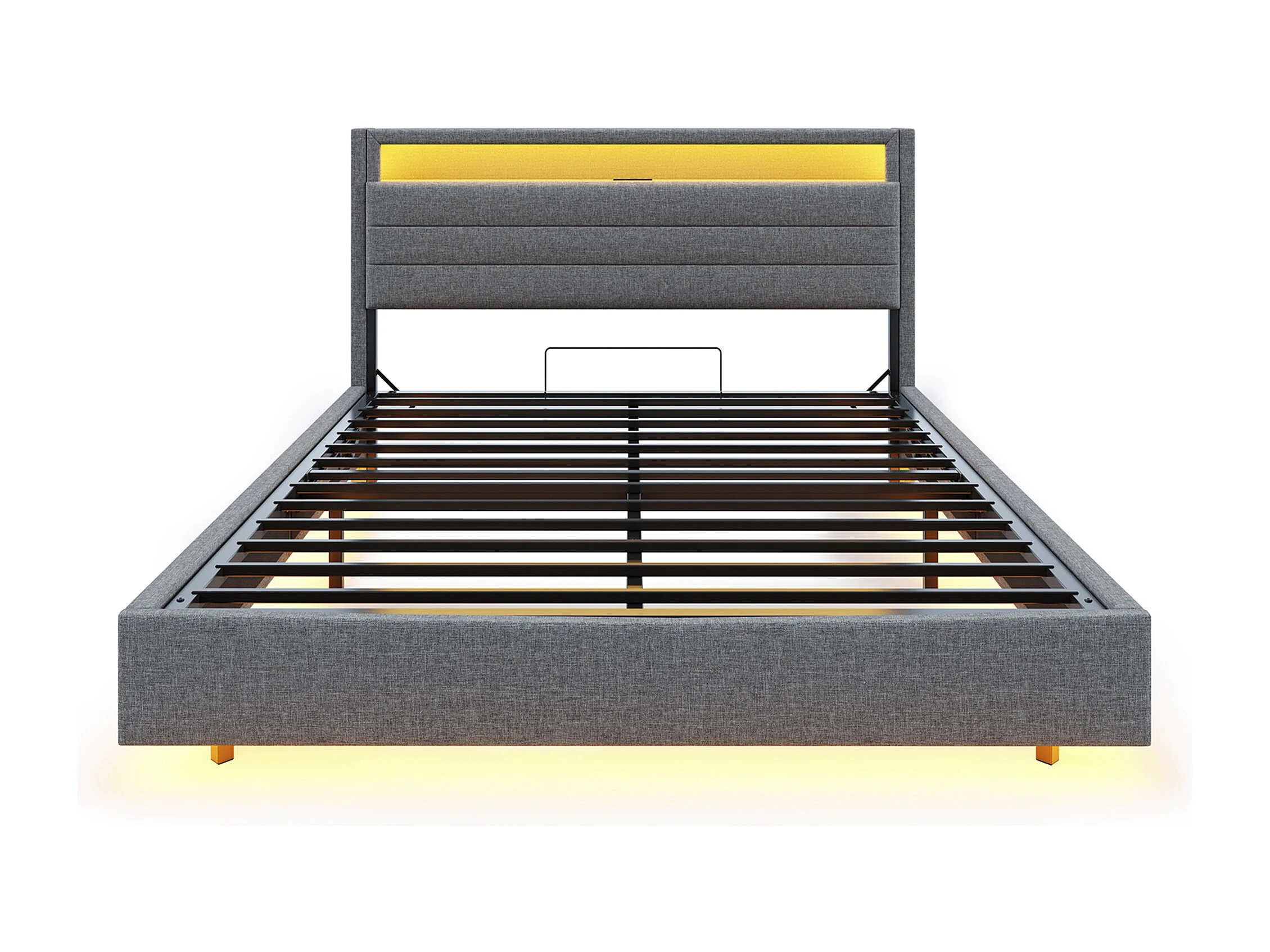 Lit double 140×200 cm avec rangement, éclairage LED, port USB et prise Type-C – Tissu gris avec vérins à gaz