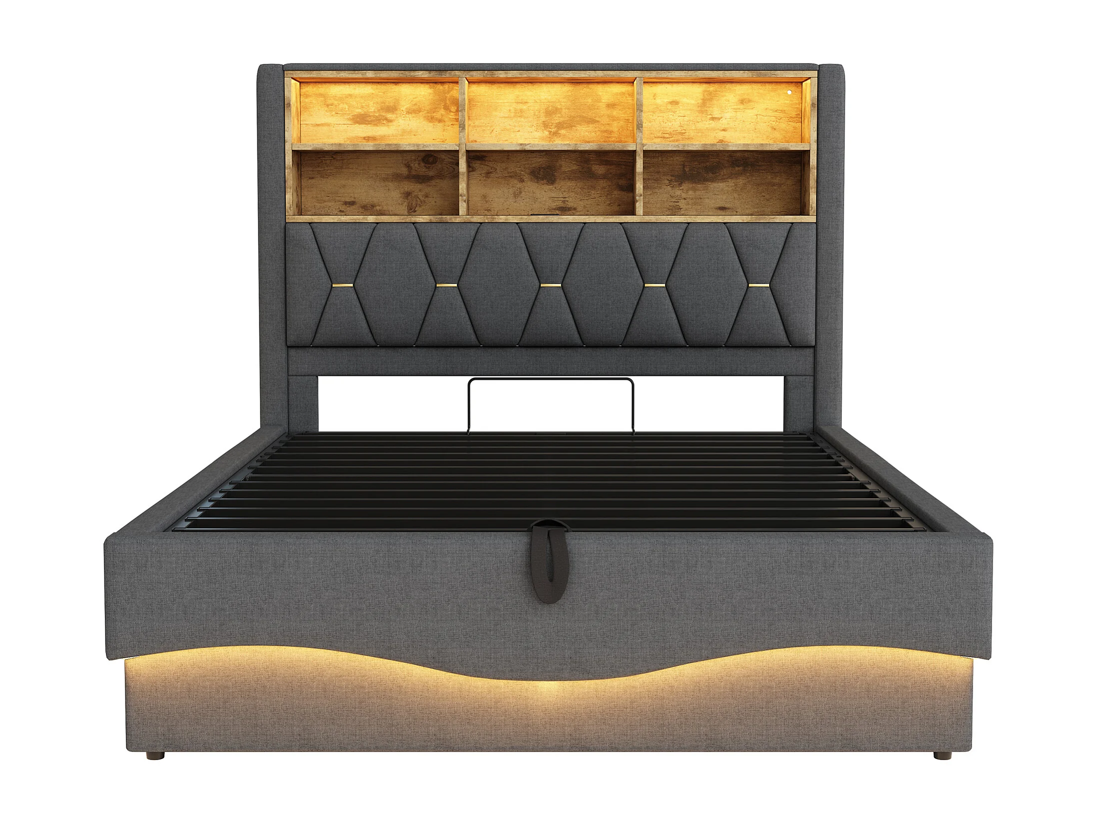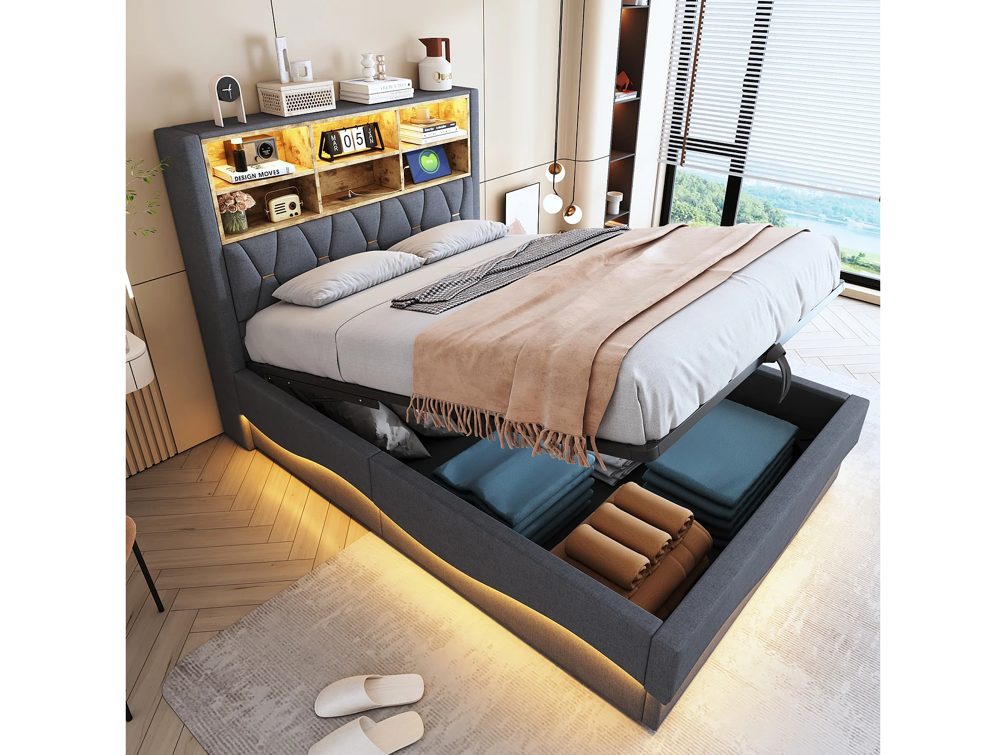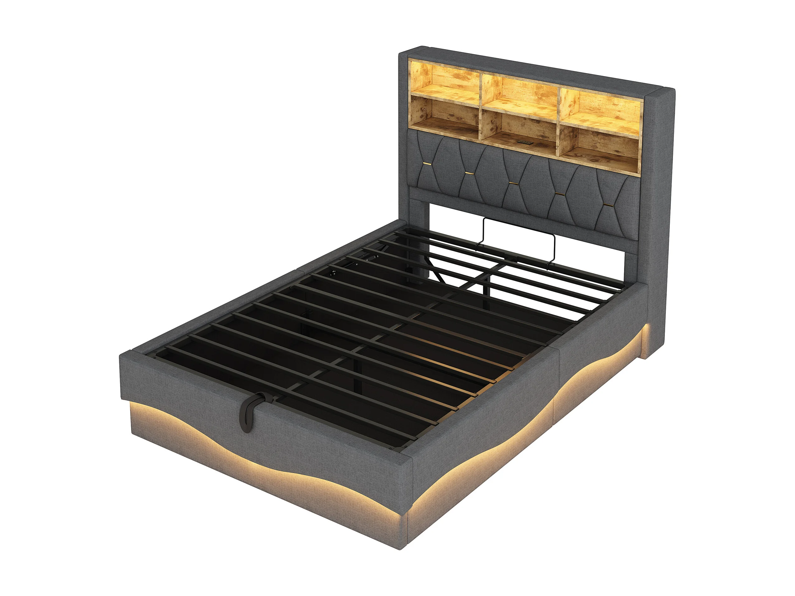 Lit 140x200 cm gris avec rangement hydraulique, LED via APP, port USB, sommier métallique, rembourrage en lin