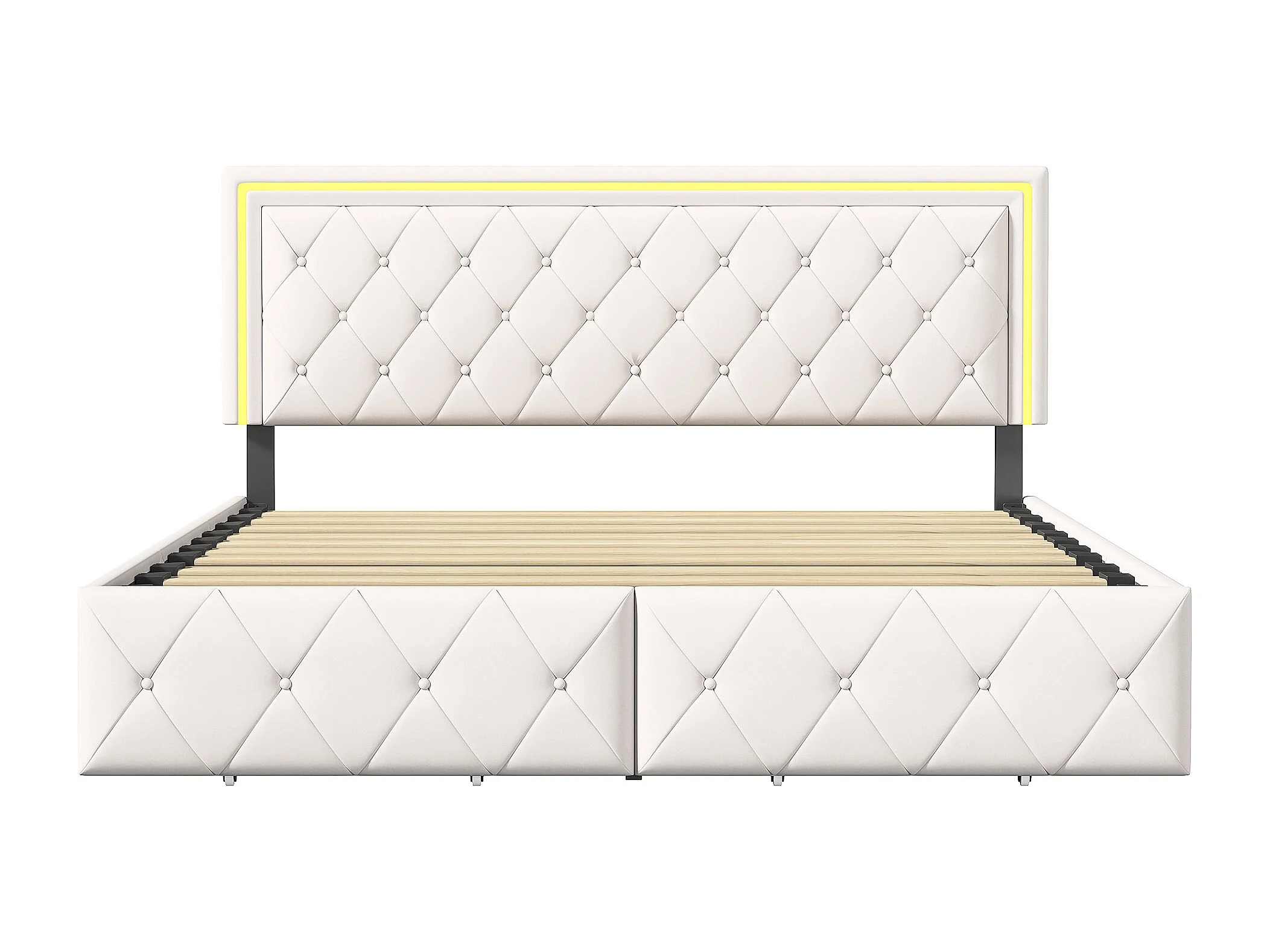 Lit Adulte Double 140x200 Cm, 4 Tiroirs, Rembourré Avec Lumière LED, Sommier à Lattes, Pu Blanc.