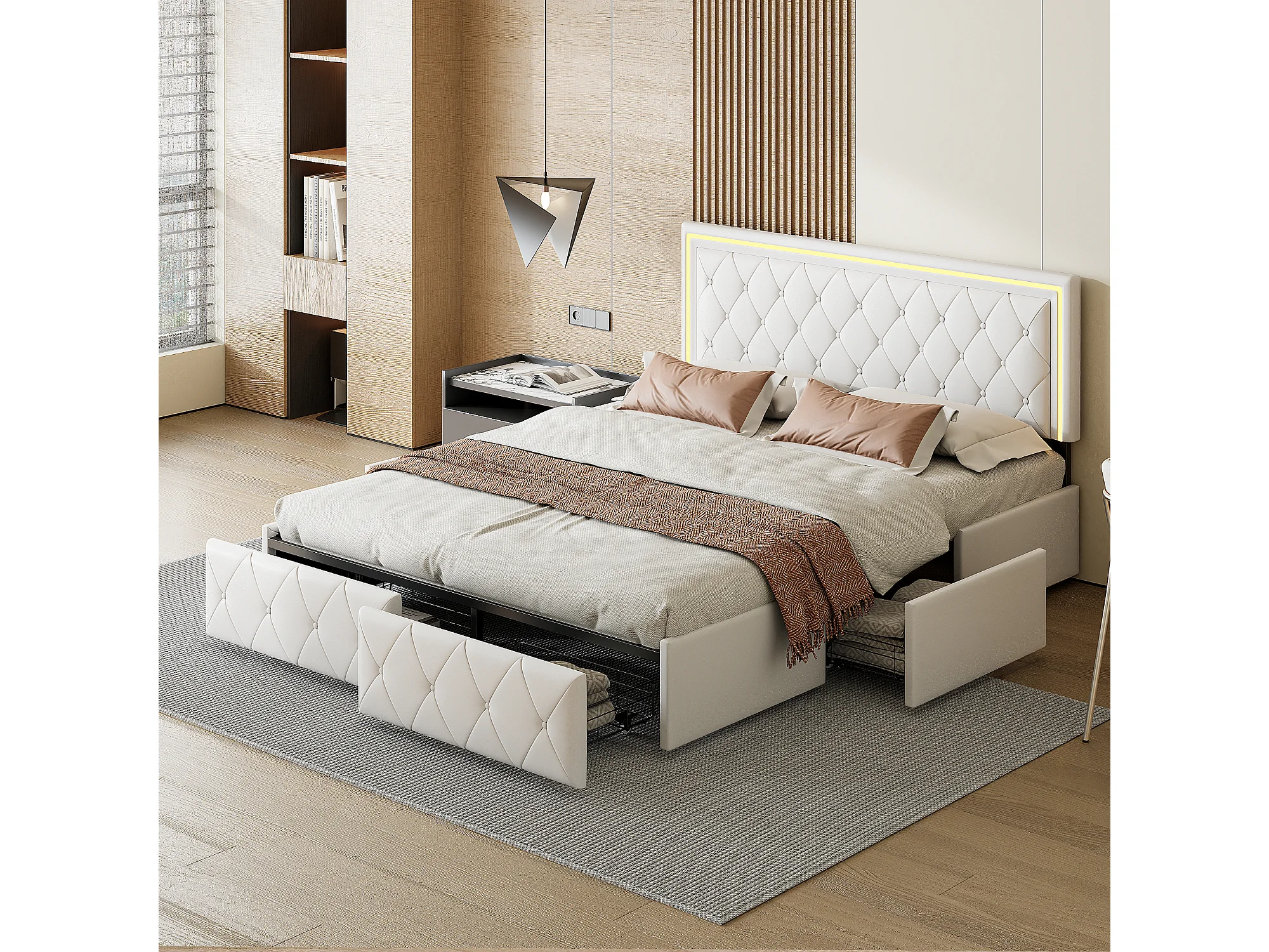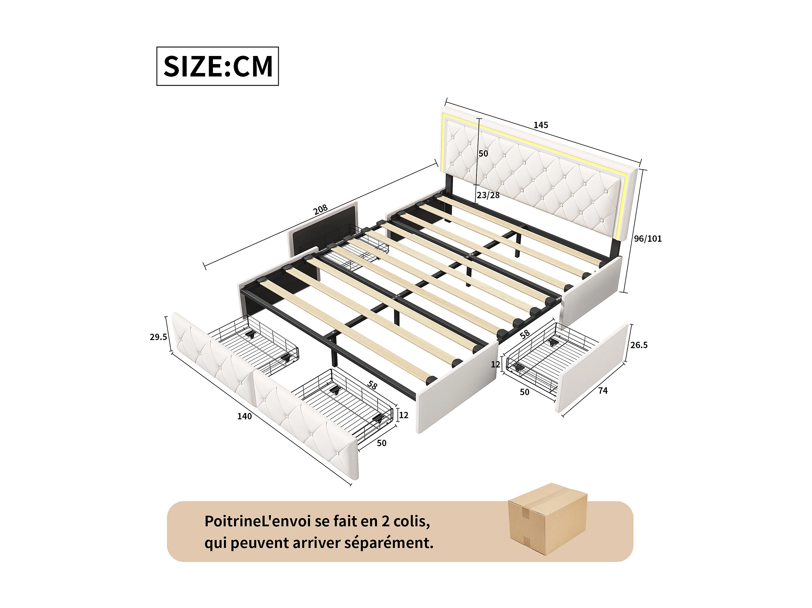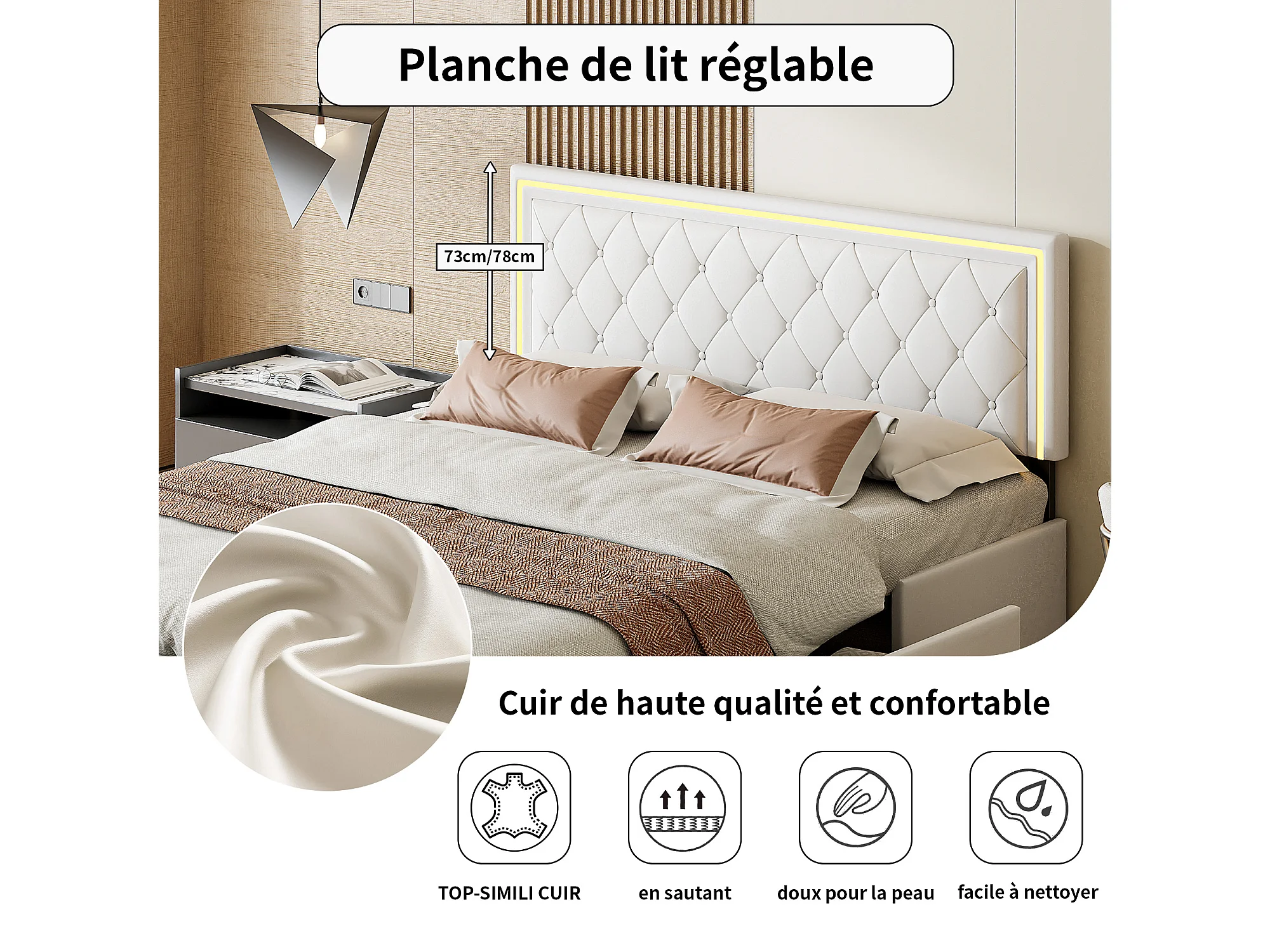 Lit 140x200cm avec LED tête de lit relevable, Lit capitonné avec 4 tiroirs et Rangement Lit, Blanc