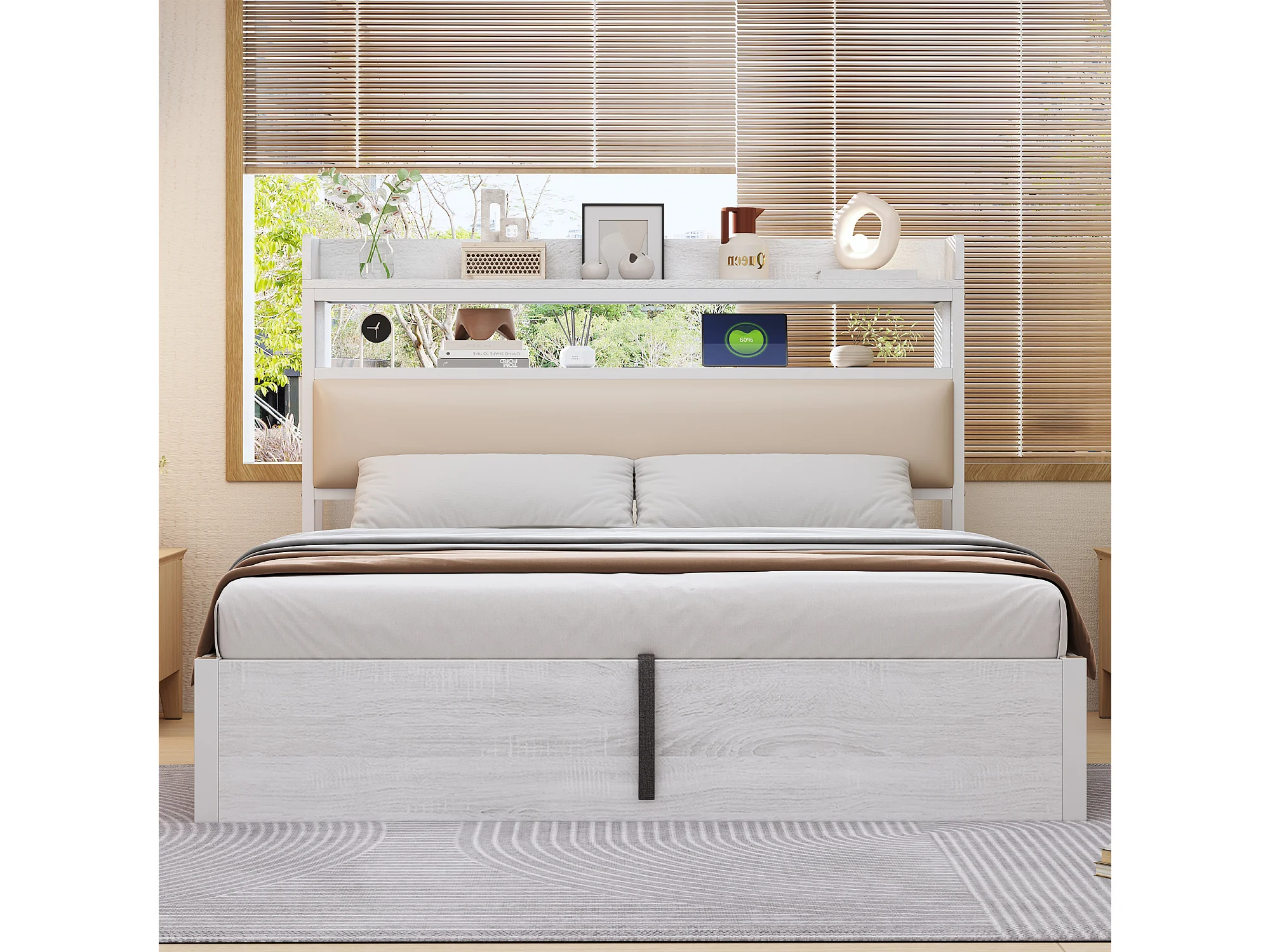 Lit 180x200 cm, cadre avec levage hydraulique, USB, tête rembourrée, design bois et métal, rangement caché, lit double, blanc