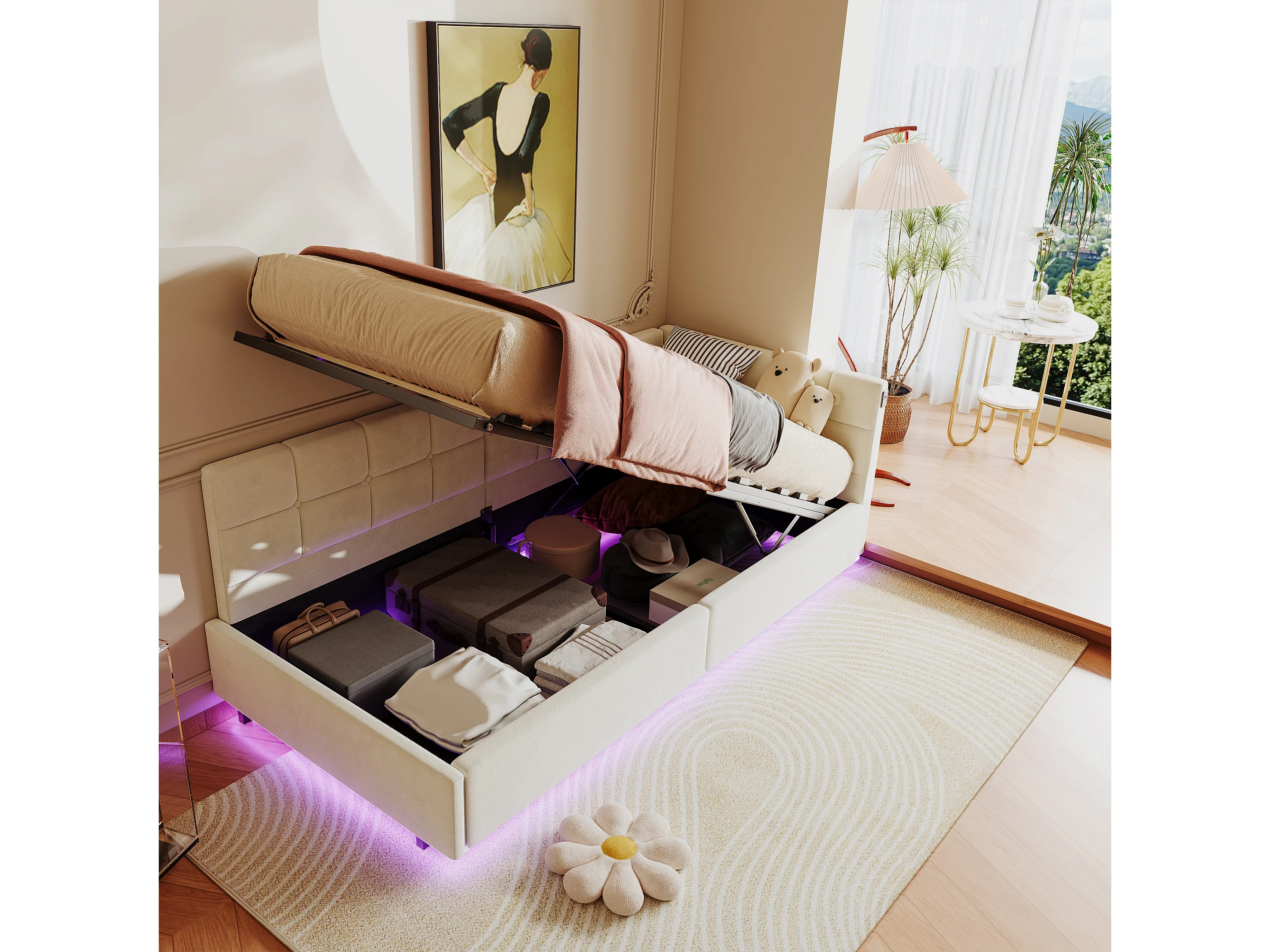 Lit 90×200 cm avec tête de lit LED et rangement, charge USB & Type-C, éclairage RGB avec télécommande – Design en tissu velours beige