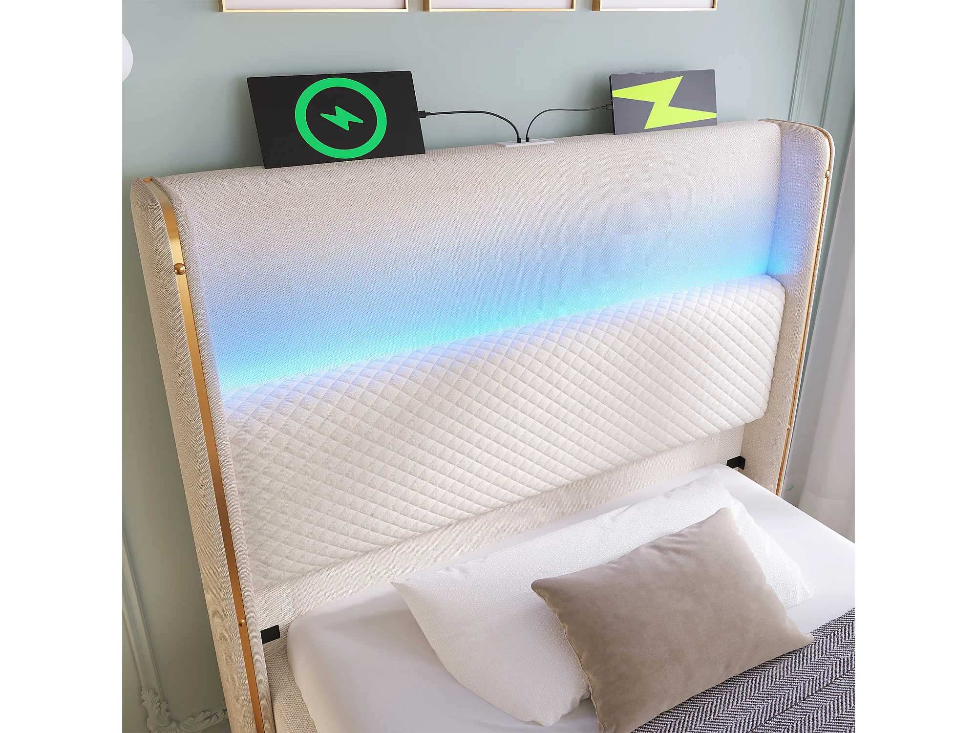 Lit à rangement hydraulique 90x200 cm avec tête haute, LED, USB/Type-C, tissu lin beige (Avec matelas)