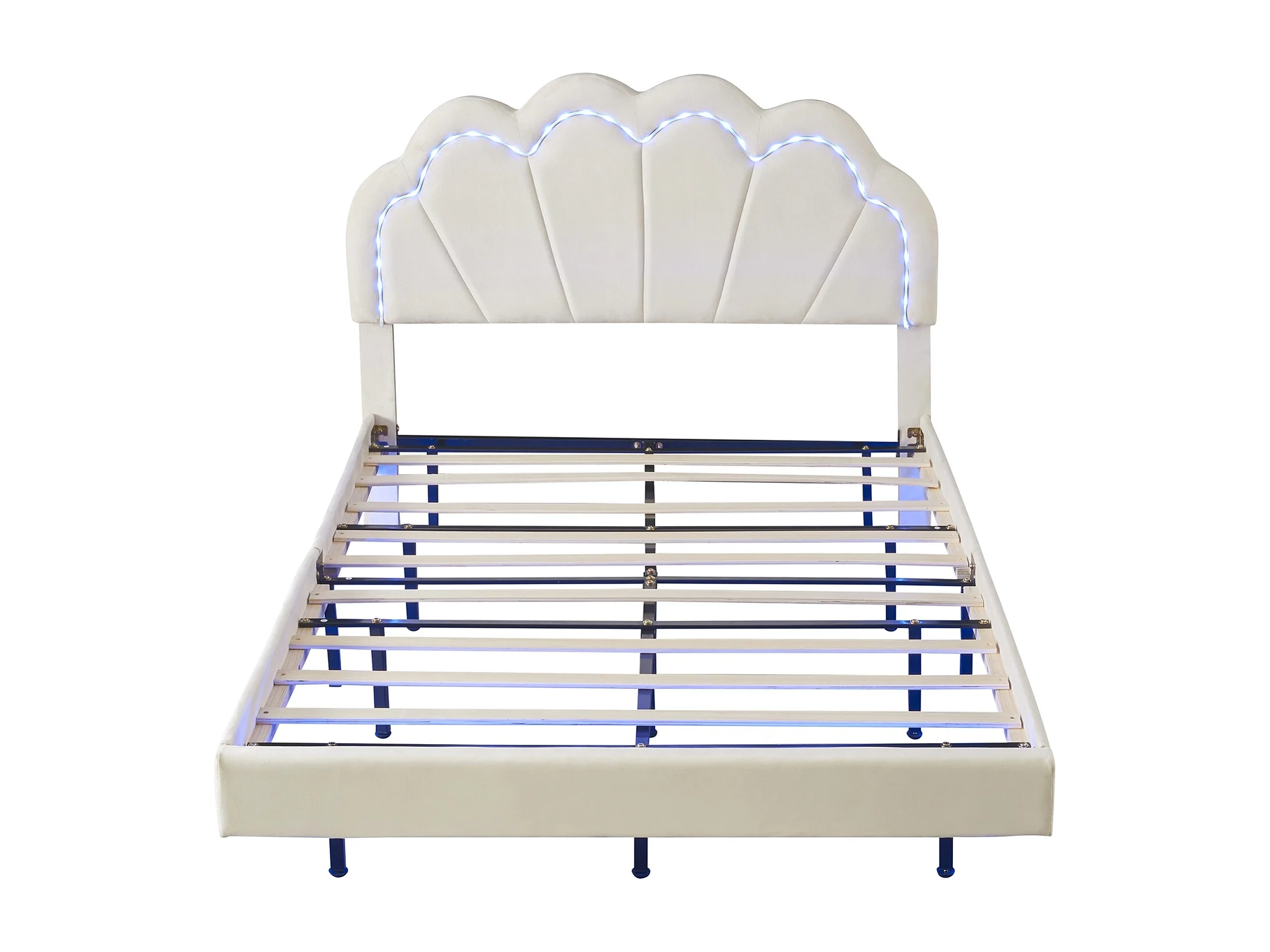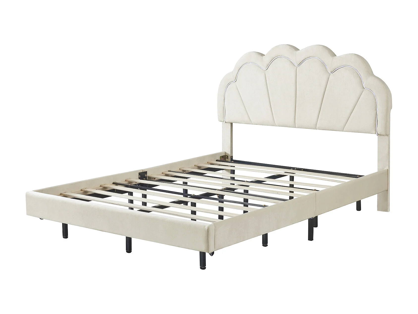 Lit adulte 140 x 200 cm avec éclairage LED, tête de lit en forme de pétale, velours, beige
