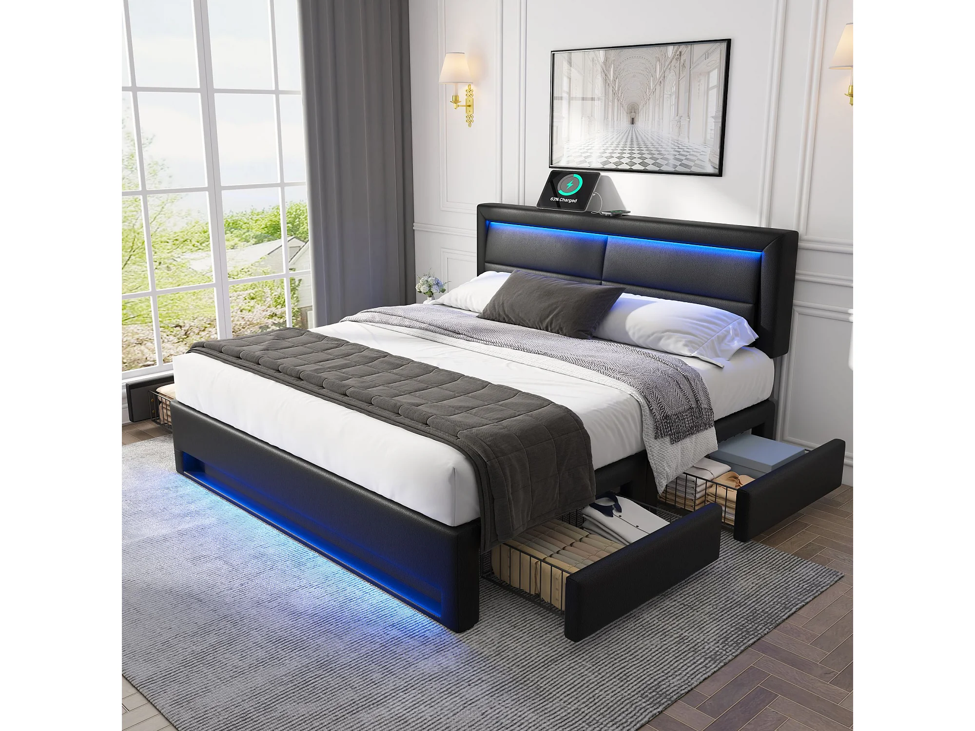 Lit adulte 140x190 cm avec recharge USB filaire et sans fil, LED, 4 tiroirs, PU noir (Sans matelas)
