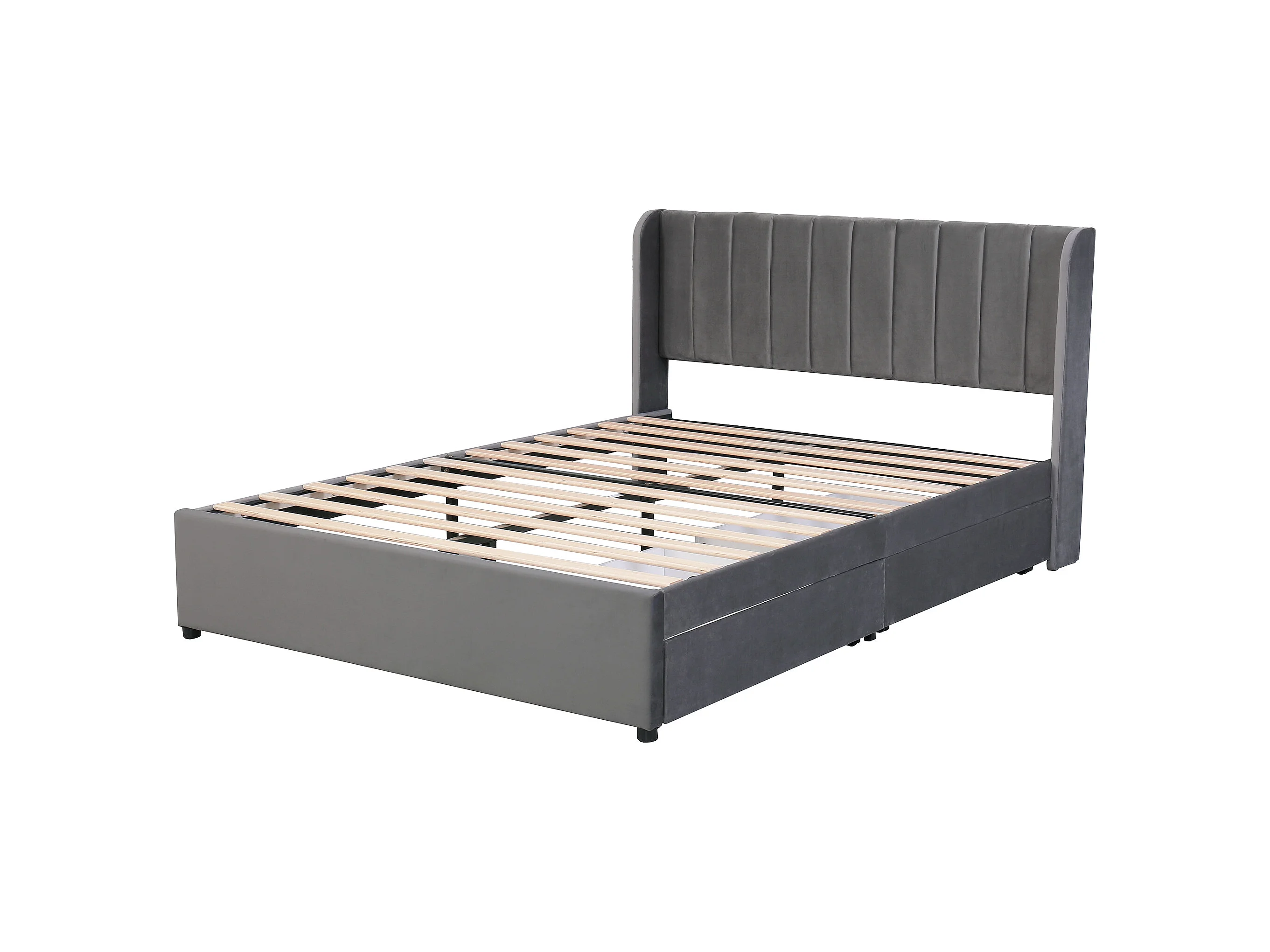 Lit adulte 140x200 cm avec sommier et 2 tiroirs de rangement - tête de lit capitonnée - velours - gris (sans matelas)