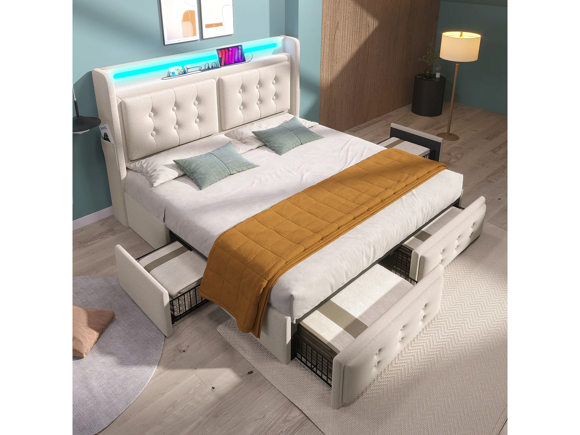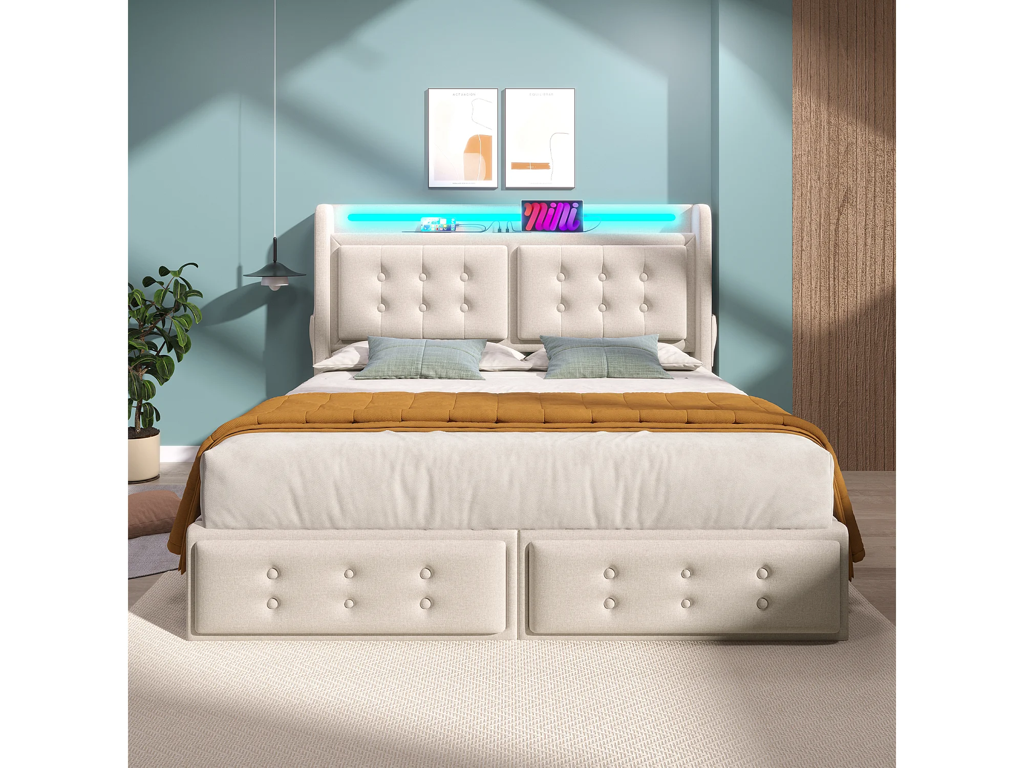Lit adulte 140x200 cm avec sommier et 4 tiroirs - tête de lit rembourrée LED et USB - coton - beige (sans matelas)
