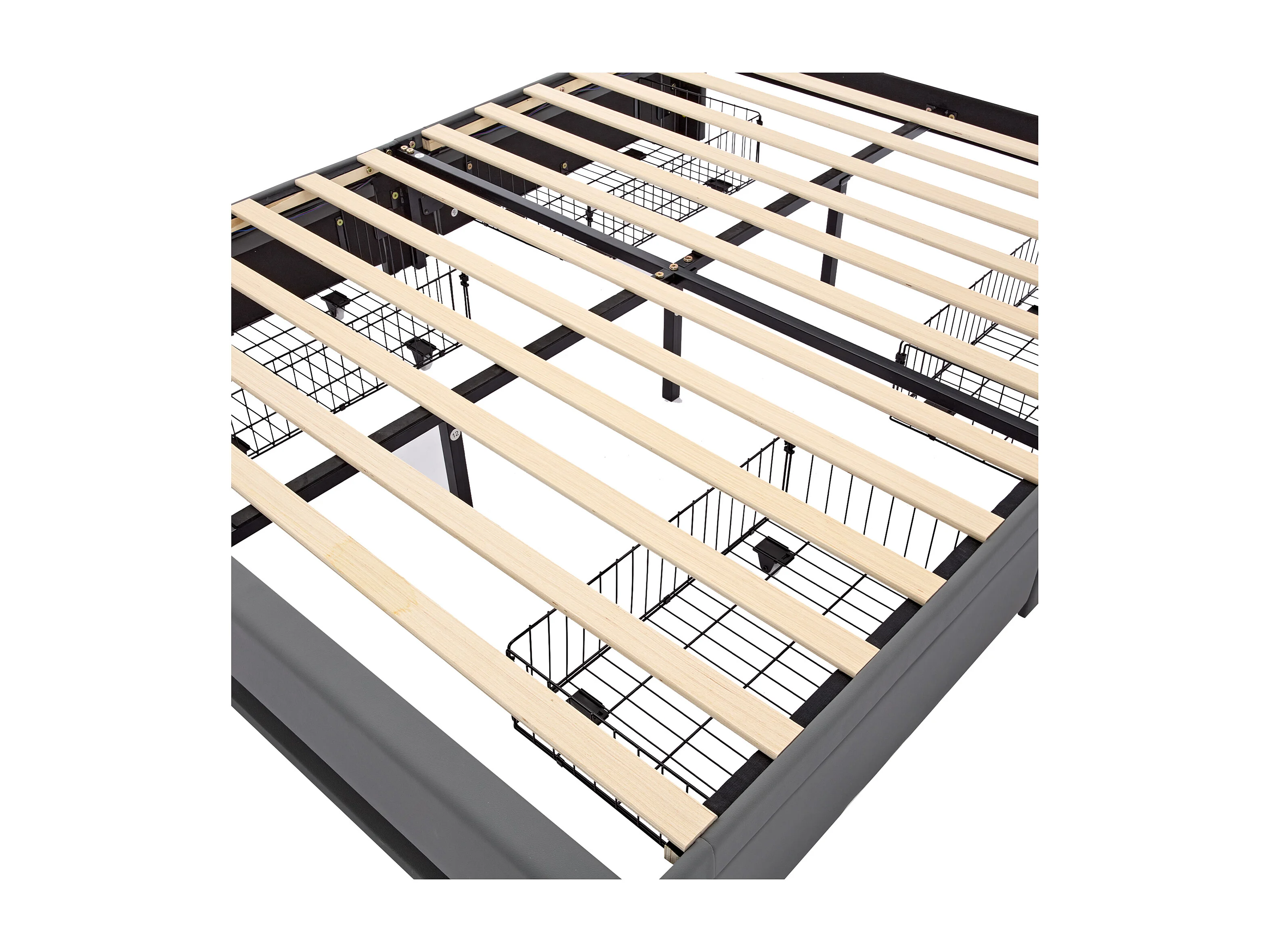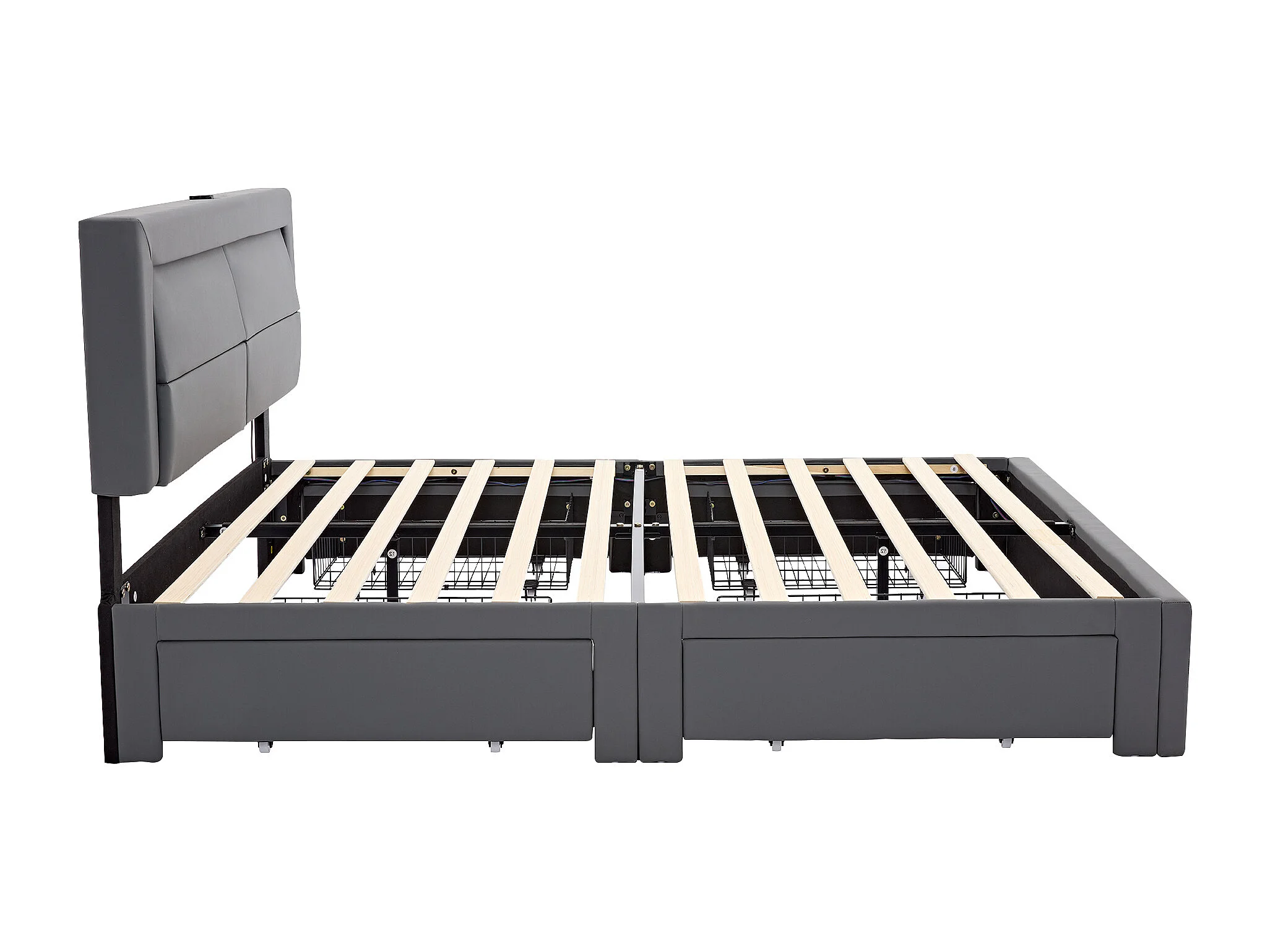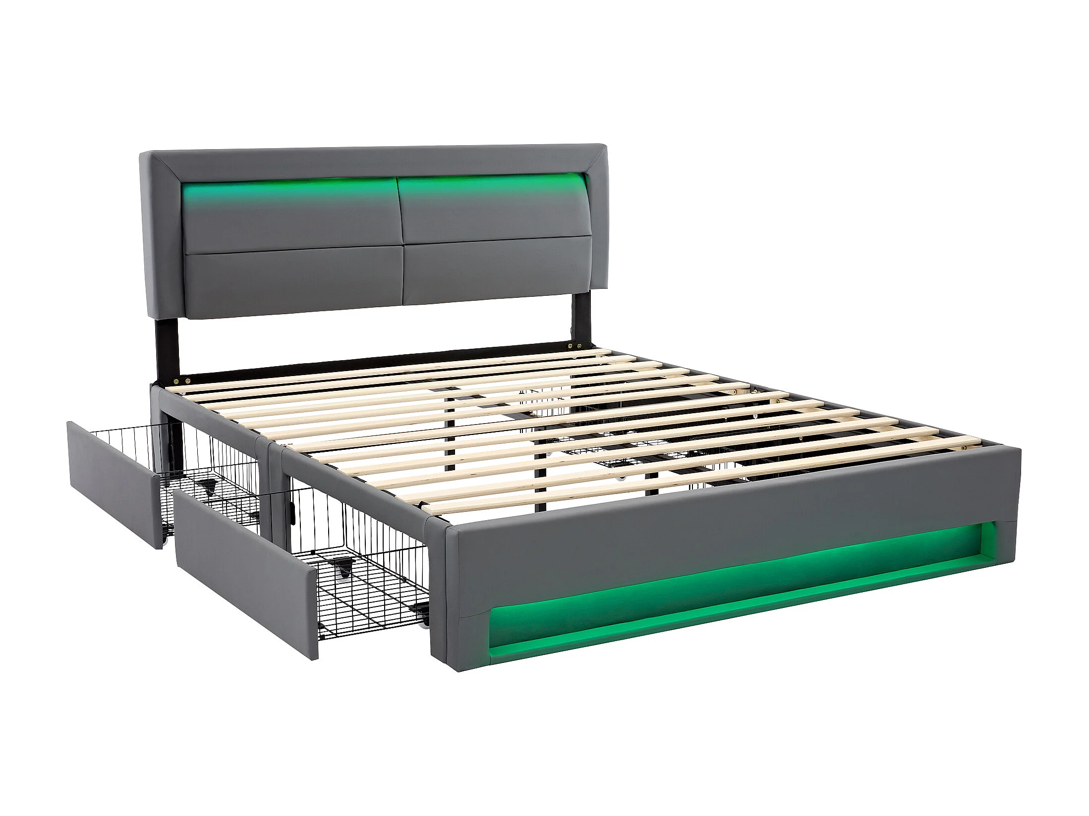 Lit double 140x200 cm avec ports USB, éclairage LED et 4 tiroirs PU gris (Sans matelas)