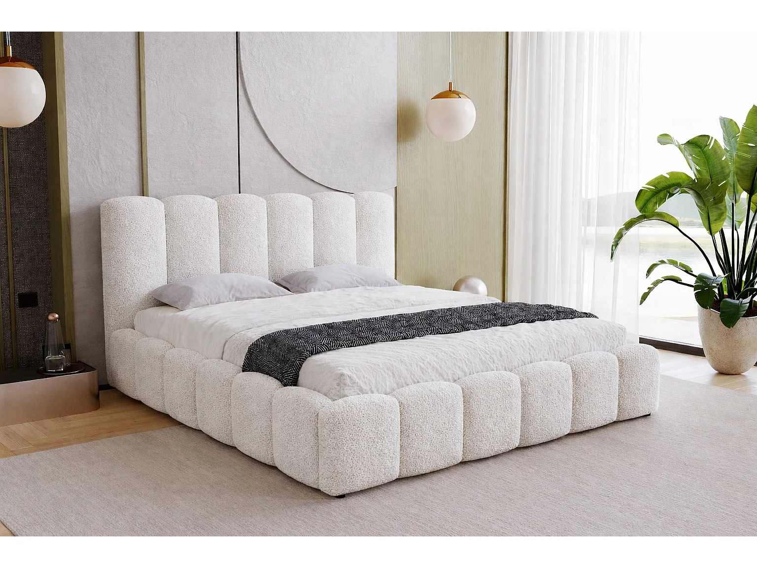 Lit adulte 140x200 cm Florent avec rangement, tete de lit, sommier - tissu bouclé, Crème (Lambi 1)