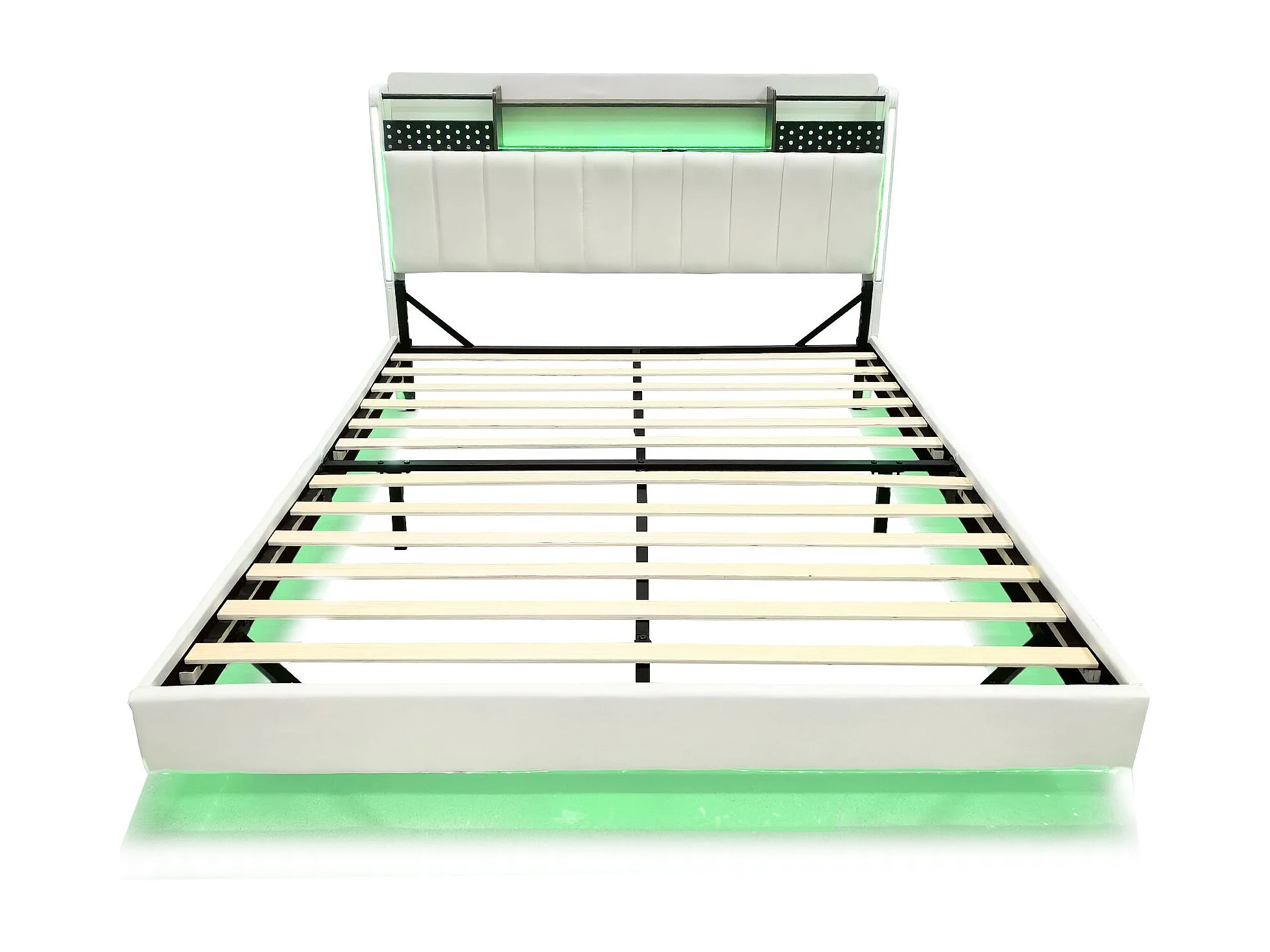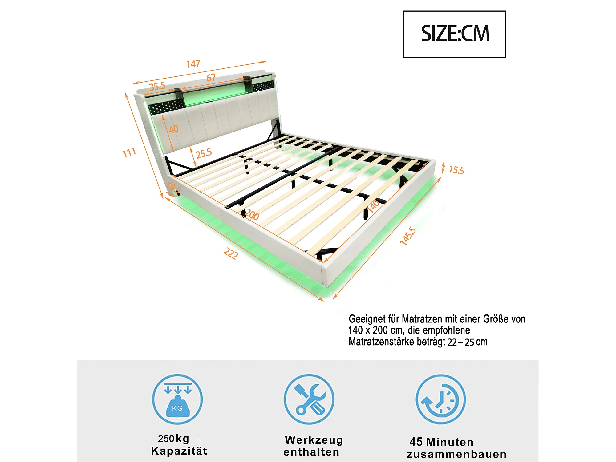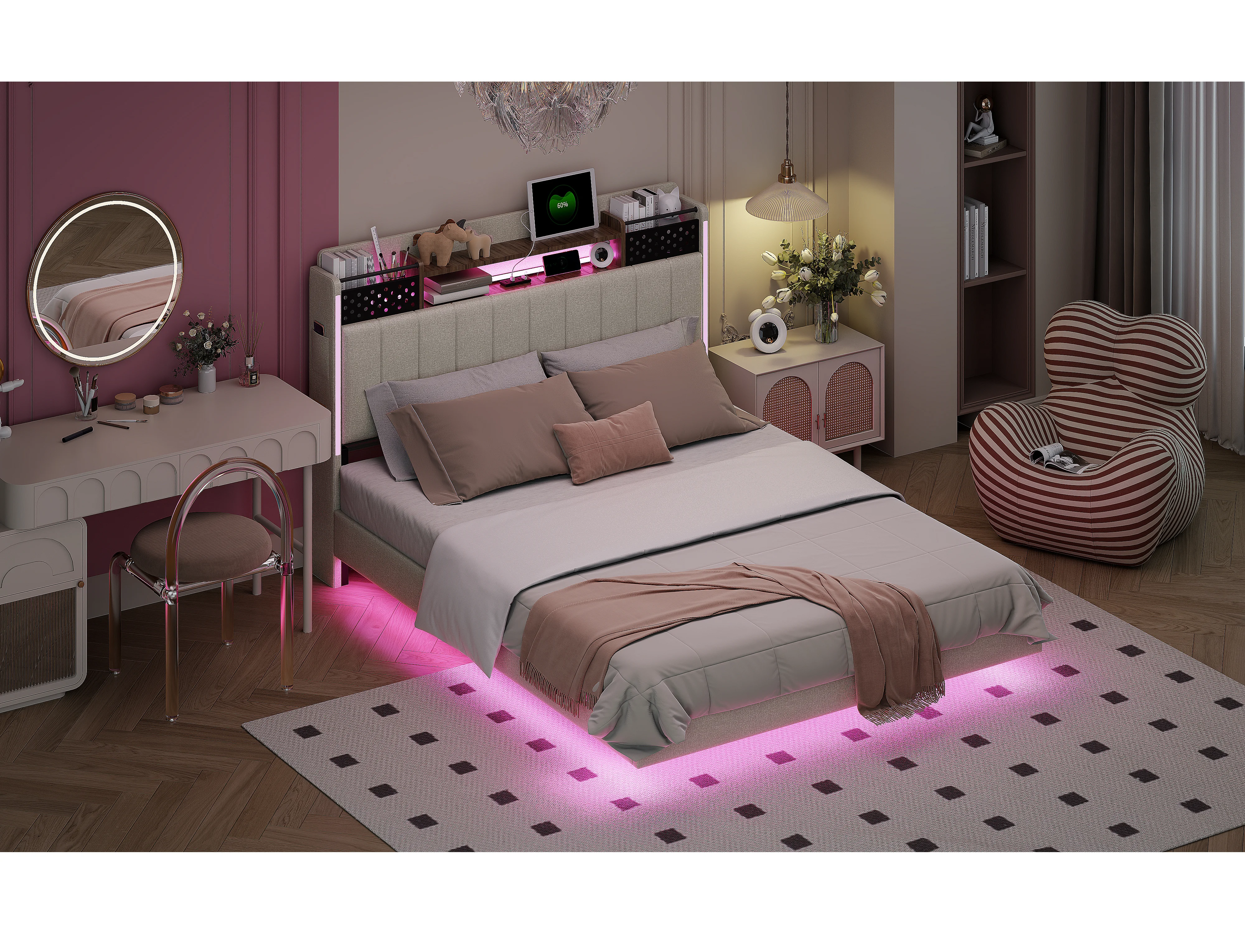 Lit adulte 140x200cm beige en lin avec tête de lit de rangement, LED et USB, designe flottant, sans matelas