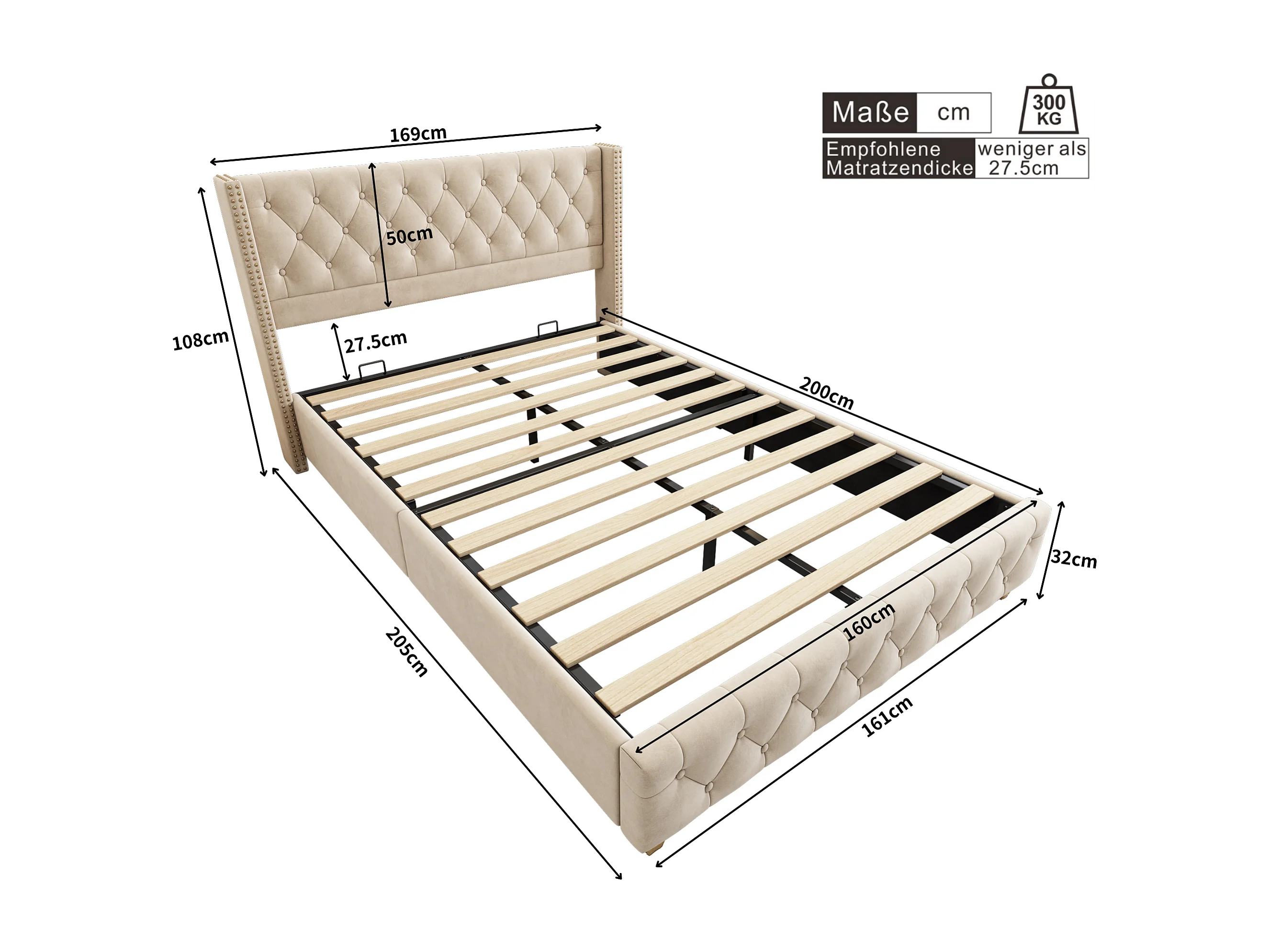 Lit adulte 160x200 cm avec sommier - tête de lit capitonnée - cadre de lit en bois - velours beige (sans matelas)