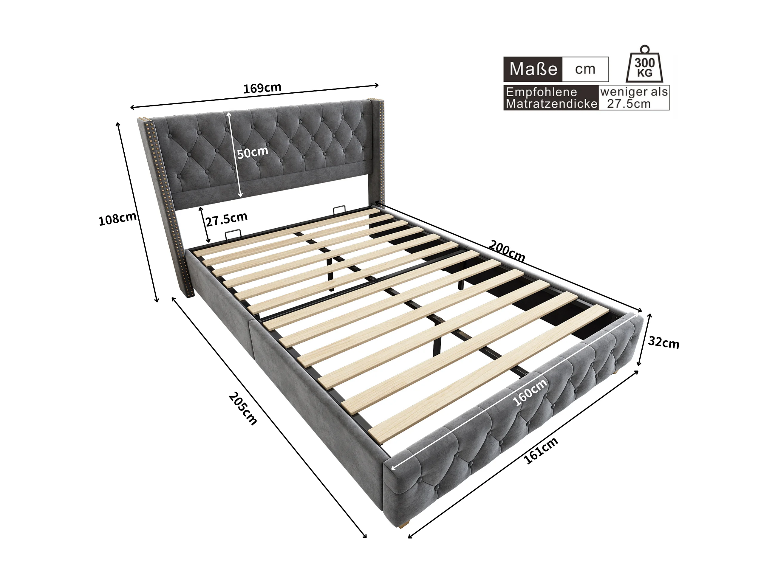 Lit adulte 160x200 cm avec sommier - tête de lit capitonnée - cadre de lit en bois - velours gris (sans matelas)