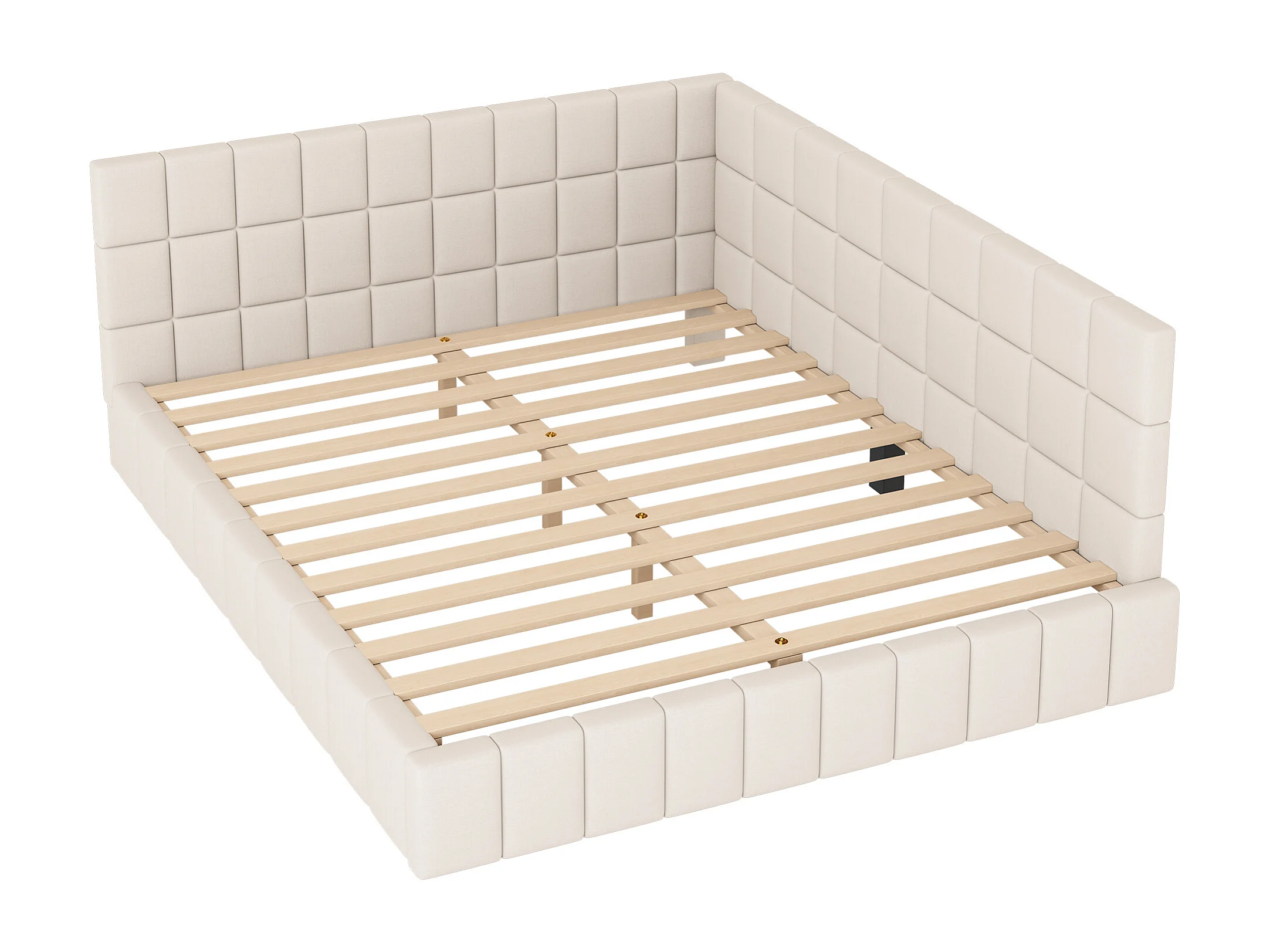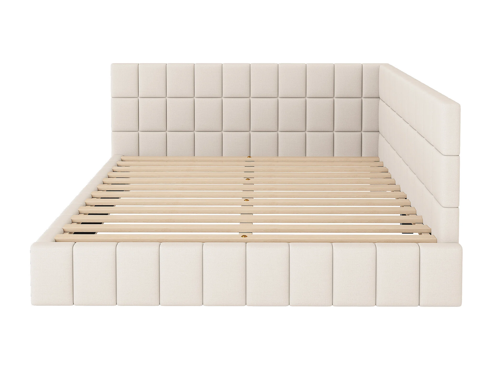 Lit adulte 160x200cm beige en velours, Sommier à lattes, 2 dossiers sans matelas