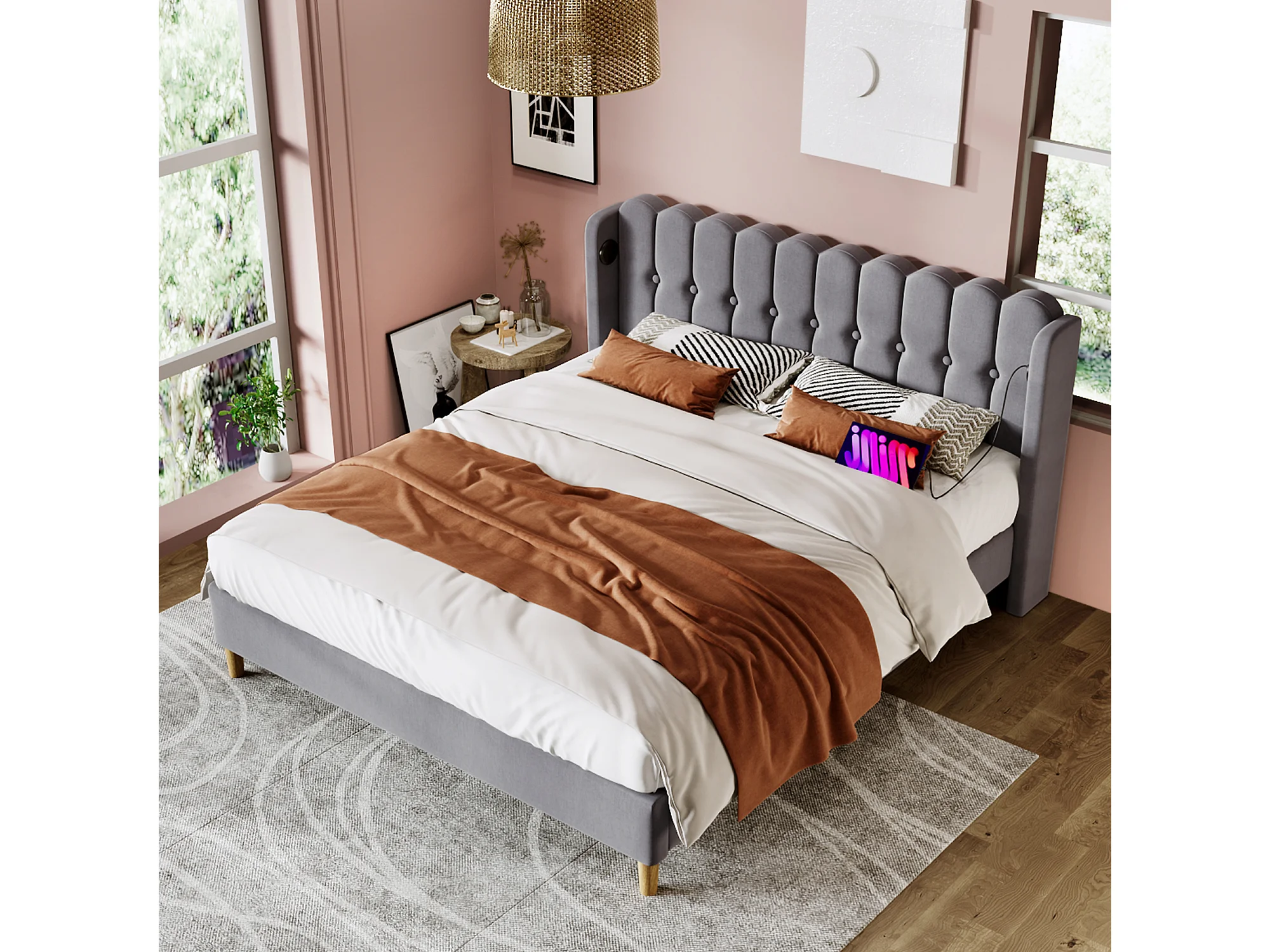 Lit capitonné 180 x 200 cm pour adulte - USB + type C - tissu en lin - gris