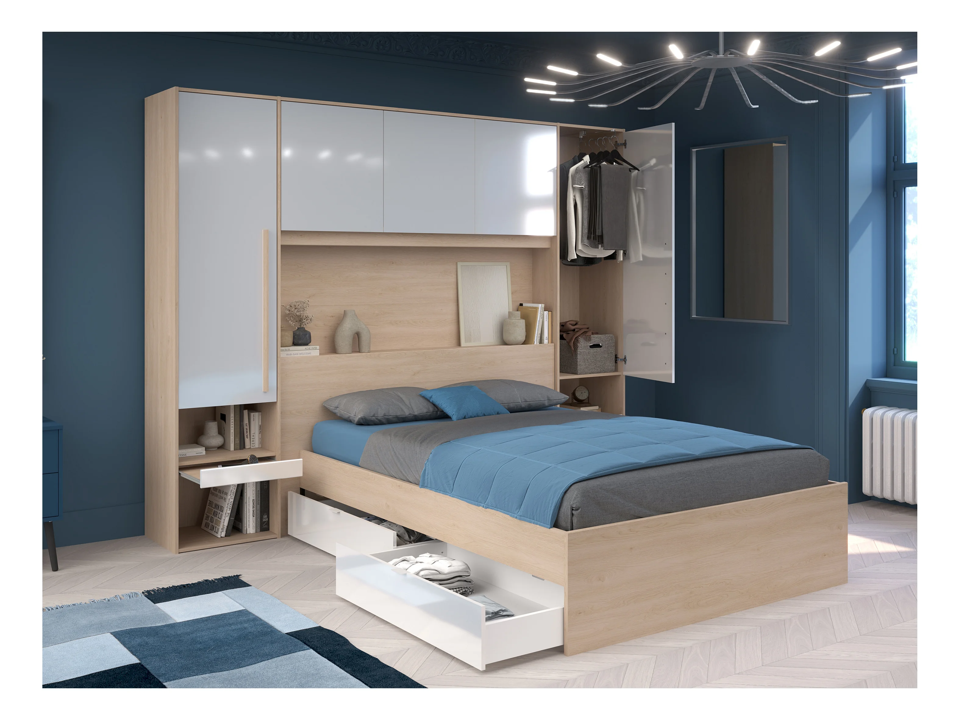 Lit pont 140 x 190 cm avec rangements - avec LEDs - Coloris : Naturel et blanc brillant + Sommier - VELONA