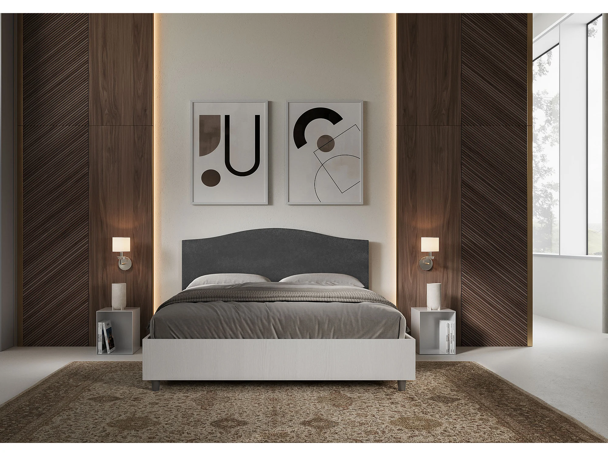 Lit avec sommier 160x190 structure frêne blanc tête de lit microfibre gris Grace