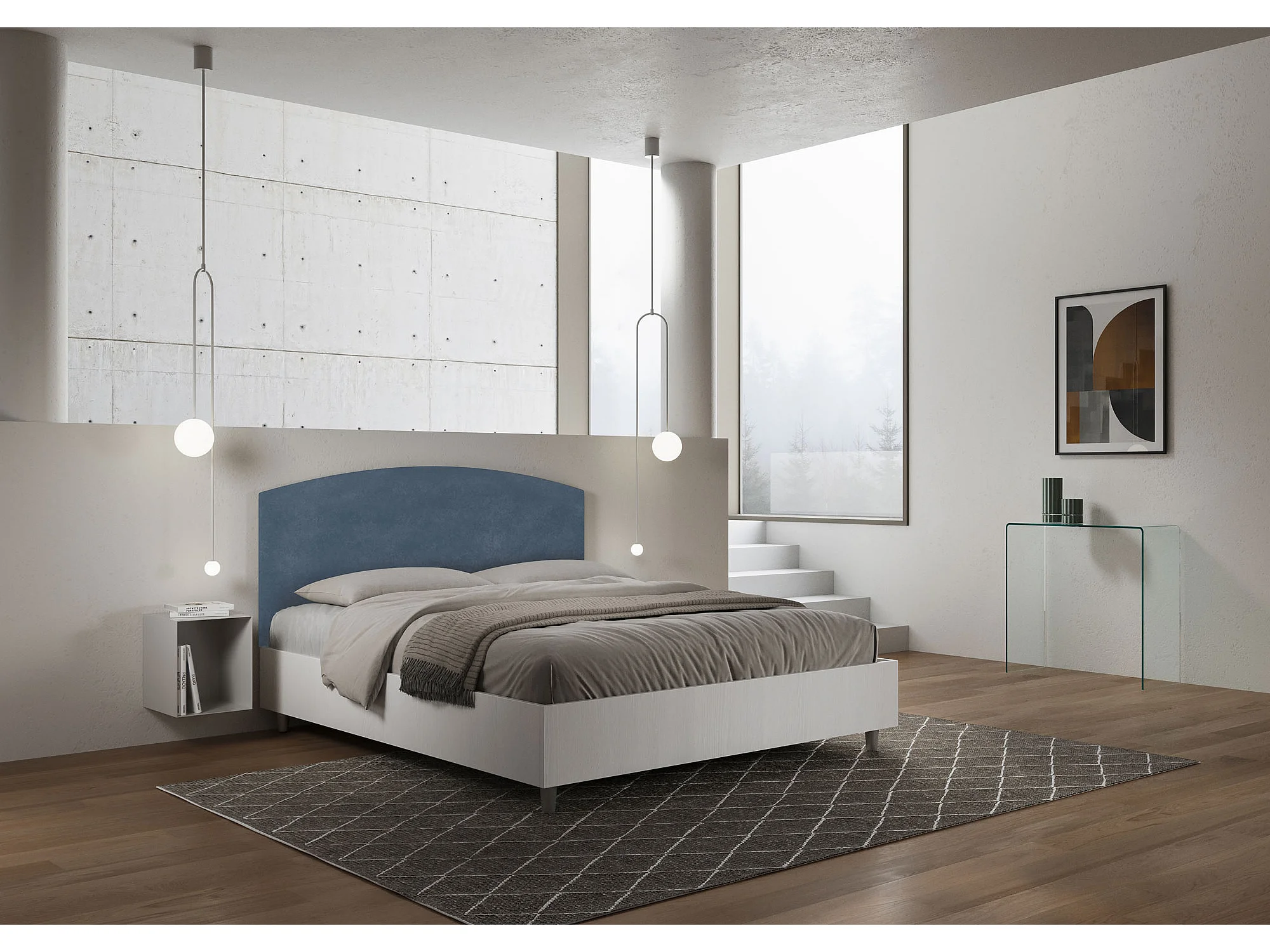 Lit avec sommier 160x200 structure frêne blanc tête de lit microfibre bleu Antilia