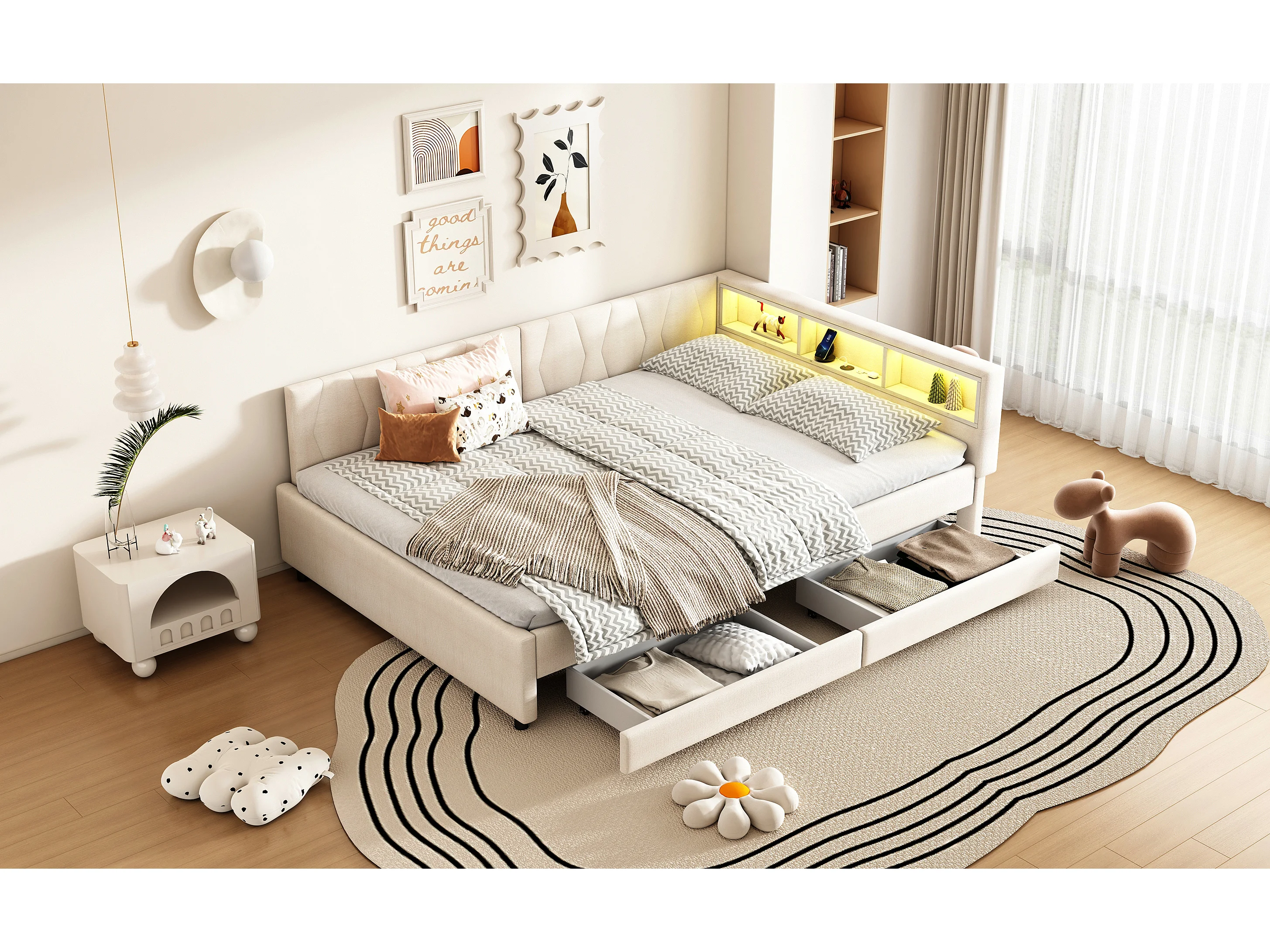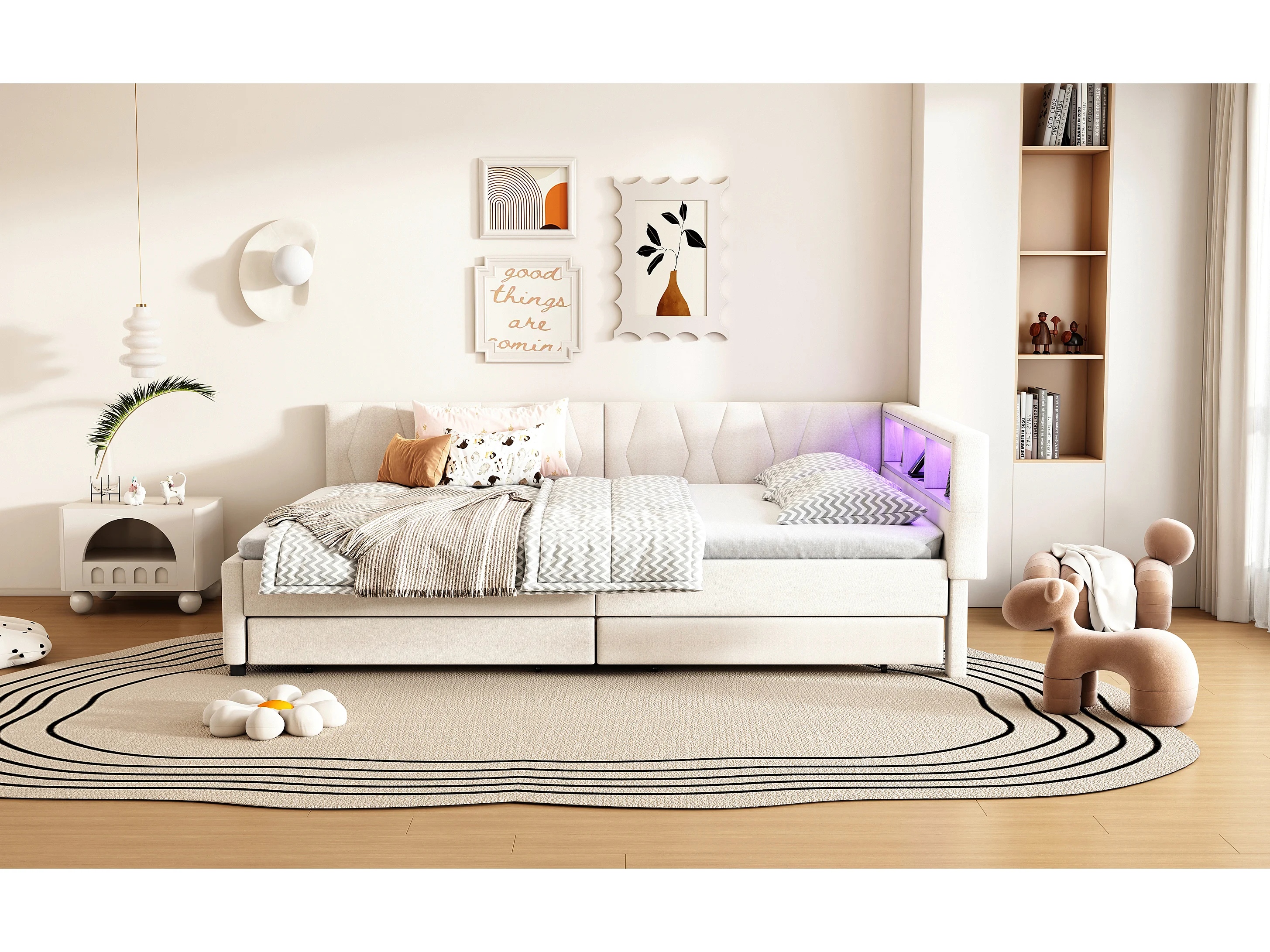 Lit banquette 140x200 cm beige avec LED, télécommande, ports USB et Type-C, deux tiroirs et tête de lit avec rangement