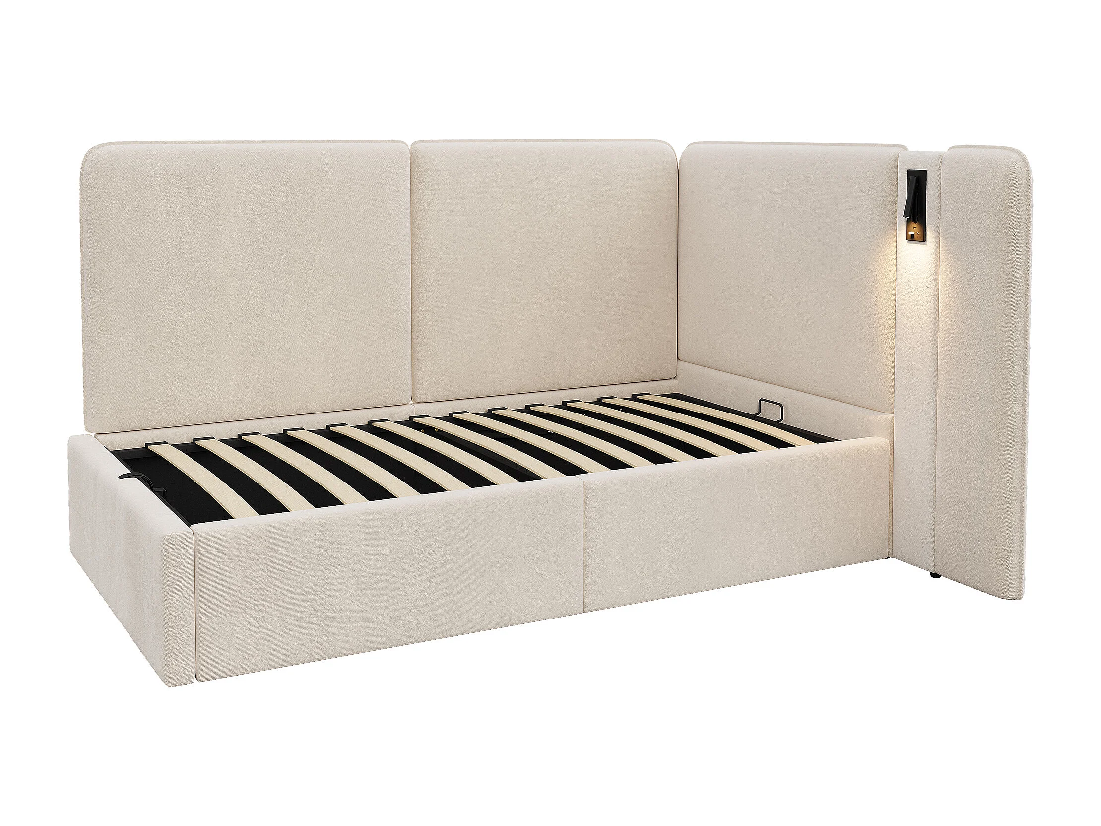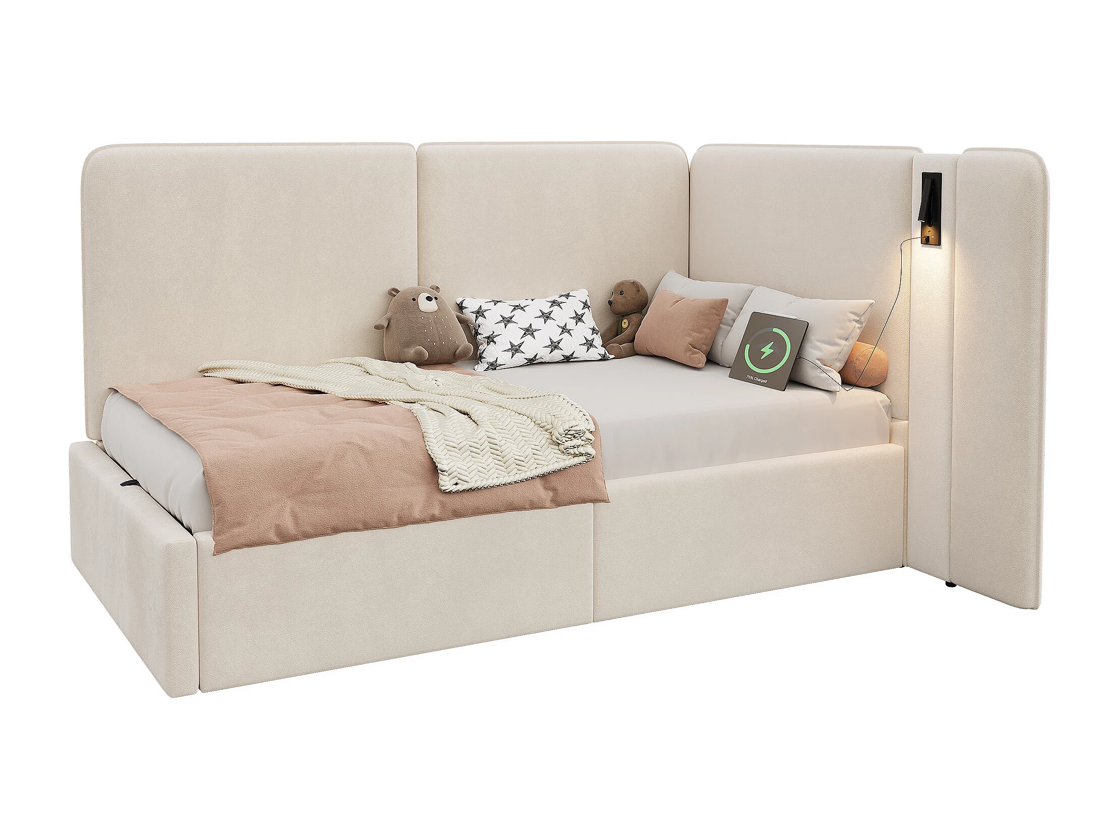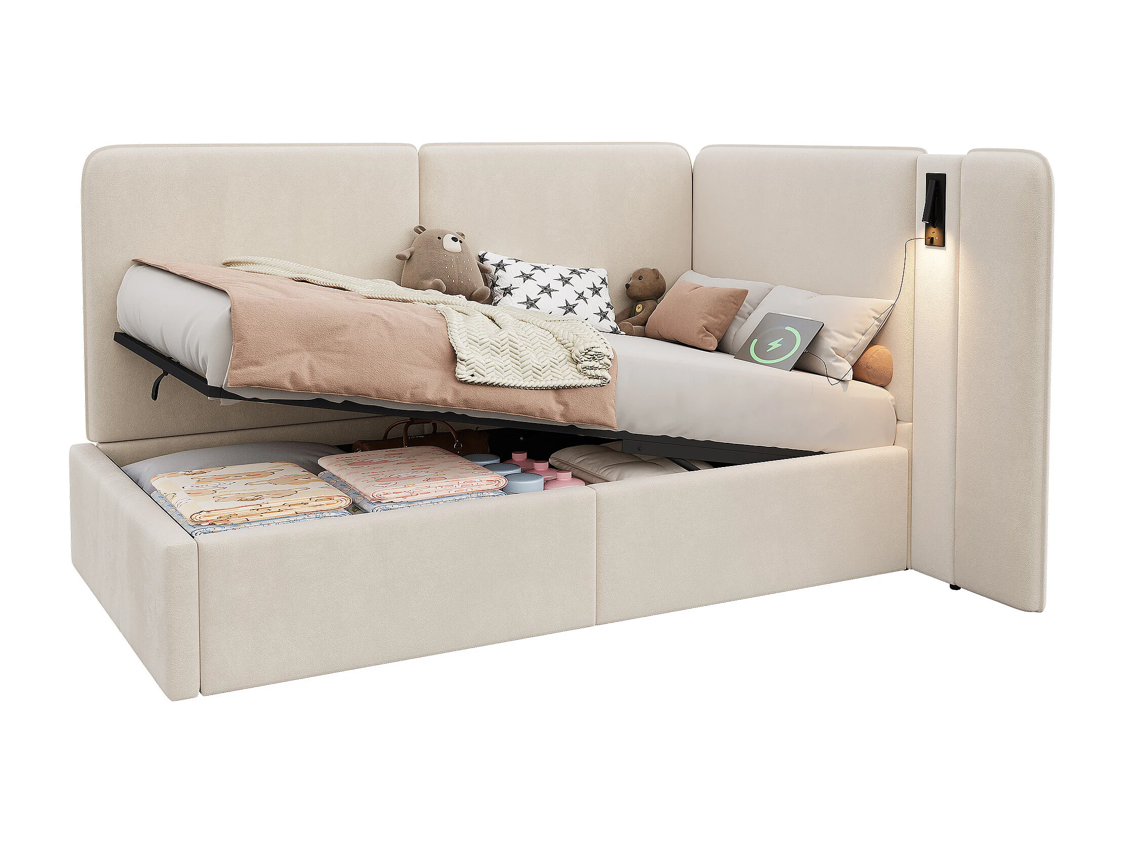Lit banquette capitonné pour enfant - 90 x 200 cm - avec rangement hydraulique + USB + lampe de lecture - velours - beige