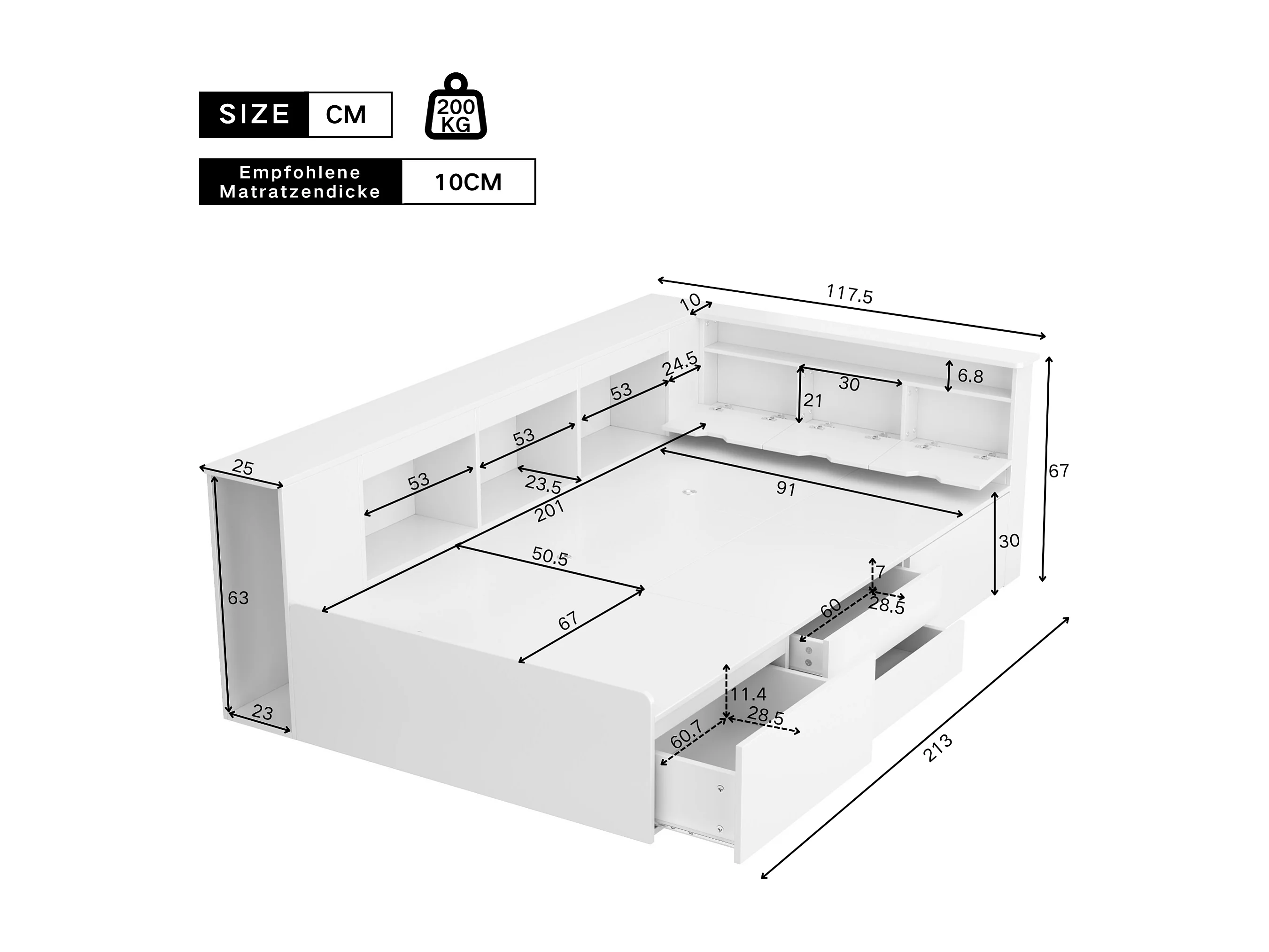 Lit banquette enfant 90x200cm avec 4 tiroirs et compartiments de rangement - MDF - Blanc