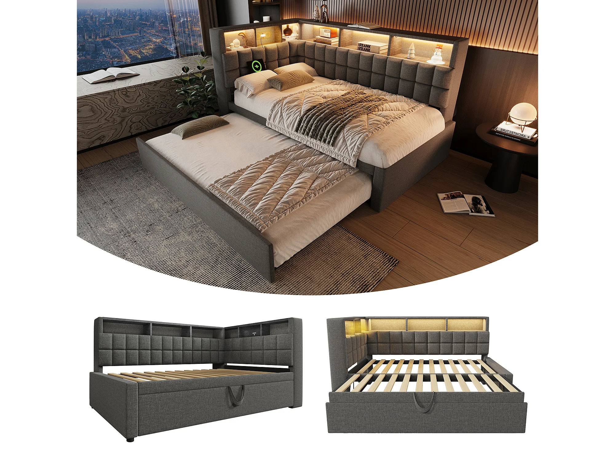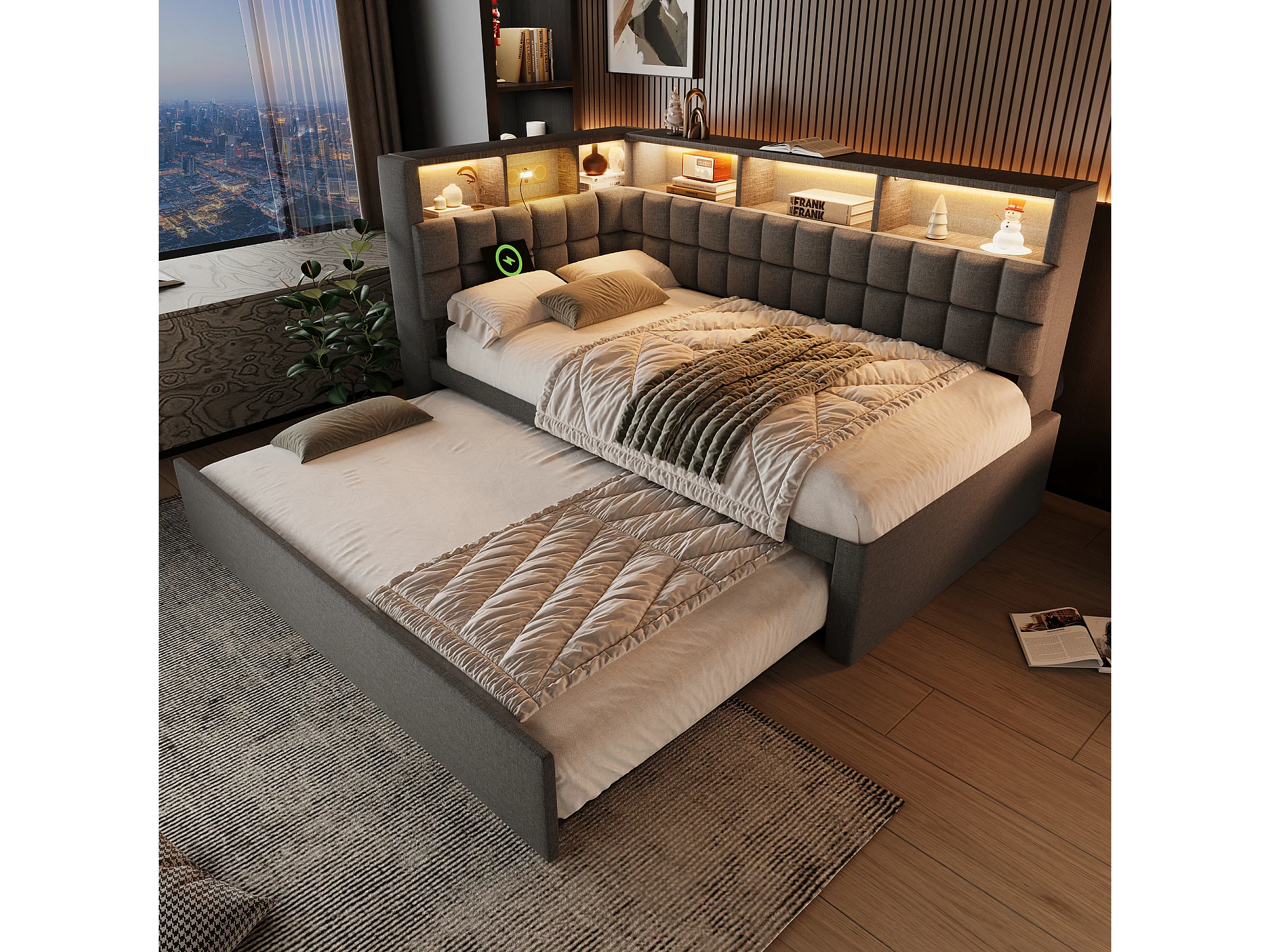 Lit banquette rembourré - 90 x 200 cm - avec lit gigogne 90 x 190 cm + Leds + USB + tête de lit L avec rangement - lin - gris