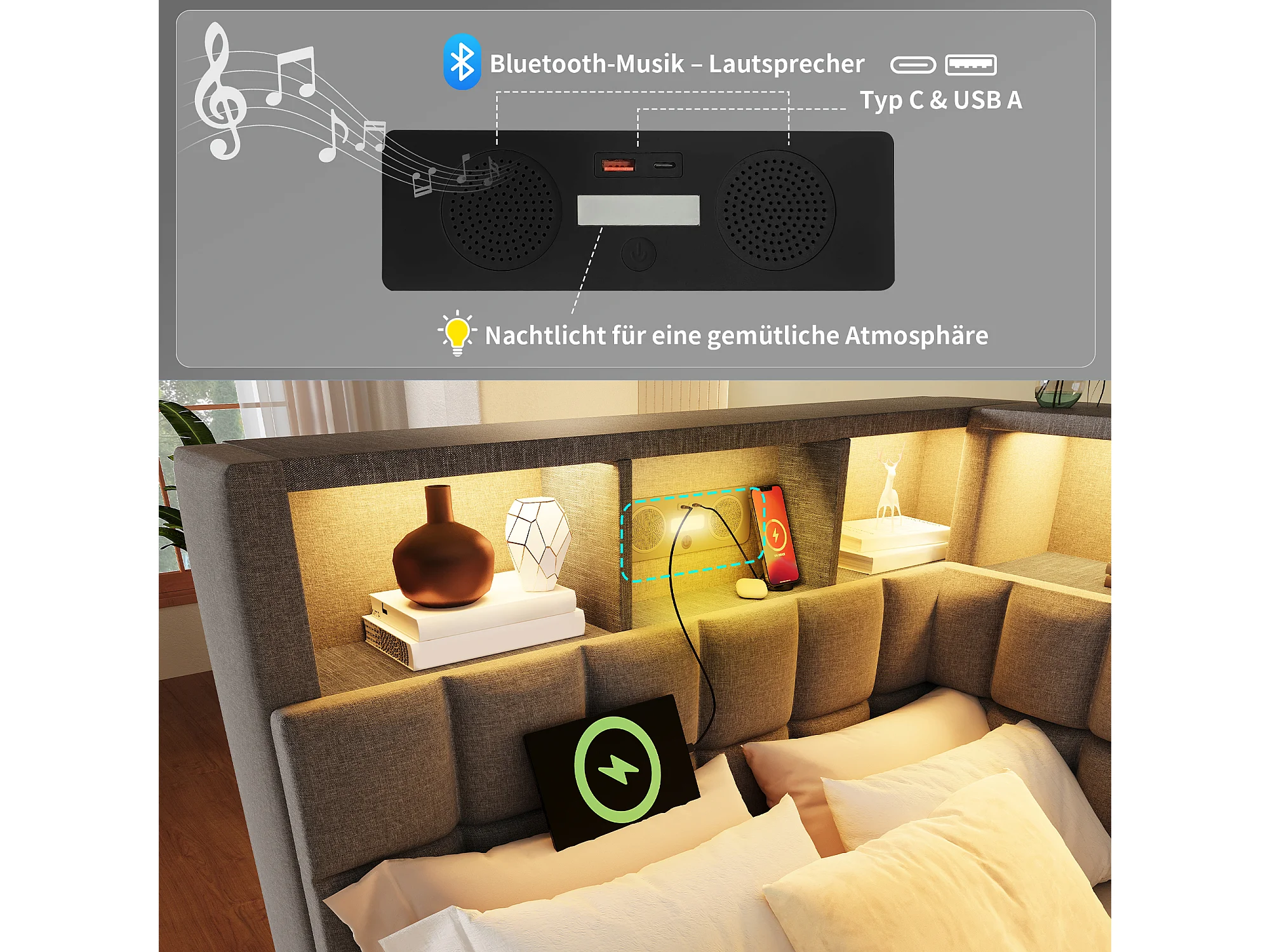 Lit rembourré moderne - 90 x 200 cm - avec Leds + station de charge + tête de lit de rangement - lin - gris