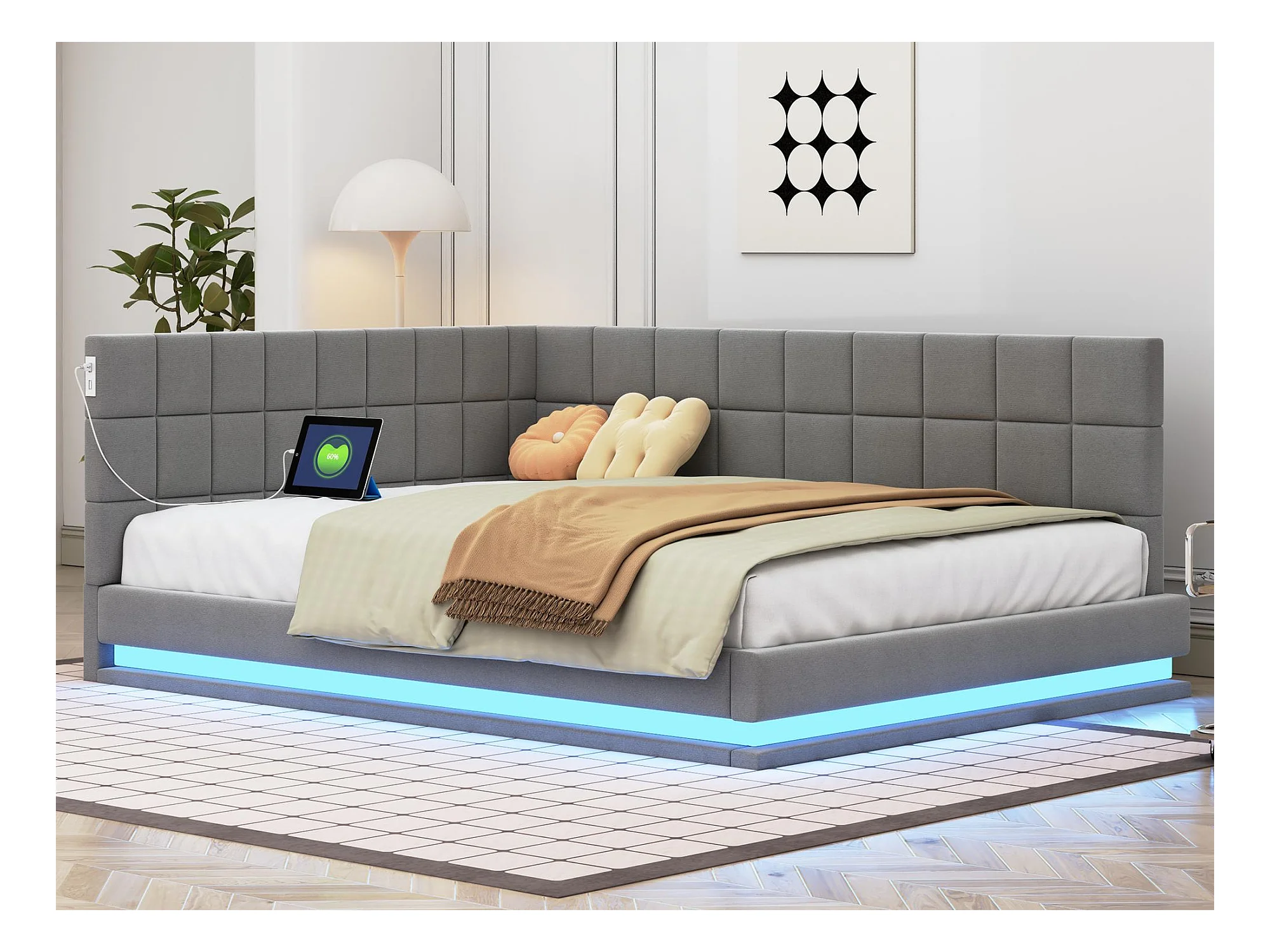 Canapé-lit rembourré gigogne - 140 x 200 cm + 90 x 190 cm - Leds et prises - avec rangements - Tissu flanelle - Gris clair