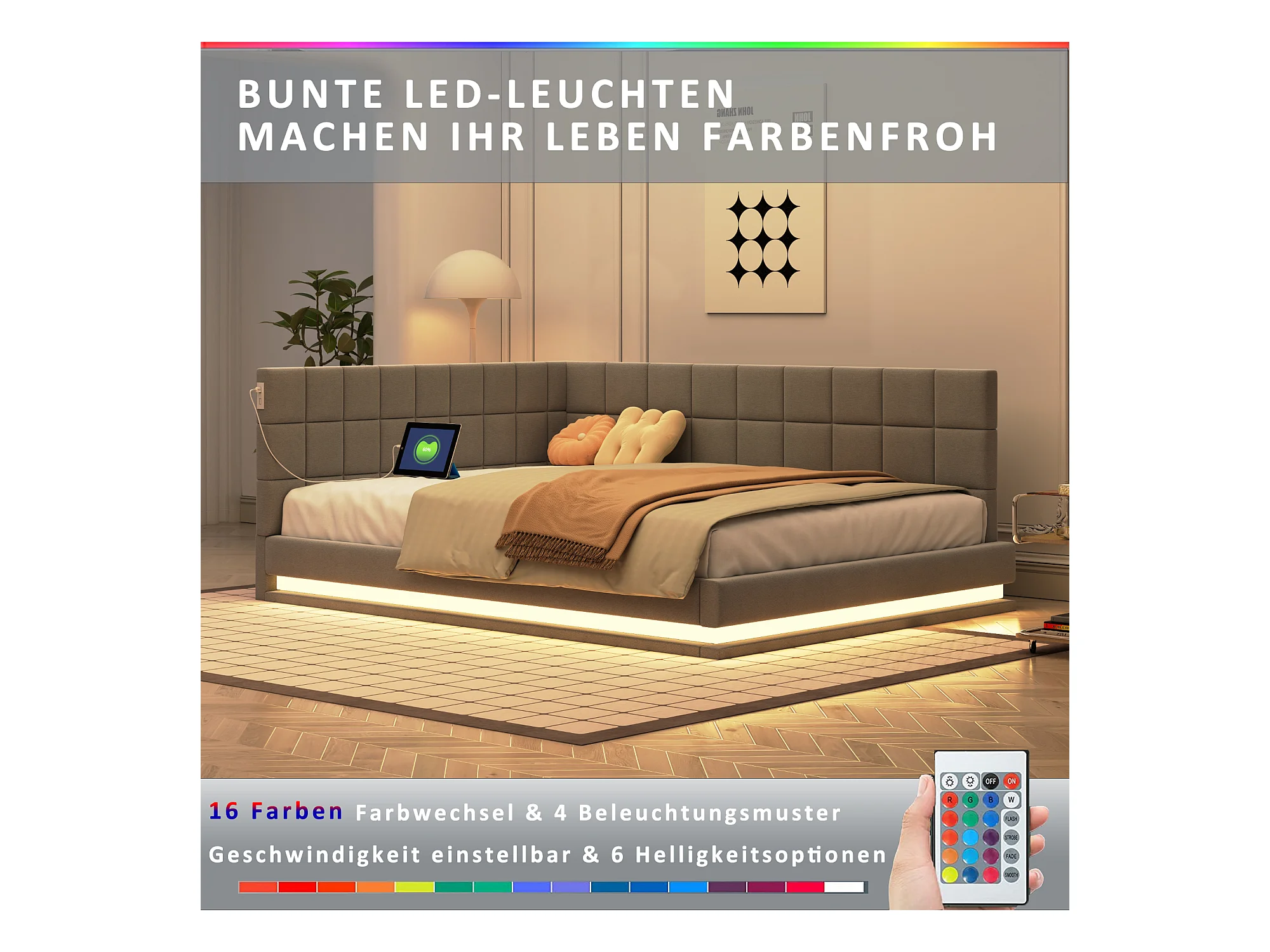 Lit banquette rembourré en velours 140x200cm - avec LED et prise USB - Gris