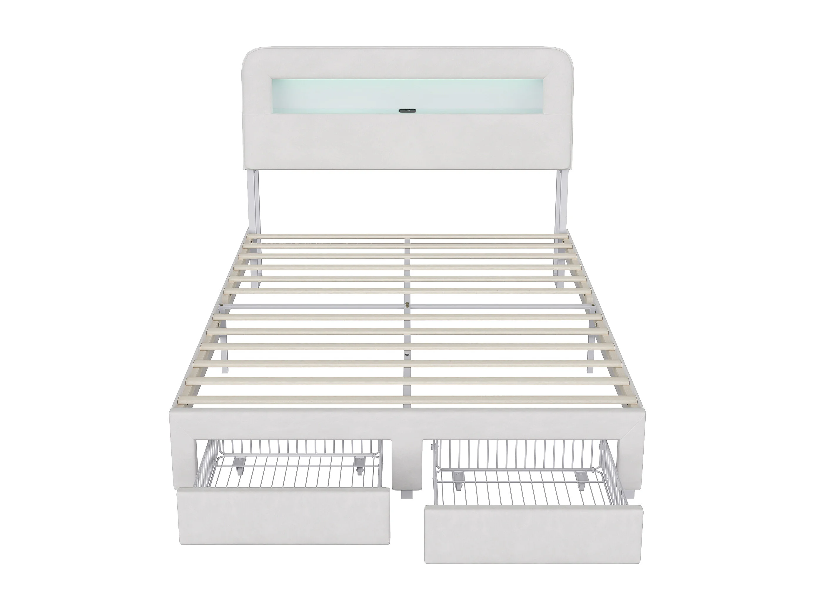 Lit Beige, Sommier 160×200, Tête de lit Rangement, Lit Double avec LED et Port de USB, Deux tiroirs