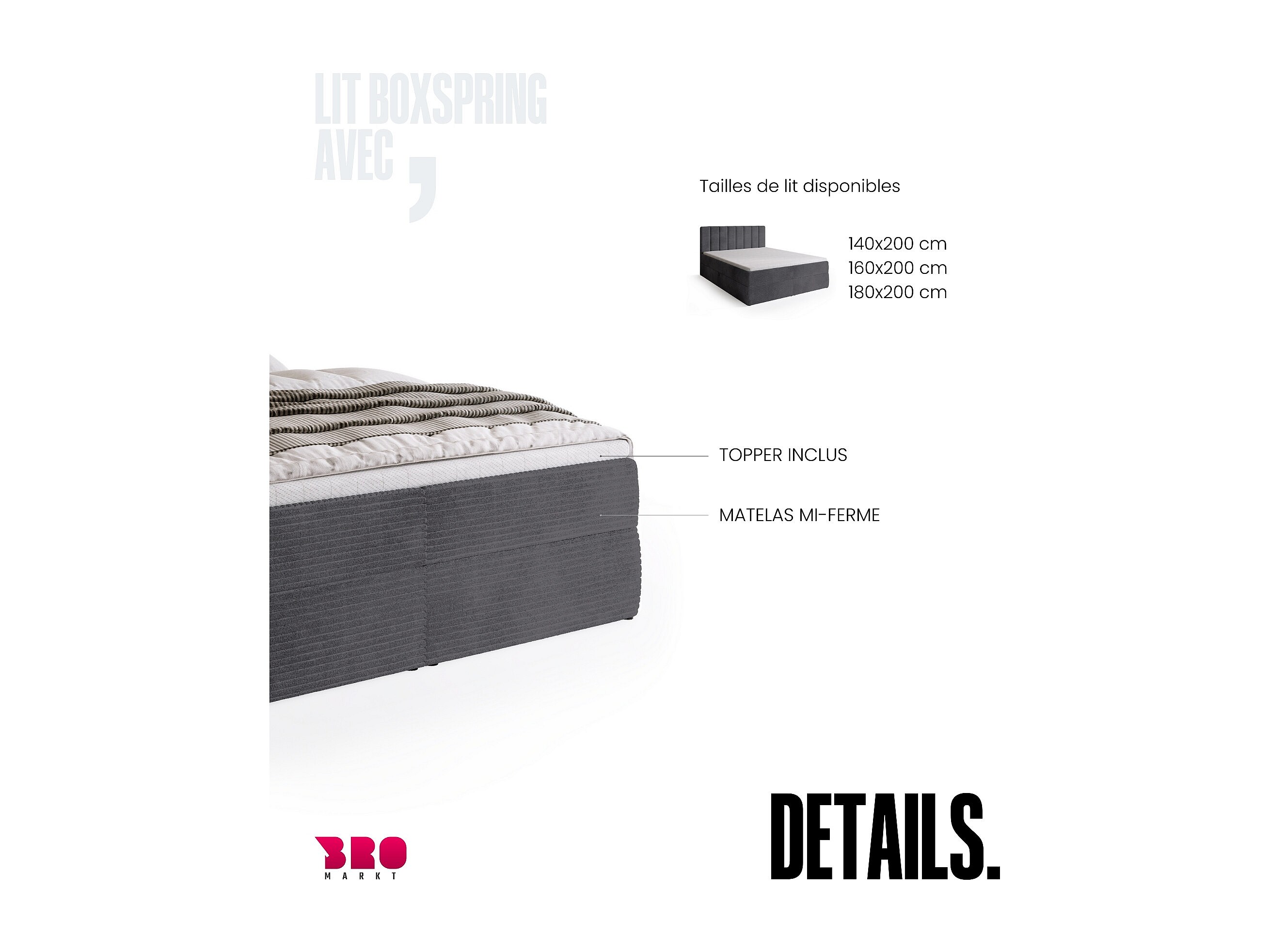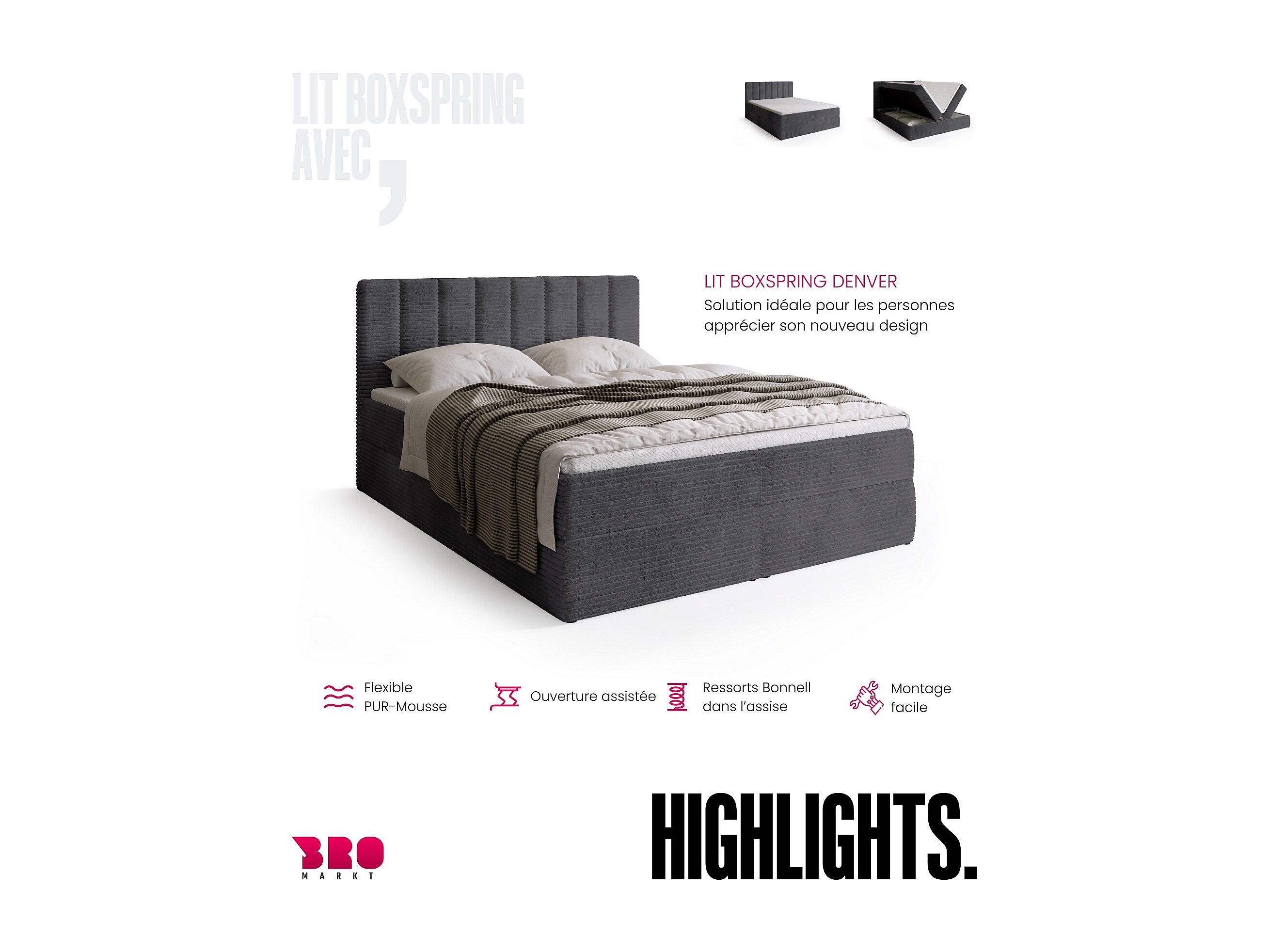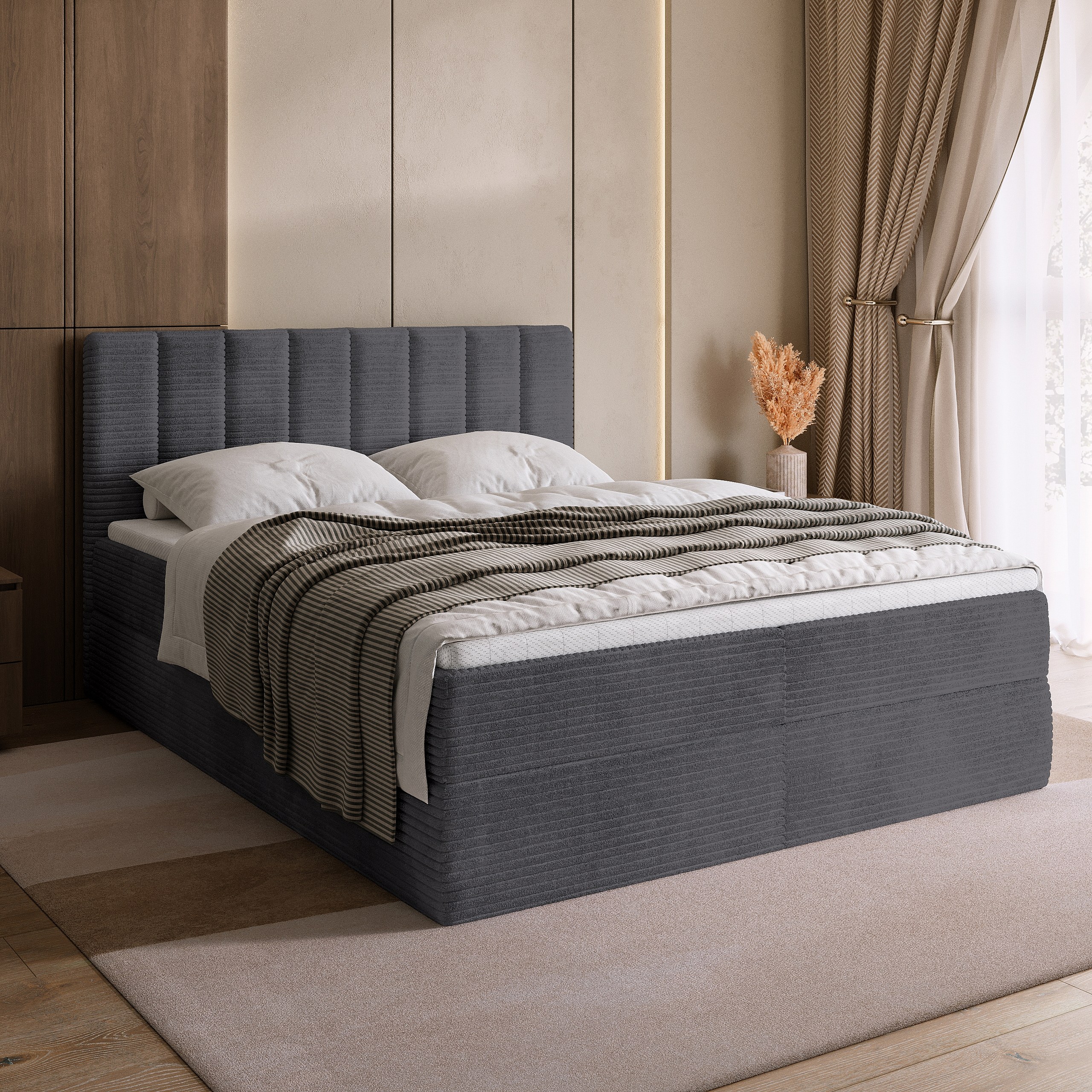Lit boxspring avec rangement DENVER - matelas - surmatelas - gris - velours côtelé - 140x200 cm
