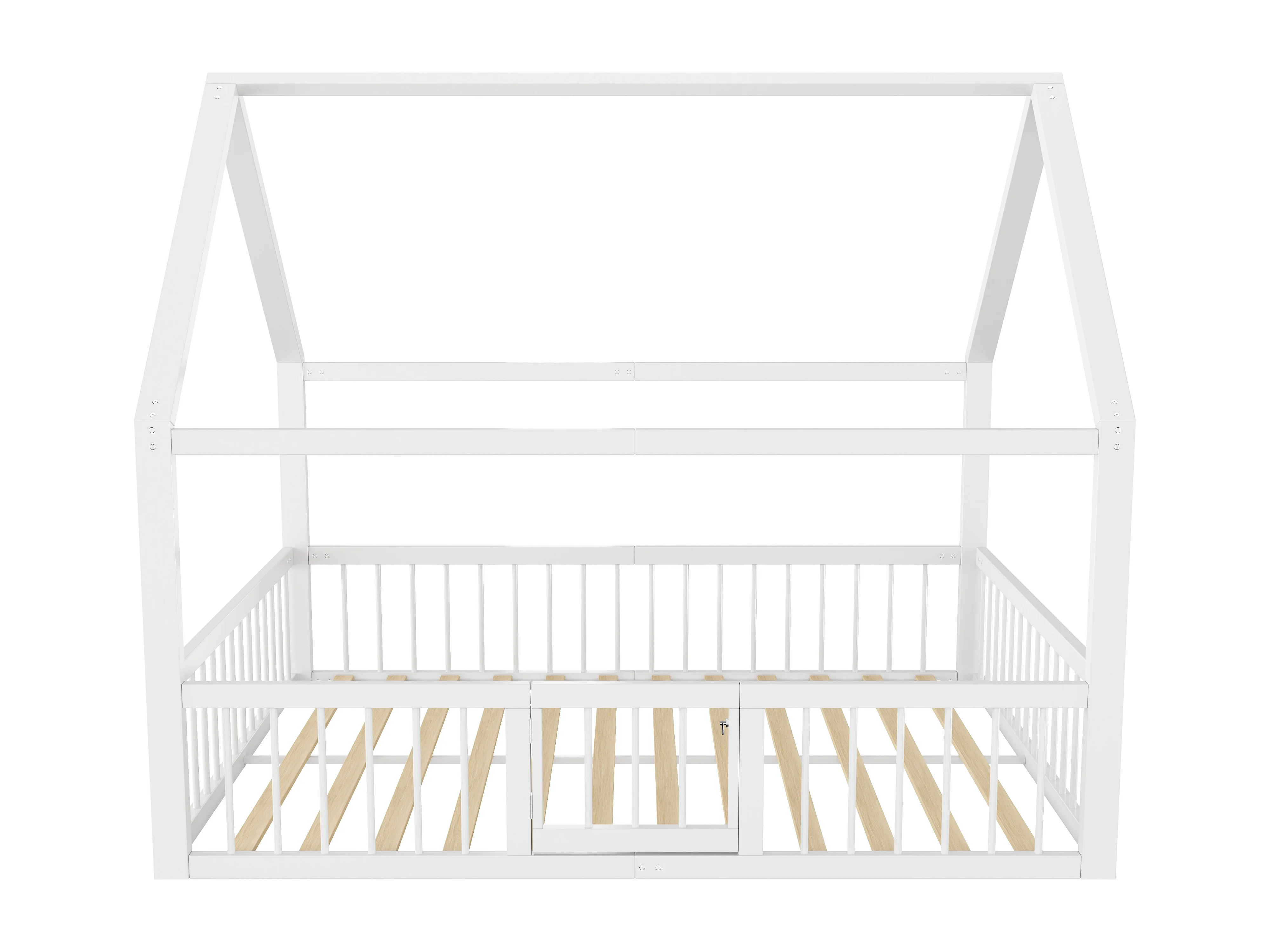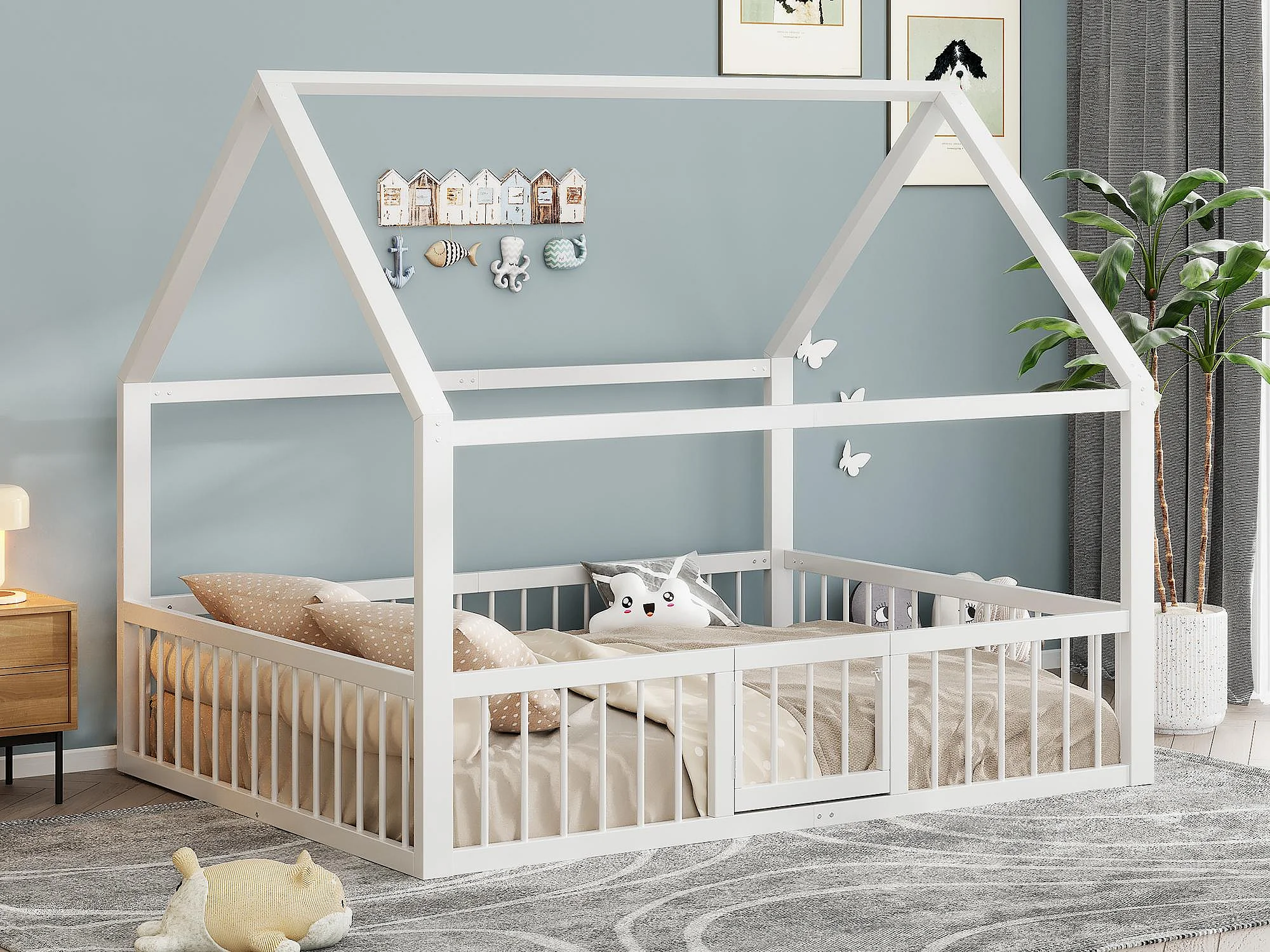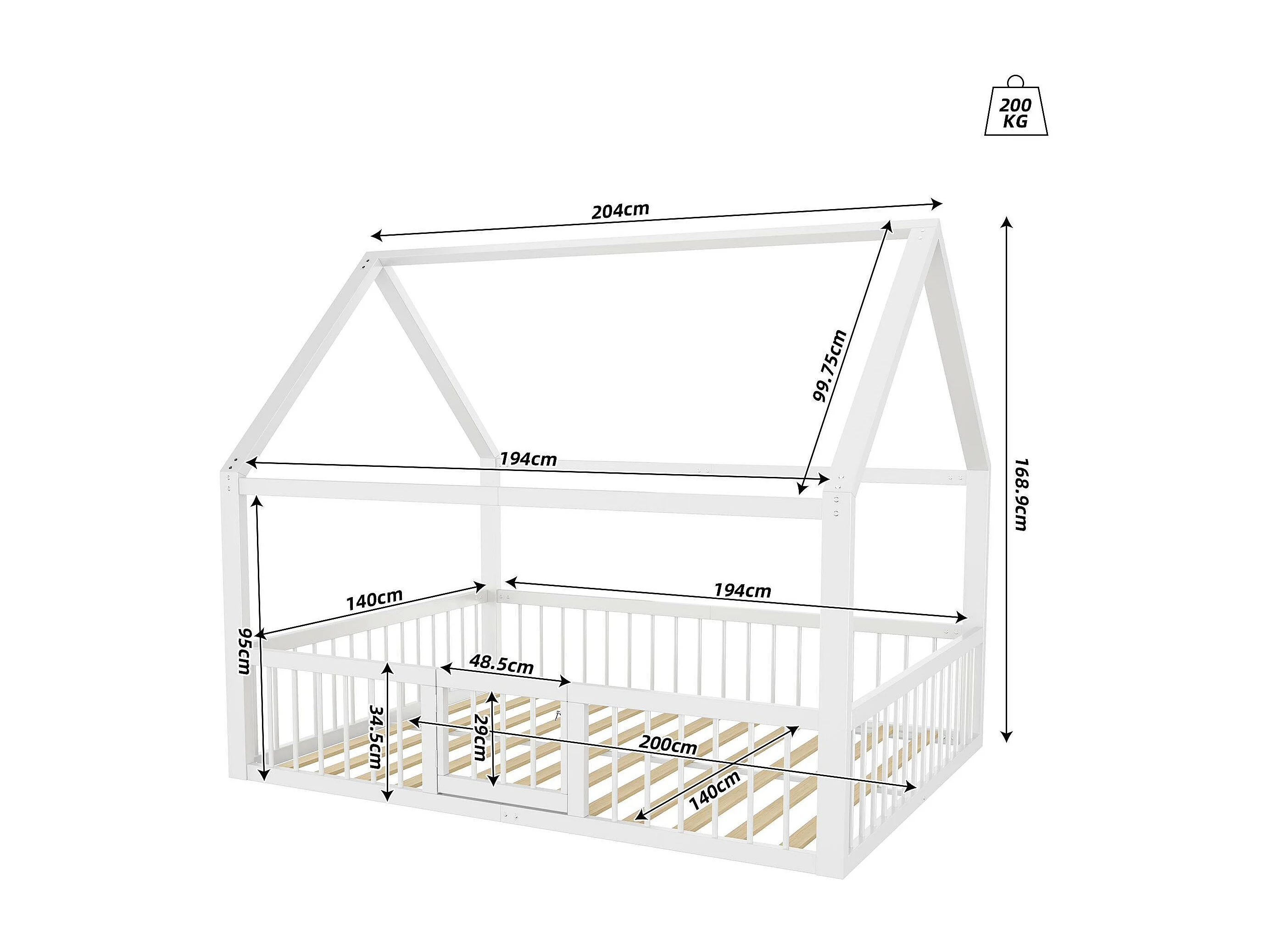 Lit cabane 140x200cm en métal - avec barrières et une porte - Blanc