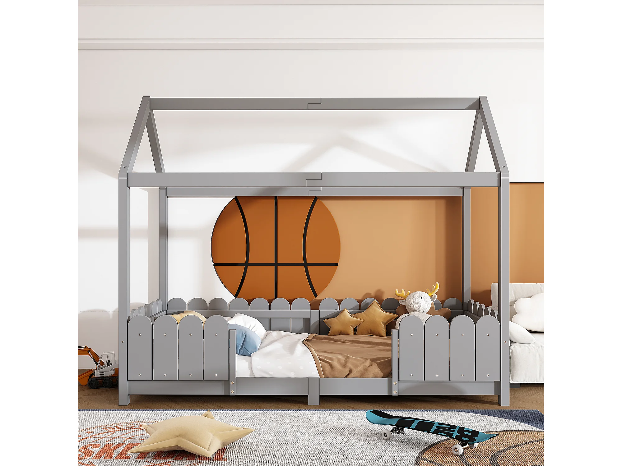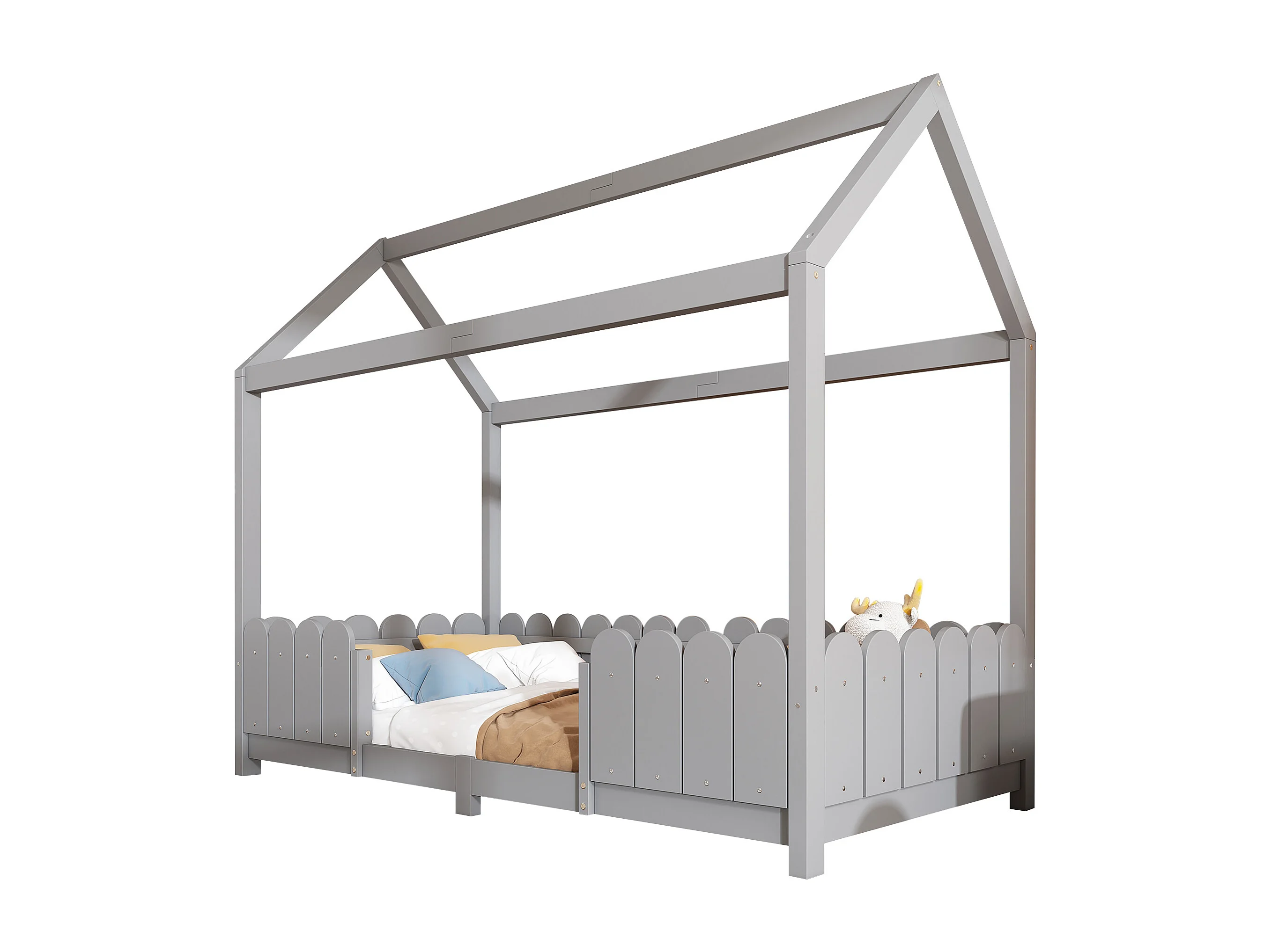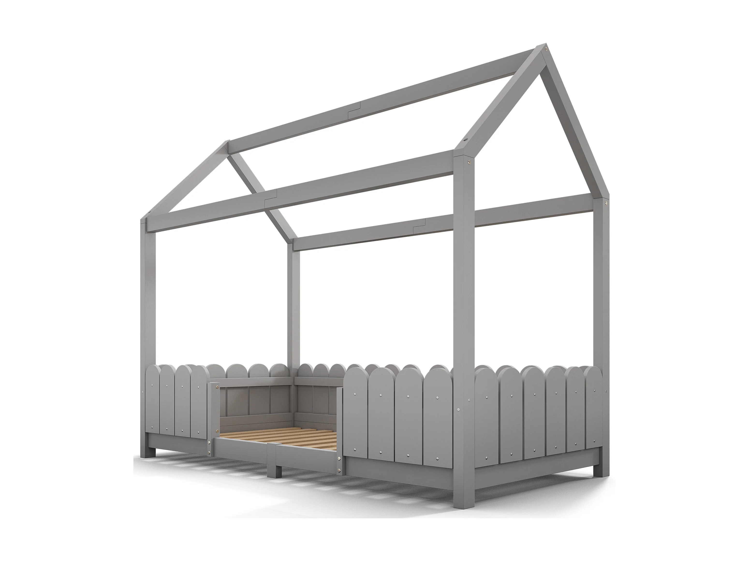 Lit cabane 90x200 cm avec protection anti-chute - sommier à lattes en bois - gris (sans matelas)